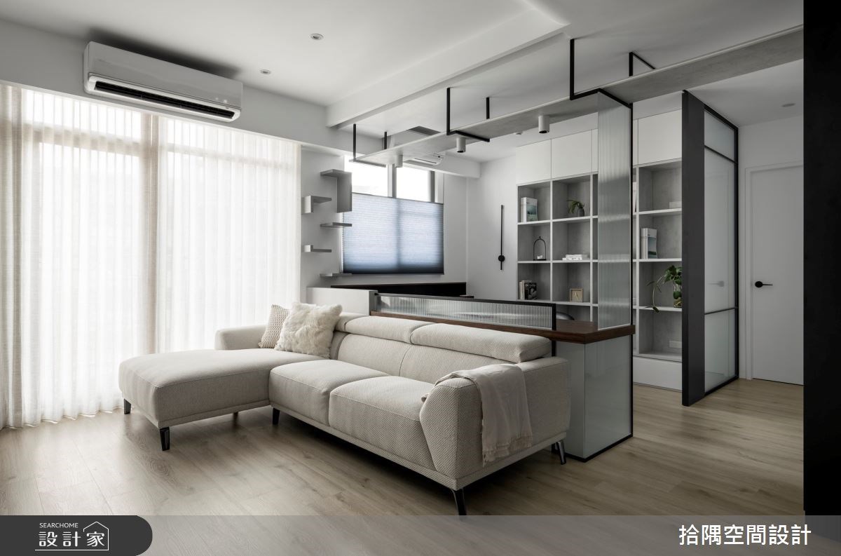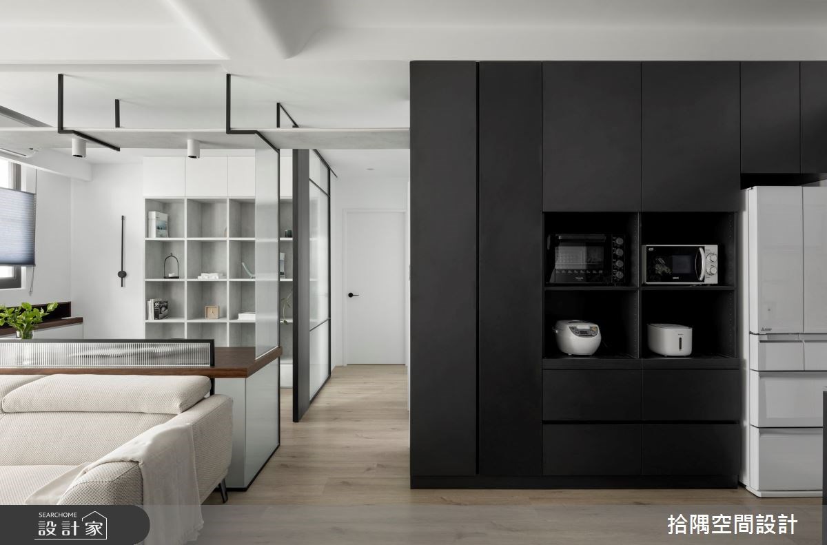总是觉得家中看起来阴暗又狭窄吗?以北欧风为主轴的16坪居家,设计师融入简约的黑白灰色彩,再透过弹性隔间设计和丰富多元的收纳,打造出宽敞的书房和大餐厨,不仅为坪数有限的小宅,争取最大的空间效益,更放大了空间的视觉感受,室内也看起来更加明亮和舒适。 玄关区立面采用深邃的湛蓝色调,在纯粹的黑灰白之间,跳出沉稳自然的色彩亮点。客厅和餐厨分别以纯白和深黑色为主题,利用色彩的对比性,给予空间景深和层次感。另外设计师也透过弧形造型包覆,化解了明显的天花梁柱,创造出连续一体的辽阔空间感。