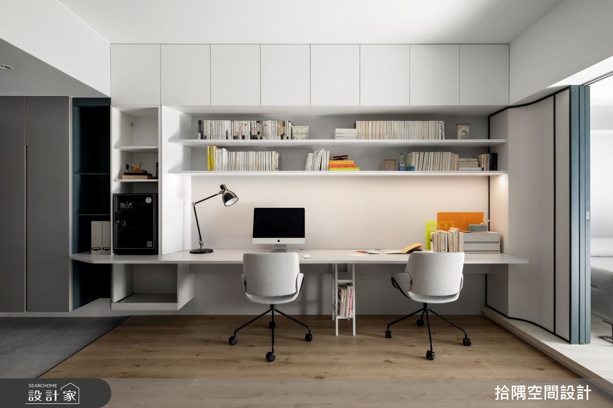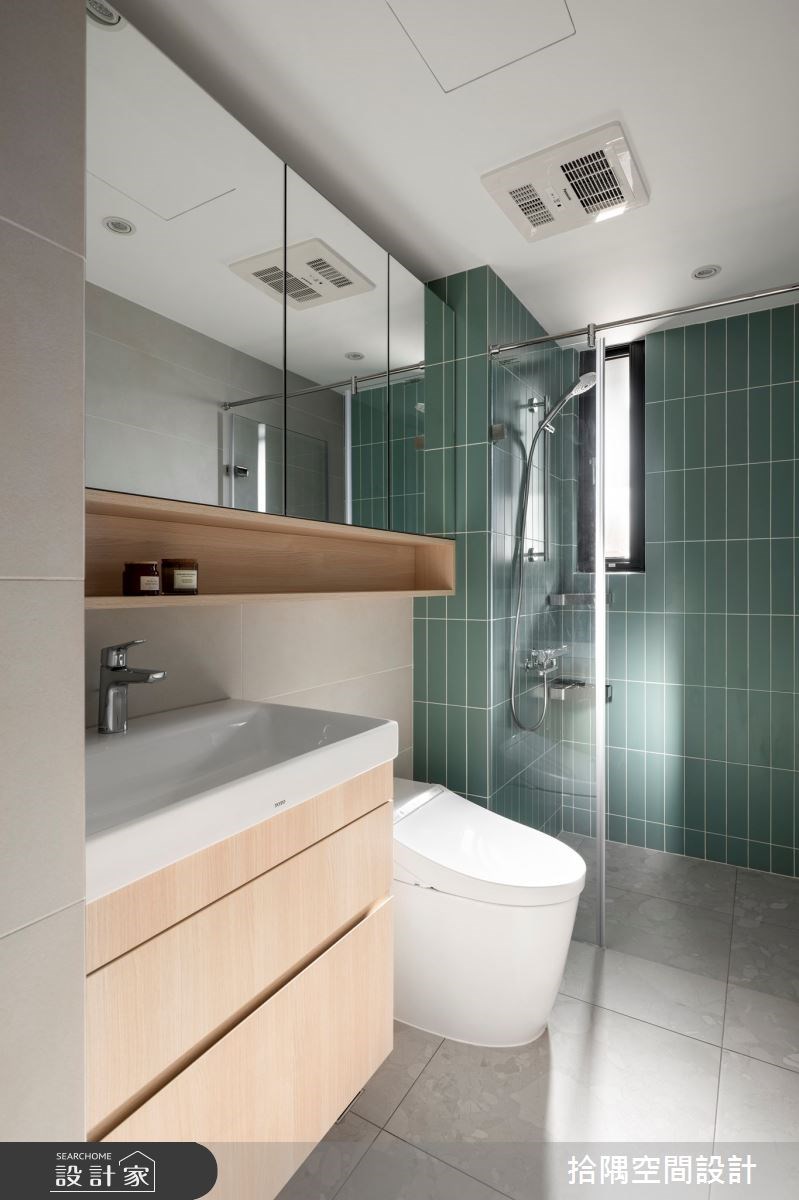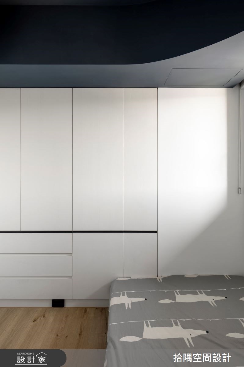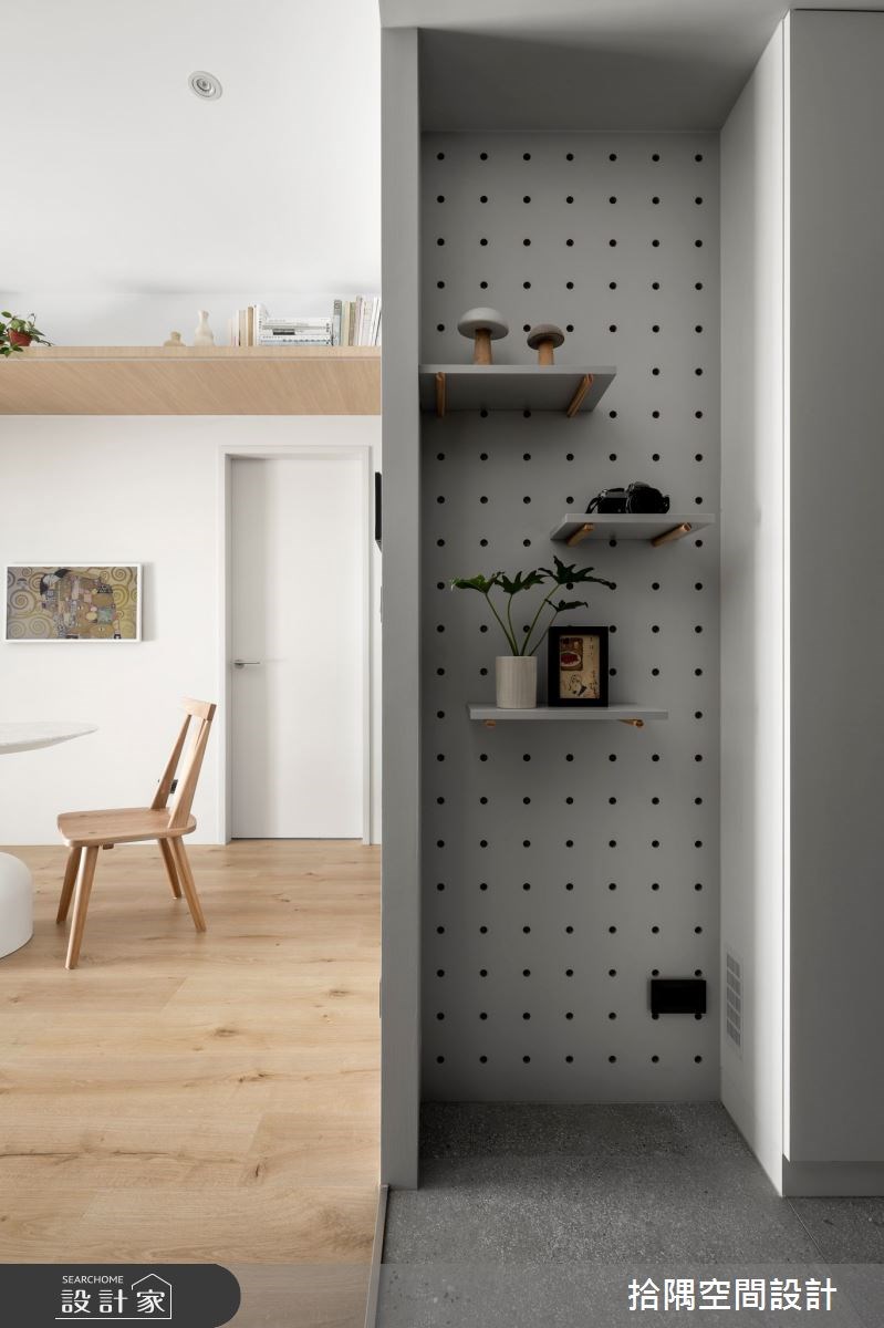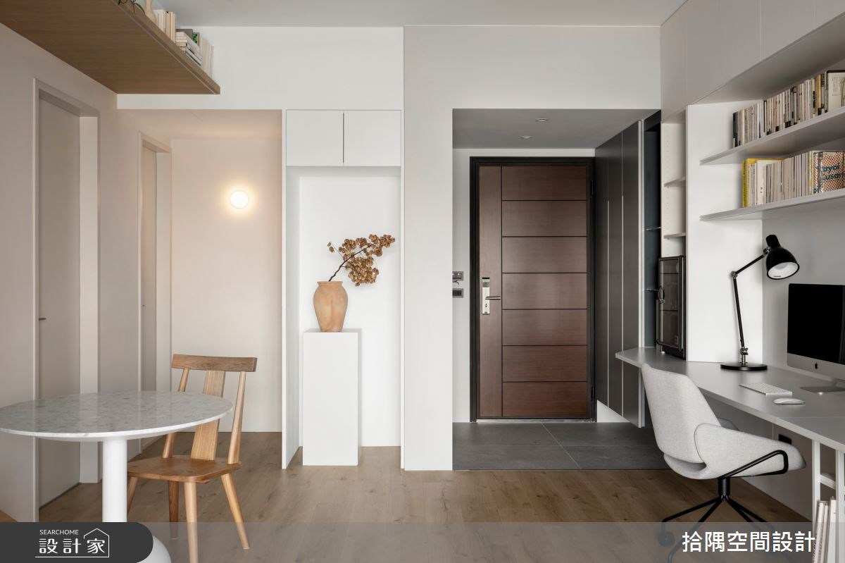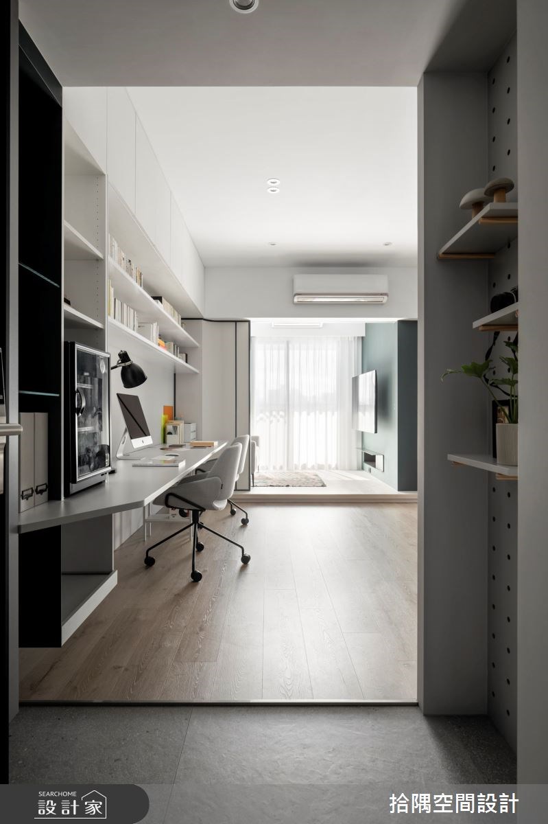 从预售屋开始规划的18坪小宅,是屋主一家人与一只爱猫的家。全室以纯白与木质打底,运用低彩度的莫兰迪绿为主色,并注入明亮采光烘托出疗癒气息。同时,为避免西晒过於扰人,在客厅、书房间,以虚实相接的拉门为屏,让屋主能自在享受美好日光。 独立的玄关铺陈浅灰石纹,除了配置柜体赋予收纳量,也运用洞洞板设计,创造随性弹性的展示空间,不管是挂上钥匙、摆放植栽/挂画都相当适合。开放式的公领域拥有宽敞视野,并将最充足的采光面留给客厅,将低饱和的莫兰迪绿注入电视墙,用绿意的自然情境渲染放松氛围,形塑光合作用般的迷人气场。 客厅、书房的场域分界,选择可移动的隔间拉门,在通透和遮蔽效果间,回避西晒的窘境之余,又让日光能延伸入里。书房空间沿着立面配置,用最精简的方式规划工作台面和收纳区,留下舒适且有弹性的後侧空间,不管是做瑜伽还是放空小憩都相当适合。 主卧延续低彩度的调性,立面对齐腰线一分为二,融合浅灰与纯白的中性色彩,顶上过渡的大梁运用圆弧线条修饰,并刷上深色漆料,对应坐落底部的大篇幅纯白柜体,形塑独一无二的对比美感。 小编的最爱 书房、餐厅没有明显的实墙界线,但是透过浅灰、纯白与奶茶色的布划,创造趣味性十足的隐形分野,以及具有丰富层次的居家场景。此外,餐厅上方特意延伸木质天花板,并以俐落的光带妆点,增添一个展示收纳的绝佳区域。
