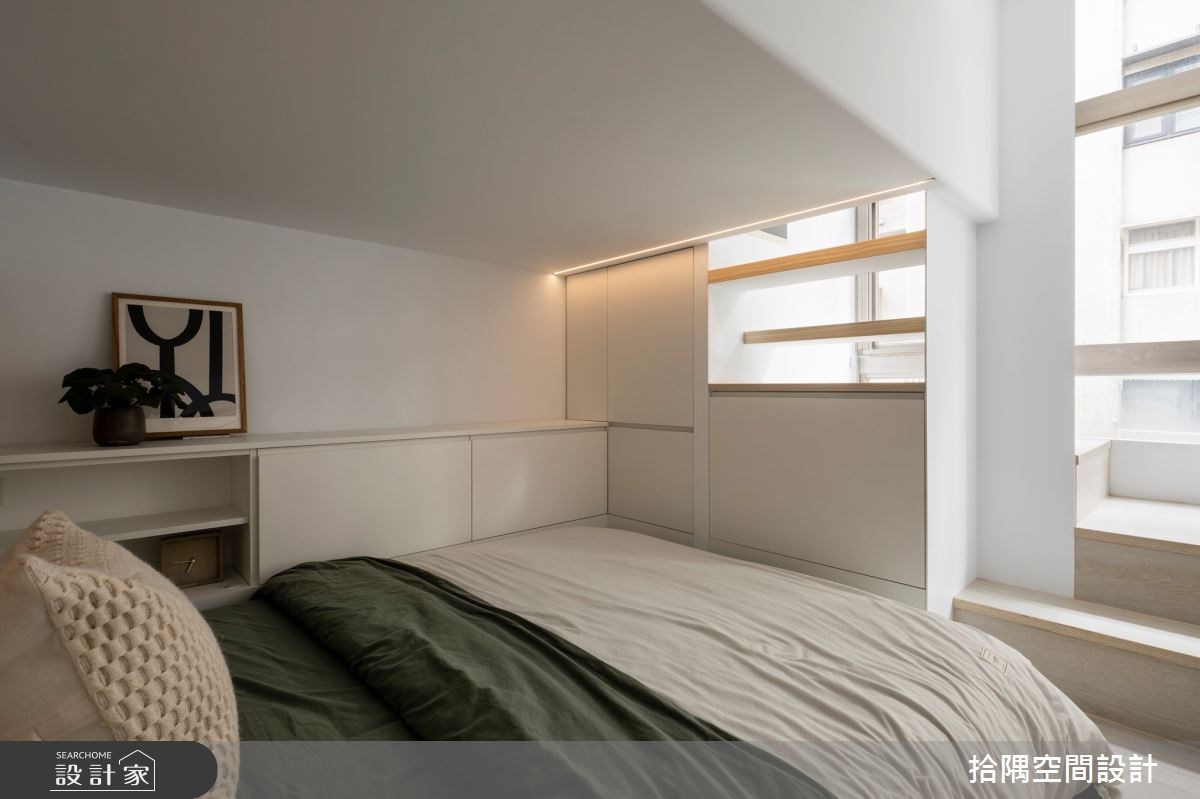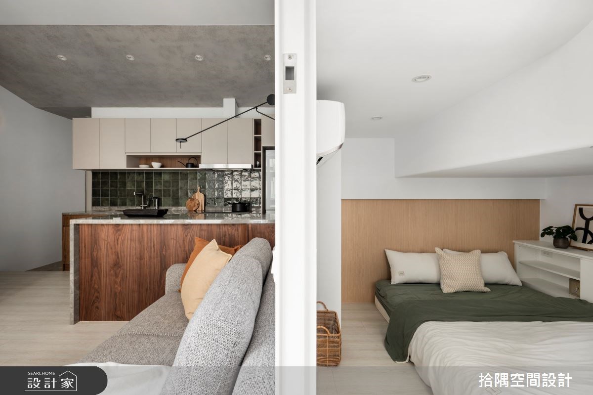 由老屋翻新的 13 坪简约风单身宅,不仅有着超大的中岛厨房,设计师更以复层式的设计,结合卧室和更衣收纳空间,让空间机能超展开!在风格表现上则融入木质色调、灰阶和纯白,洋溢着温润自然的生活氛围,即便在有限的坪数条件下,也能完美达成质感和机能之间的甜蜜平衡点! 由门口进入,玄关区透过地坪的材质和高度落差,划分出独立的落尘区,随着天花板的斜度抬升,打开公领域视野的开阔感受。不做满的半身高电视墙,保留了空间的通透感,并利用立面的视觉延展,化解空间结构量体的压迫感。 一字型厨房座落於室内的底端,外部加入中岛区成为收纳、备餐、轻食的扩充领域,并成为客厅和餐厨的自然分野,外表覆上温润浓郁的木纹理,搭衬墨绿色的砖体和柔润明亮的米色门片,成为富有生活温度的一方端景。 小编的最爱 为了满足充裕的收纳使用,设计师透过上下分层设计,同时打造出下方卧室和上层的更衣收纳区,而串连上下的梯阶,则藉由适度的穿透和隐蔽比例,使睡眠区得以同时拥有舒适的隐私和开放感受。