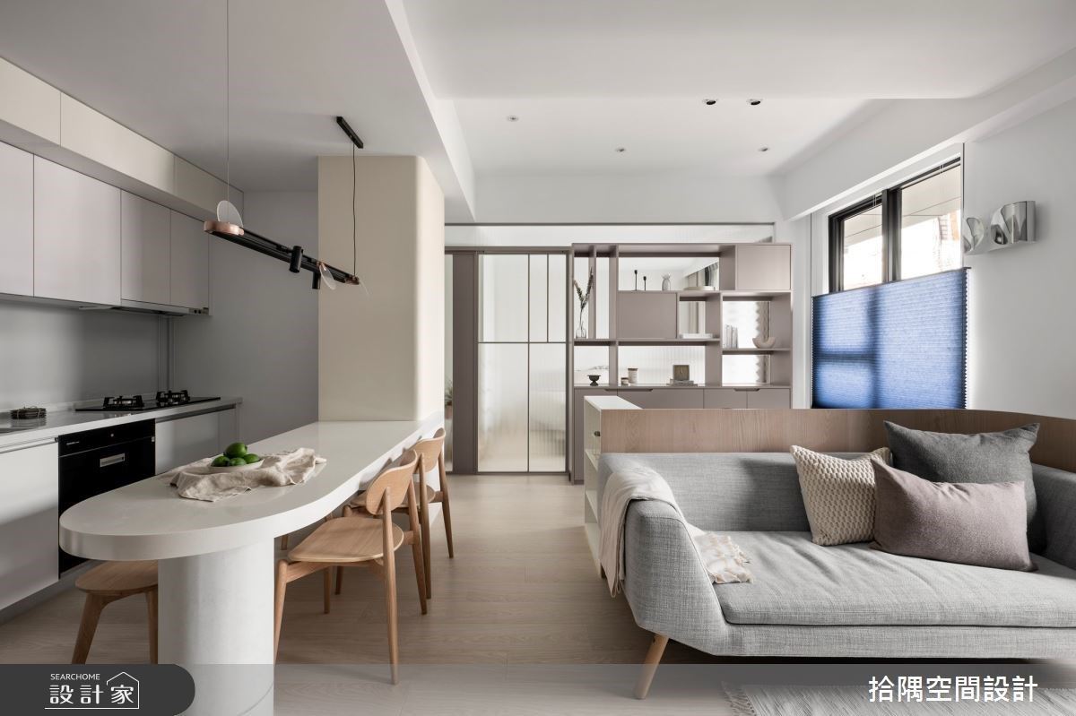 整室先透过中性浅色调作为主轴,注入轻盈氛围,搭配充沛的采光,开放设计格局,无限放大小坪数空间感。客厅、厨房之间,增添中岛吧台,作为餐桌机能同时扩充厨房料理范围,沿墙面顺势延伸的中岛台面,平行於空间中的主要走道,梳理出整齐简练的生活动线。