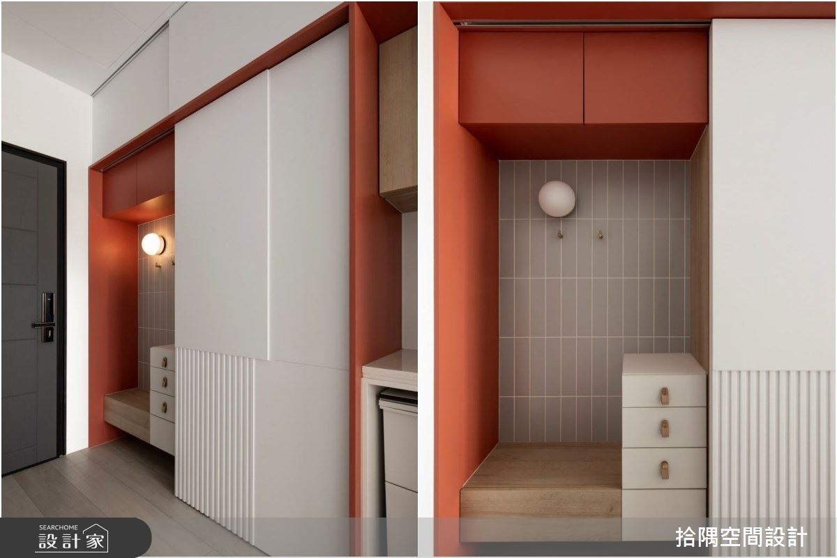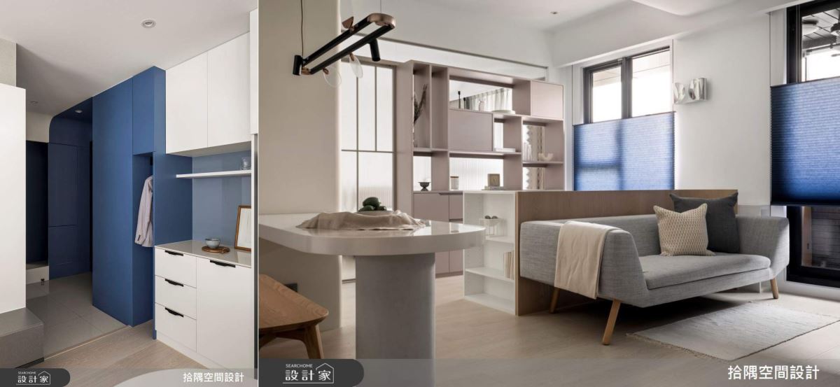 沙发後方安排一道半高矮墙,分野出开放的书桌领域,并在书桌侧边增添收纳机能,具展示布置效果,同时扩充室内的收纳容量。进门玄关处,也利用部分开放、部分独立的收纳巧思,创造顺手挂放衣物的小巧空间,带来实用的生活机能。