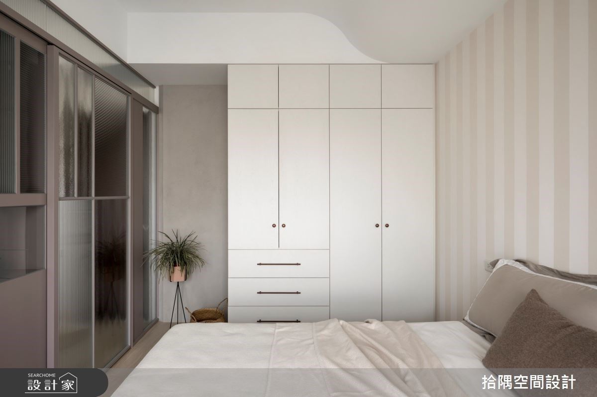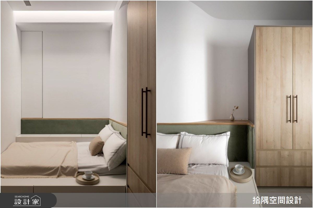 书房旁的灰玻拉门推开,即为卧房私领域。架高的卧铺设计、墙边的大型衣柜,让卧室收纳空间倍增,并从略为凸出於床头的衣柜角落设计半墙跳色墙,创造温馨、有型又具睡眠隐私的生活感。