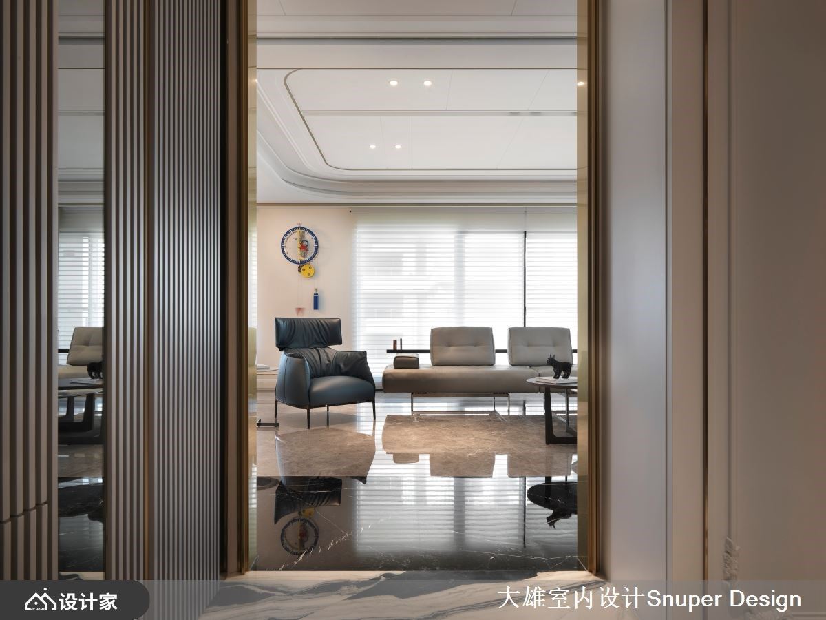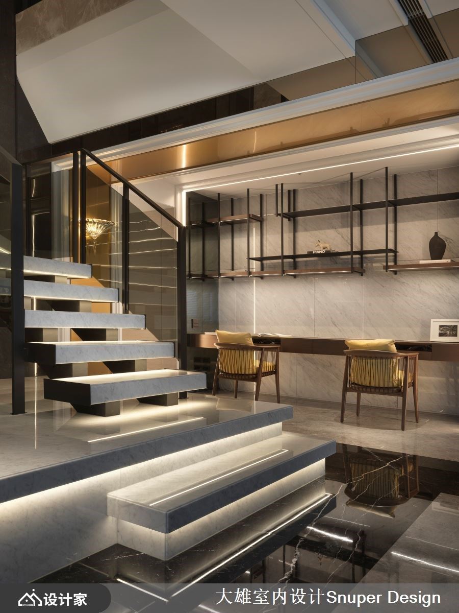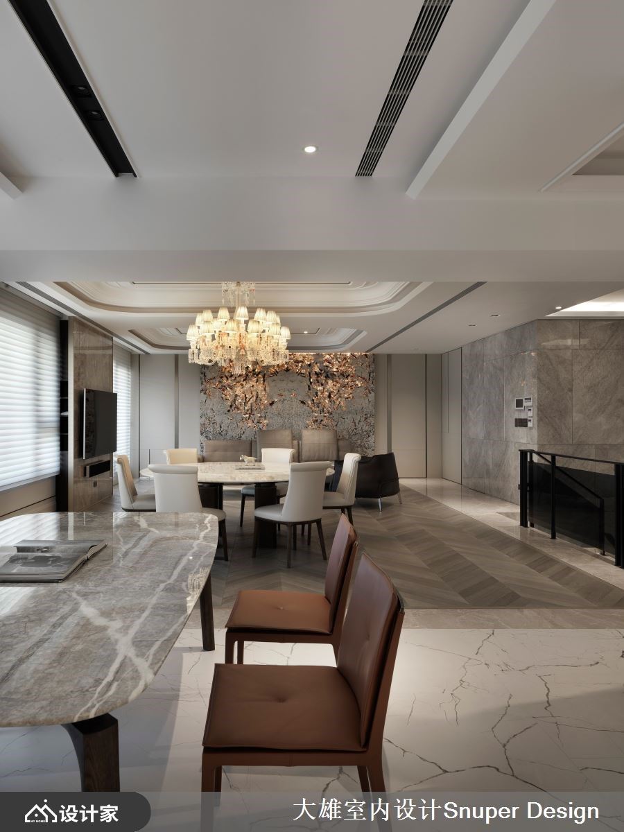 有别于大雄设计以往的色彩基调,本案以明亮清爽作为诉求,铺叙浅色奢石于电视牆立面以及入门玄关地坪处,佐以镀钛金属描摹俐落框线,形塑优雅奢华的居宅第一印象。 缓缓步入公领域,将一楼定义为亲友来访时的宴客厅区,以开放式设计延长视觉轴线,地坪材质选择沉稳黑与灰色大理石相互交织,形塑有如地毯造型般的轮廓,上方圆弧天花与活动式家具,则明确了客厅与中岛餐厅区域之分野。