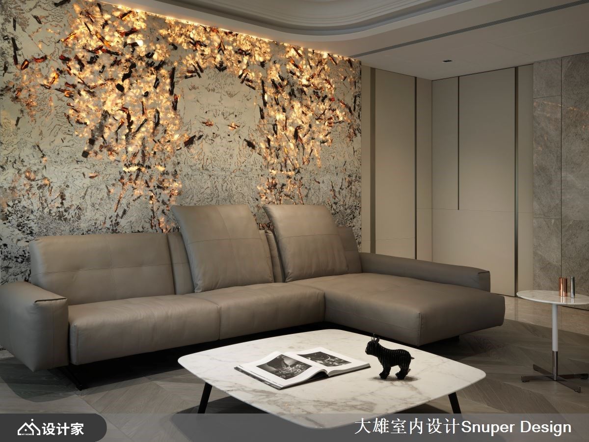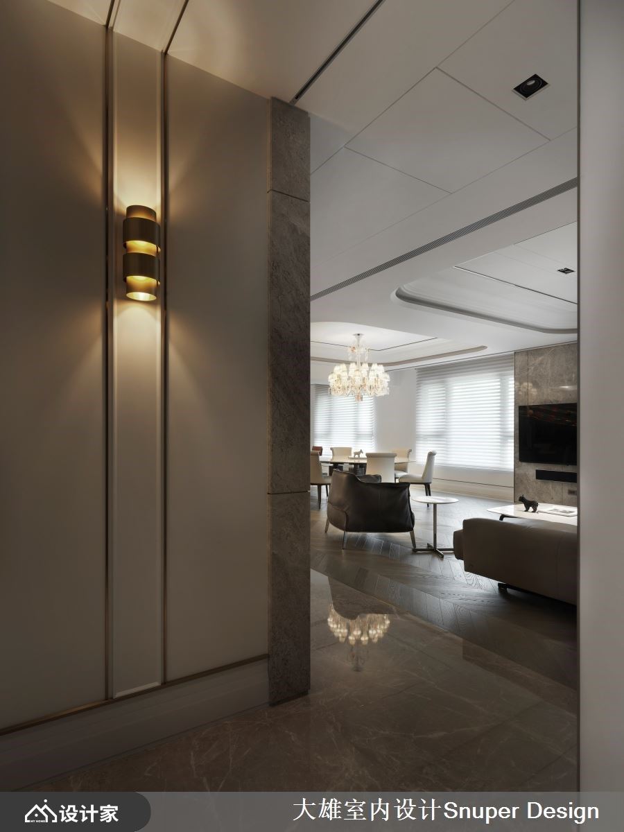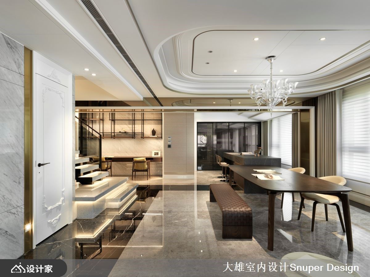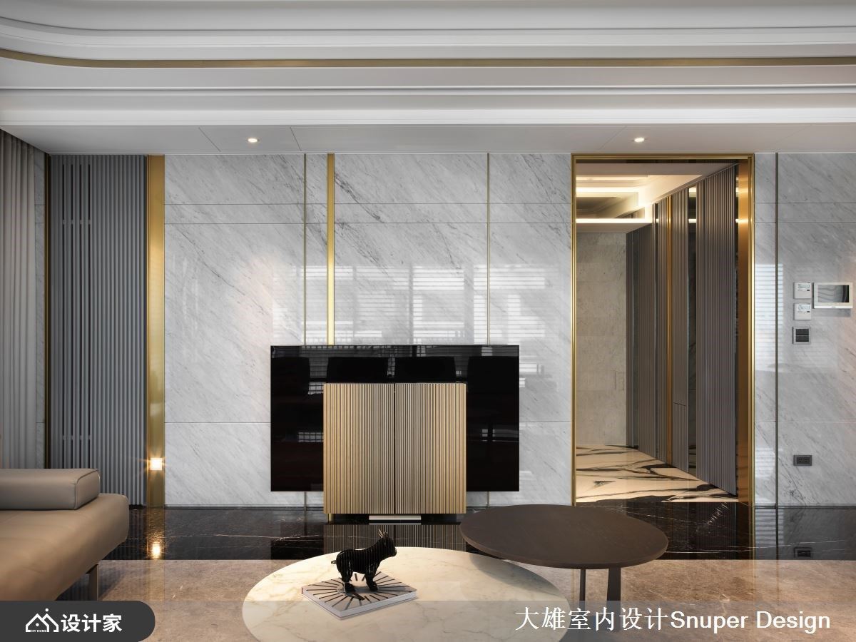 有别于大雄设计以往的色彩基调,本案以明亮清爽作为诉求,铺叙浅色奢石于电视牆立面以及入门玄关地坪处,佐以镀钛金属描摹俐落框线,形塑优雅奢华的居宅第一印象。 缓缓步入公领域,将一楼定义为亲友来访时的宴客厅区,以开放式设计延长视觉轴线,地坪材质选择沉稳黑与灰色大理石相互交织,形塑有如地毯造型般的轮廓,上方圆弧天花与活动式家具,则明确了客厅与中岛餐厅区域之分野。