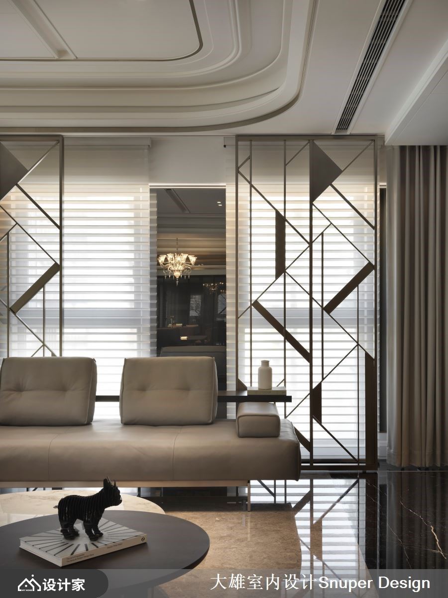 厅区摆设大尺度宴客沙发,临窗处设置屏风,增加室内空间的隐密性,而错落有致的镂空铁件造型,更形塑入室后的目光聚焦处,更与后方樑柱的灰镜相互呼应。