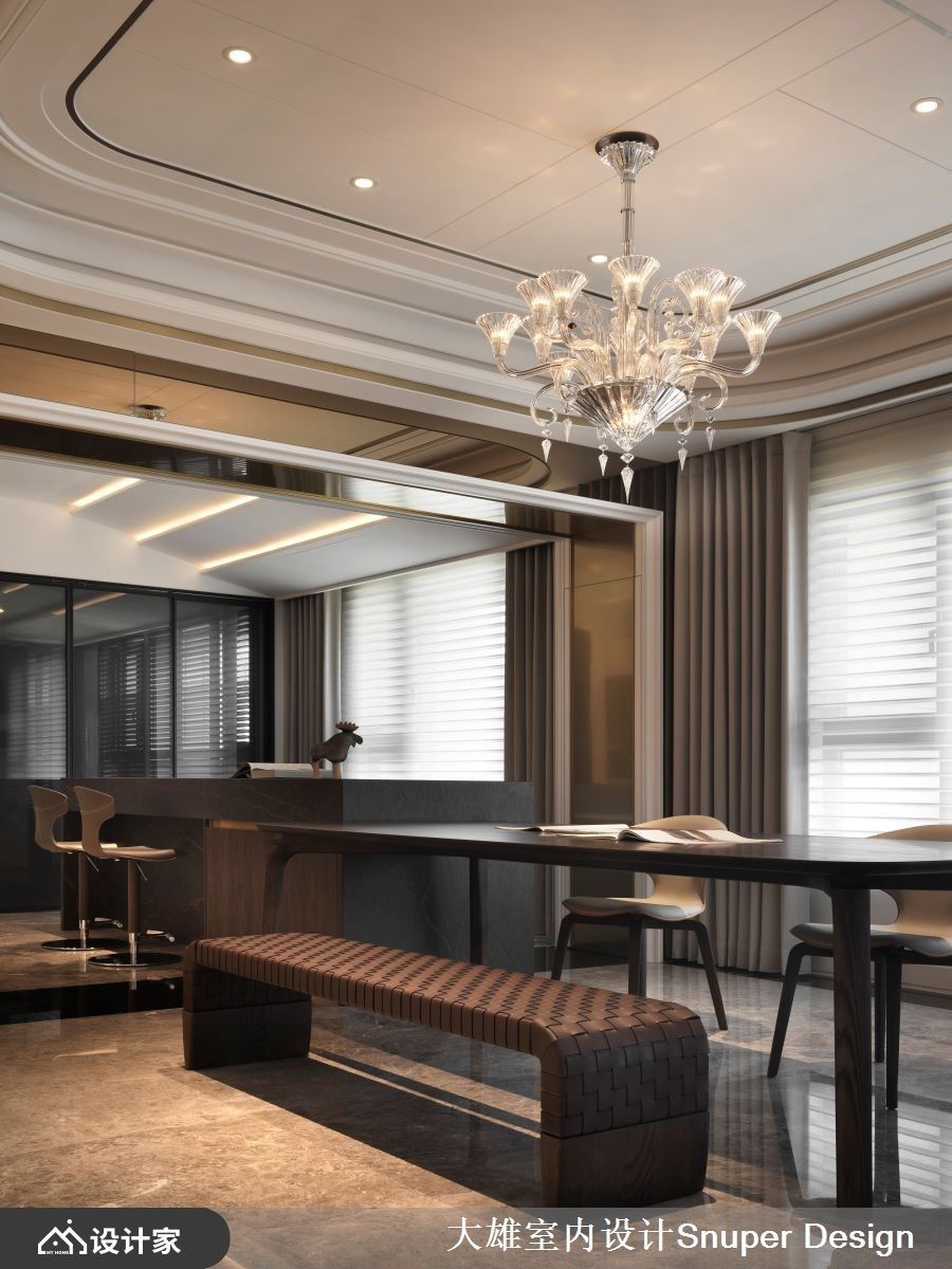 无论是亲友来访用餐,亦或是三五好友小酌欢聚,皆需要有开阔舒适的中岛吧台才能尽兴而归!首先将中岛与餐桌机能整併为一,打造充裕的用餐檯面,一盏细腻古典的造型吊灯则为聚会时光烘托气氛,其次为了消弭压迫樑柱的存在,铺贴镀钛金属延伸开阔视觉,更于无形中裱匡居家端景,每隅皆酝酿饶富趣味的空间样貌。