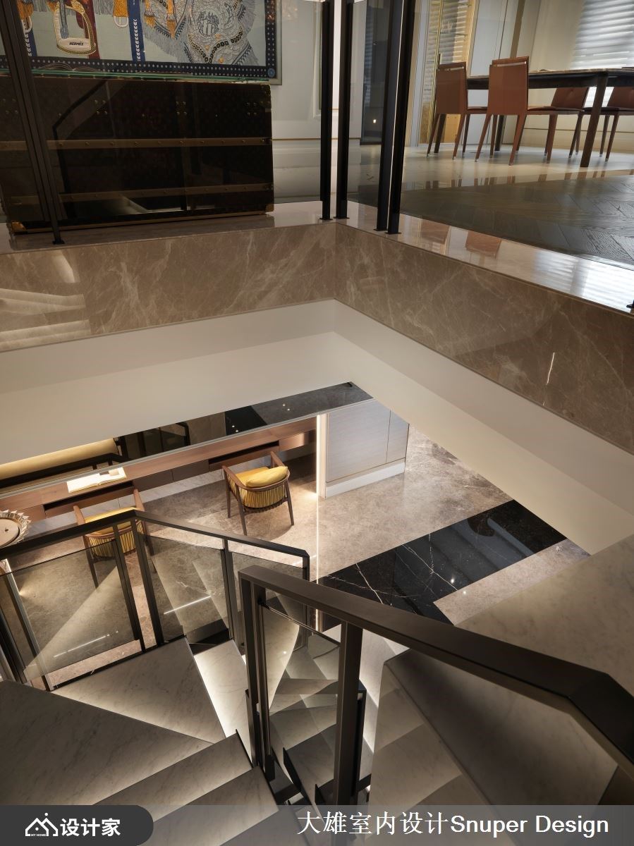 拾梯而上,以轻浅白的细腻大理石纹作为基底,显化黑色喷砂扶手的俐落感,大面背牆选用义大利石材与镜面金属,并悬挂新古典风格的水晶吊灯,形塑风格元素上的对话与对望,更一展複层空间的高挑姿态,而每层梯间皆内嵌线性间接光源,犹如行走于奢华古典的艺术迴廊。