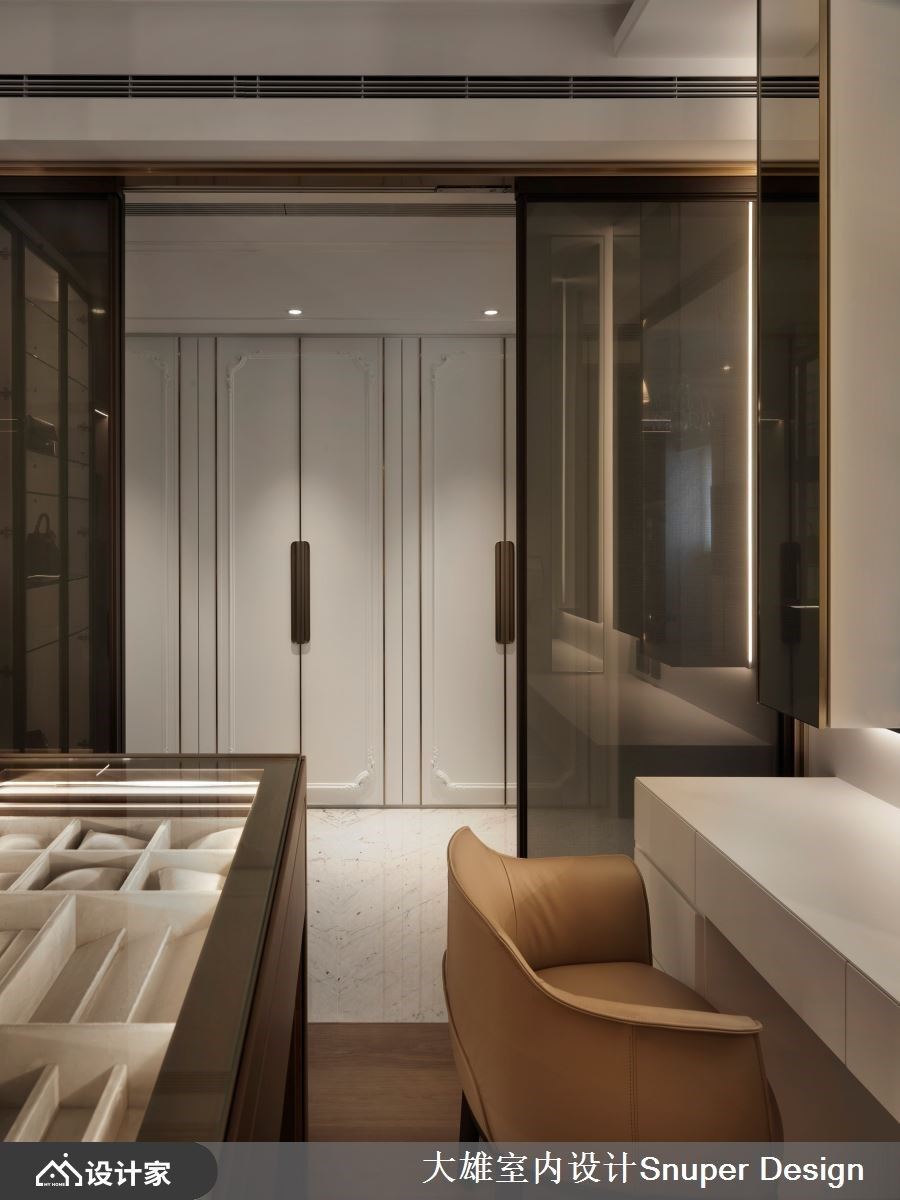 为了缔造沉稳静谧的神秘感,主卧房规划双开门廊道与转折空间,循序渐进地奠定走入私领域的疗癒感,同时配置精美的双更衣间,供男女屋主拥有独立且专属的着衣打扮空间;主卫浴的双面盆设计,选用居者喜爱的金黄色洗手盆,并以金色的五金元素作为呼应,打造奢华典雅的沐浴氛围。