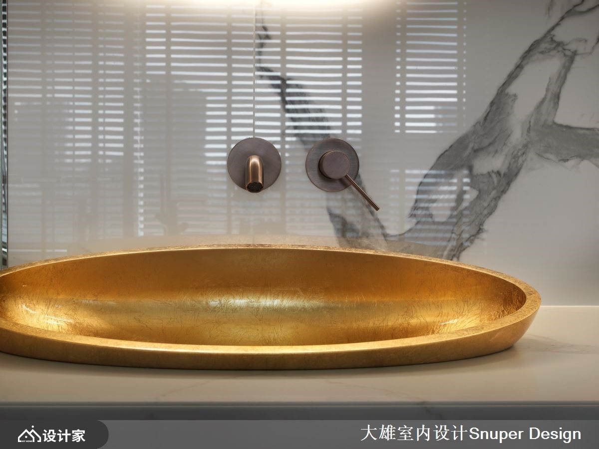 主卫浴的双面盆设计,选用居者喜爱的金黄色洗手盆,并以金色的五金元素作为呼应,打造奢华典雅的沐浴氛围。