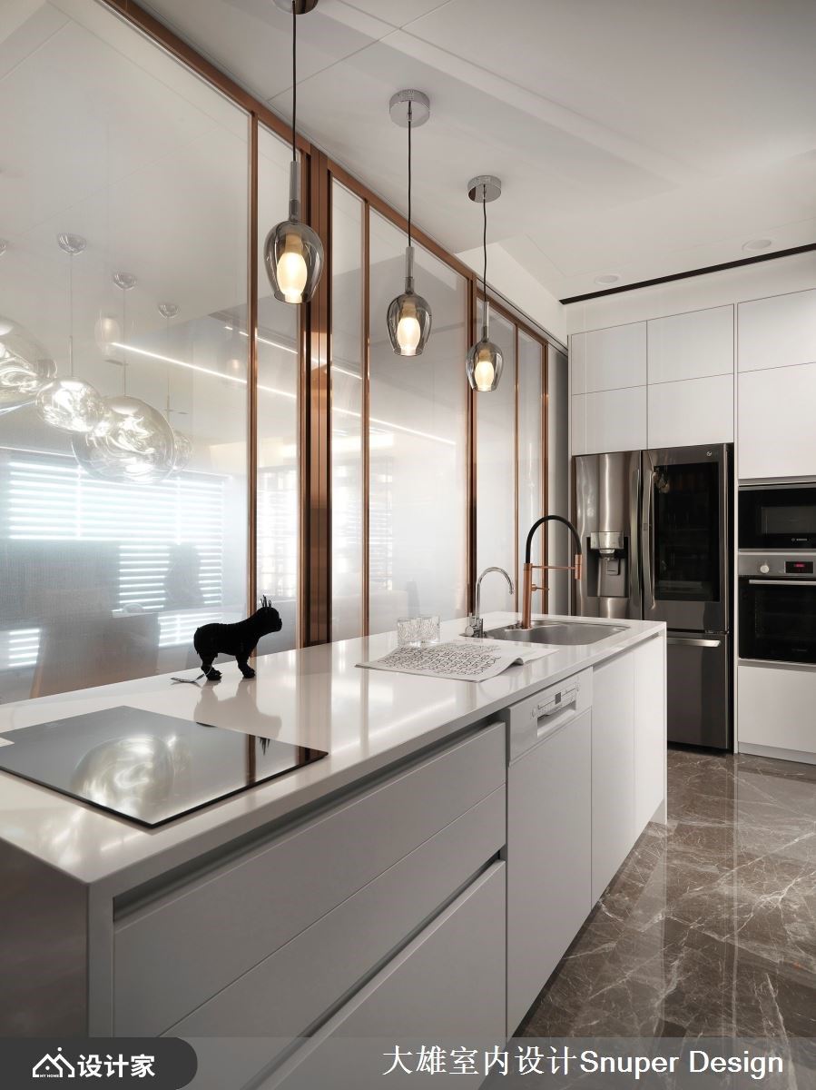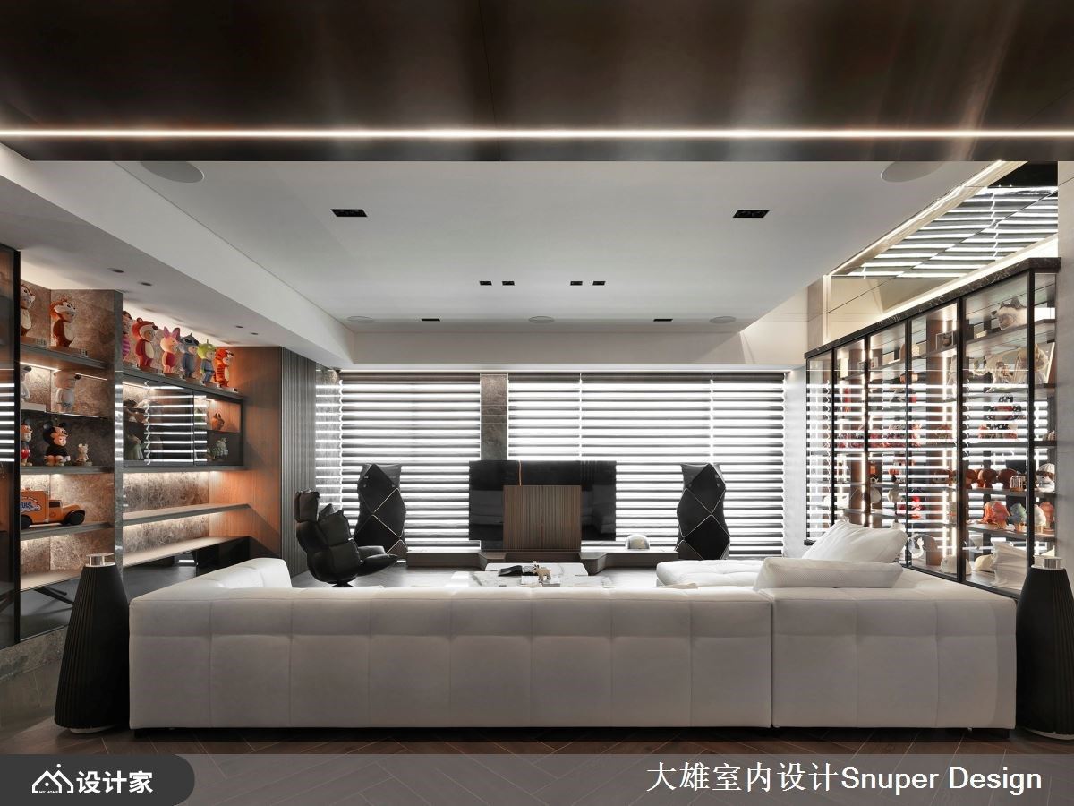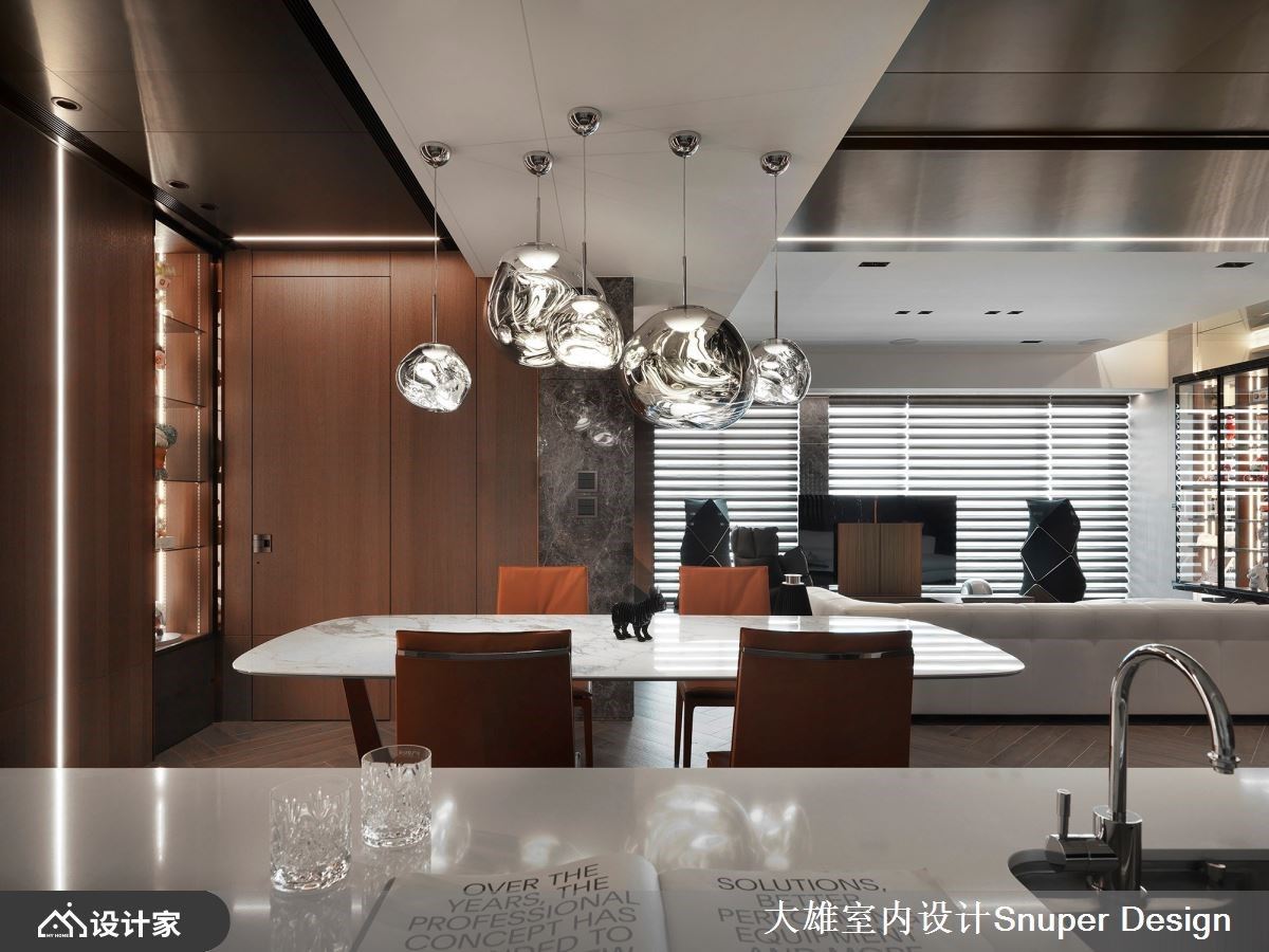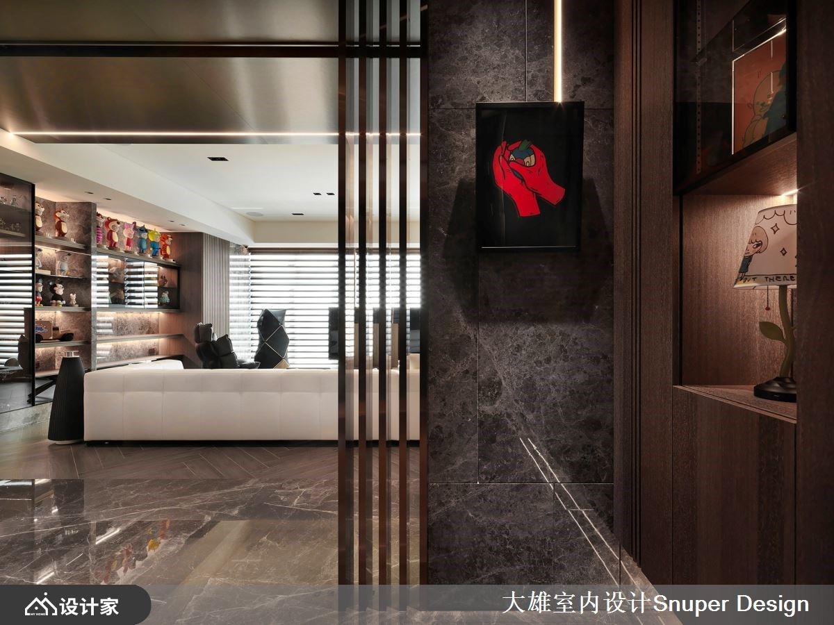 不论是艺术品、社交的象征,还是自然元素,都是家的构成要素,它们承载着居者的情感、价值观,反映着选择它们的人的内在世界,而家正因为这些精心挑选的对象,变得独一无二,成为一个真实而充实的生活空间。 现代风的新成屋,男主人对当代艺术涉入甚深,期待在设计上活化自身收藏,大雄设计解读其对美学理解,提供生活经验之外的生命感受,让收藏不仅仅是装饰,更是说故事的催化剂。 进入室内,一片宏伟的景象映入眼帘,大理石、金属和深色木质交织出一个极具品味的空间。玄关处巧妙地运用深色木质规划鞋柜,井然有序的收纳外出鞋,而大理石和镀钛金属的华丽交织成格栅,巧妙地将自然光缓缓筛落,使得整个室内充满了时序游走的表情,使进门处彰显出一份宁静内敛、缜密典雅的氛围。 踏入公共区域后,格局的规划更显流动开放,无固定实墙作为电视墙,不仅有助于家庭成员间的轻松沟通,也促进了自然光的流通。简约而精致的布局使得收藏品得以巧妙展示于空间的两侧,室内彷佛被住宅的居住者所喜爱的各种物品所包围,营造出一种极具亲密感的氛围,整个室内空间仿佛是一场时光的流转,让人感受到低调奢华与家的温馨交融。 收藏柜呼应整体空间的低奢建材,一侧采用镜面为底,搭配镀钛金属和特别设计的光带,虚化柜体的沉重感,创造延伸感,既让其中的展示品成为目光的聚焦点,同时达到延展空间的目的。而顶部一样搭配镜面,层层递进达到开阔空间的效果,展现考究的细节。另一侧的展示柜体,选用大理石纹与木质做为主要架构,为收藏品订制出专属的展示区域,并衬托其品味与质感,成为目光的聚焦点。 小编的最爱 餐厅区域开放位于沙发后侧,藉用地坪材质的区隔,天然石质的地坪与镀钛金属的低奢相得益彰,藉此明立使用机能,并选择tom dixon的吊灯做为视觉焦点,为空间堆栈出精致的厚度。