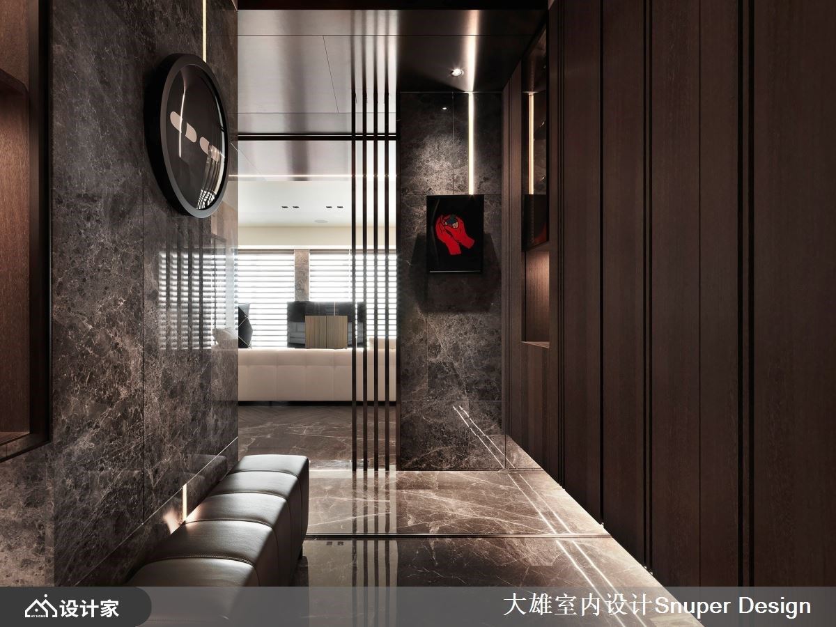玄关处以大面积的深色木质柜体规划鞋柜,大理石和镀钛金属架构出流金年华的低奢美好,格栅将自然光筛落一地斑彩,进门处有着静谧内敛、缜密典雅。