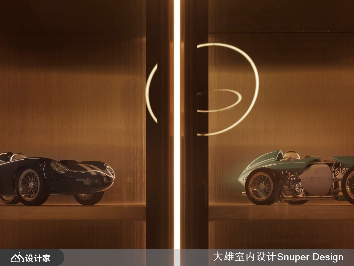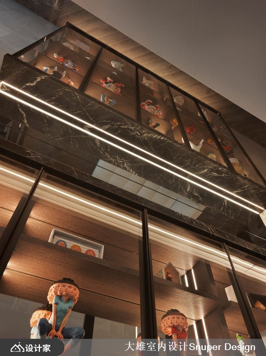 另一侧的展示柜体,选用大理石纹与木质做为主要架构,为收藏品订制出专属的展示区域,并衬托其品味与质感,成为目光的聚焦点。