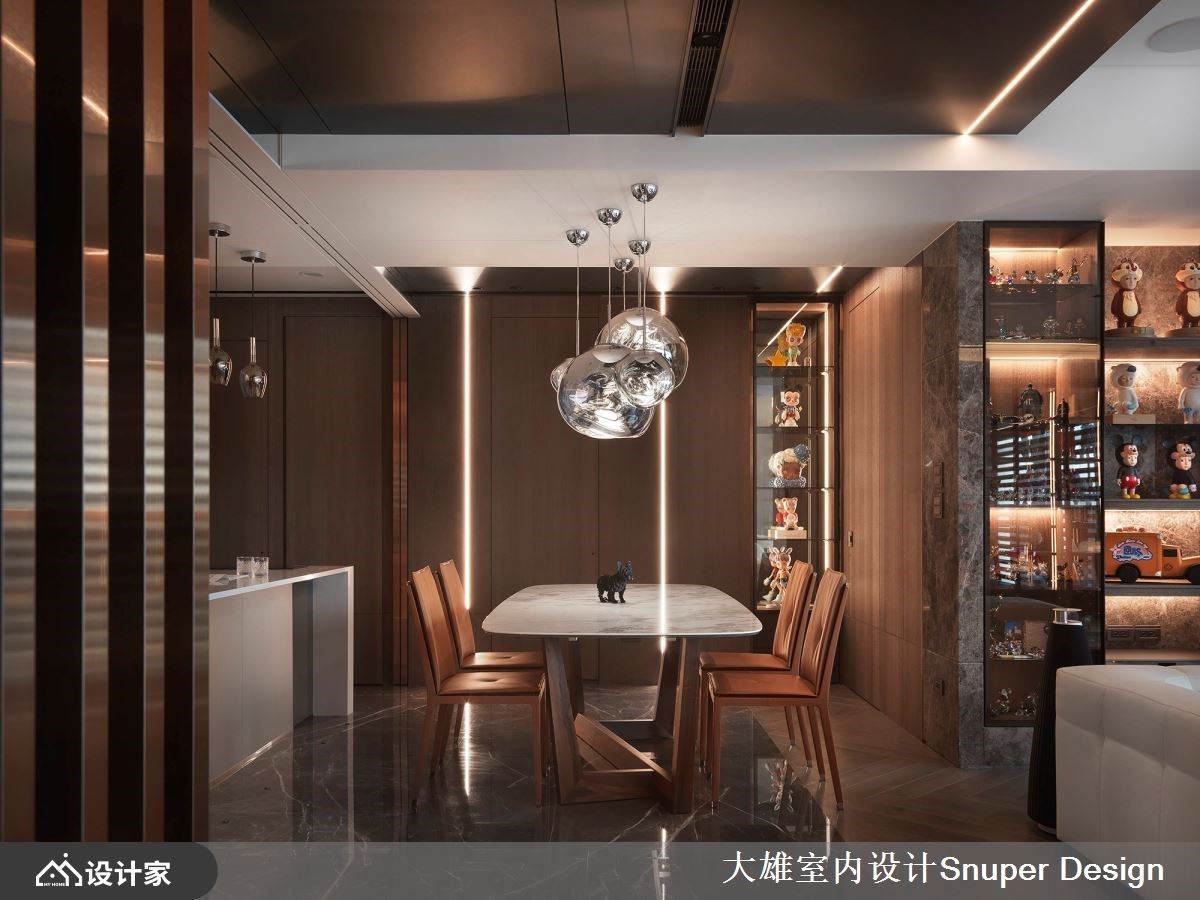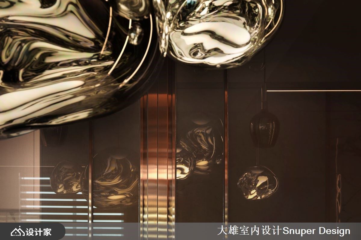 餐厅区域开放位于沙发后侧,藉用地坪材质的区隔,天然石质的地坪与镀钛金属的低奢相得益彰,藉此明立使用机能,并选择 tom dixon 的吊灯做为视觉焦点,为空间堆栈出精致的厚度。