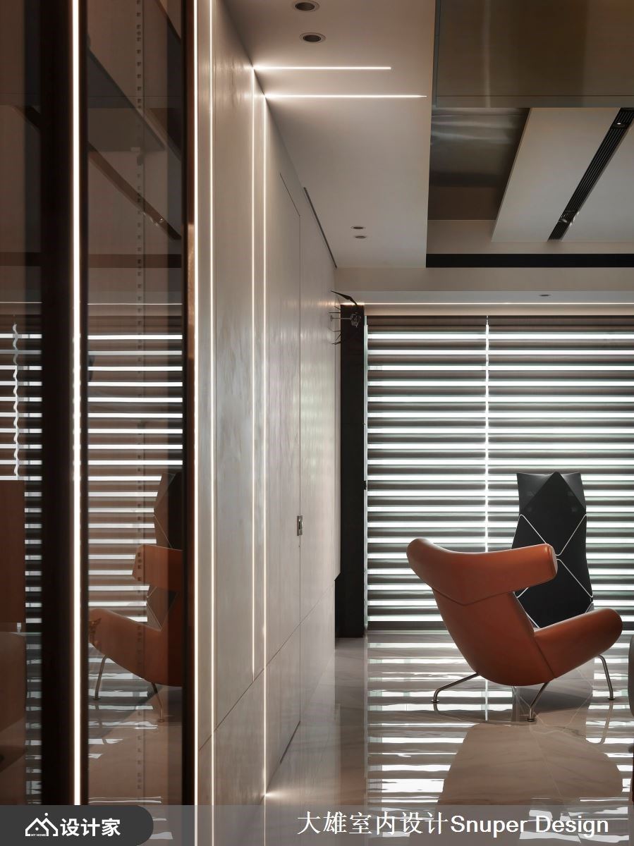 善用钛铝金属板结合光带,修饰天花板较为低矮的部分,由金属反射的光泽虚化、倒映,让空间极富趣味,又不失秩序。