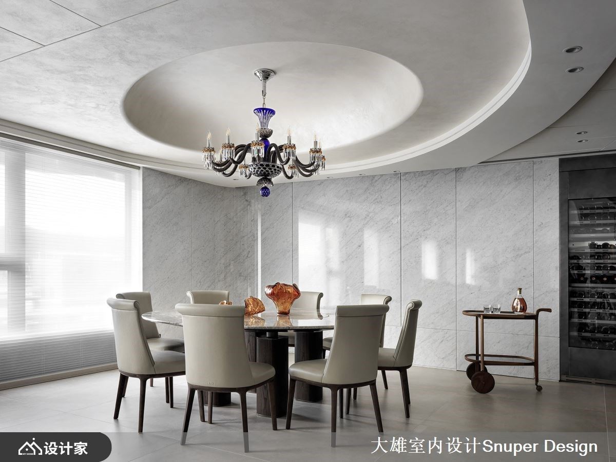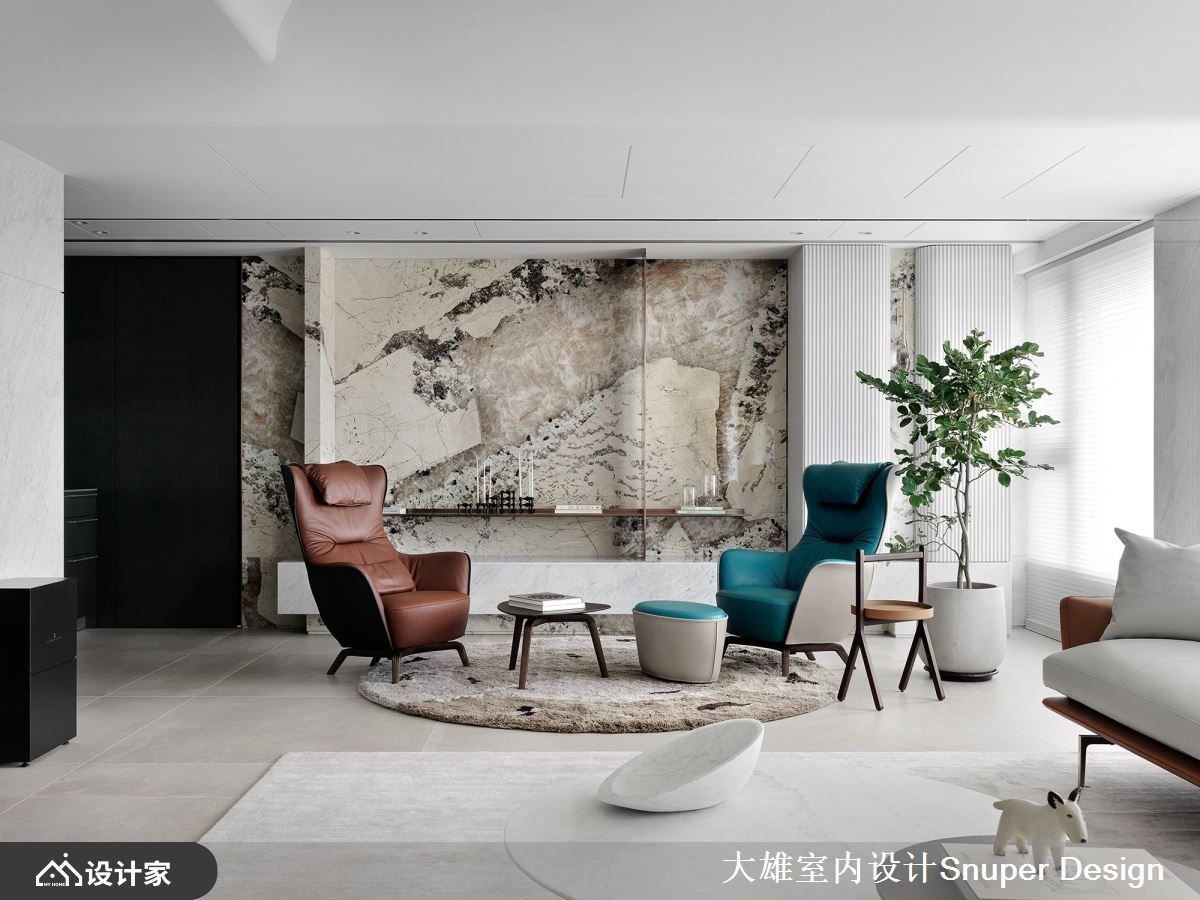 拥有极致品味的男屋主,期许能拥有一处工作及宴会用的招待寓所,便购入了坐落于北市精华地段的297平米複层新成屋,居宅大面窗景不仅揽入繁荣市景与远处的山峦脉络,更使四季更迭化身天然景深,大雄室内设计以鲜明大胆的空间配色,形塑时髦奢华的第一印象,而沉稳石材与百年义式家具相互搭衬,步步构筑尽展独具魅力的都会绅士豪邸。 迈入居室,一楼公领域设定为满足宴客需求的开阔厅区,为了创造流动通透的空间感,设计师以开放式设计延伸视觉尺度,更依循居者需求量身订製影视机能、品酒区、Lounge Bar及餐厨中岛等空间,透过场域比例配置,赋予各个空间对生活画面的想像;软装特意选配屋主锺爱的百年义式品牌Poltrona Frau,造型单椅及沙发巧妙挹注了时尚鲜明的色彩,而厅区石材以电视牆的轻浅卡拉拉白大理石为基调,线性沟缝增添立面层次变化,Lounge Bar则挑选纹理鲜明的奢石,无形创造入室后的目光聚焦处与艺术端景;其次,为延续窗外山峦意象,天花造型以曲面弧形转折与之呼应,餐厅上方的穹顶天花更将屋高尺度最大化。 拾梯而上,黑白相间的石纹阶梯平台更添视觉层次,温润实木把手则适时保留居宅所需的温度,二楼则规划男主人的独享空间,以回字型动线扩充多元弹性的行走轨迹,同时挥别既定的卫浴配置,将浴缸移至临窗处,打造沉淀心绪的沐浴角落。