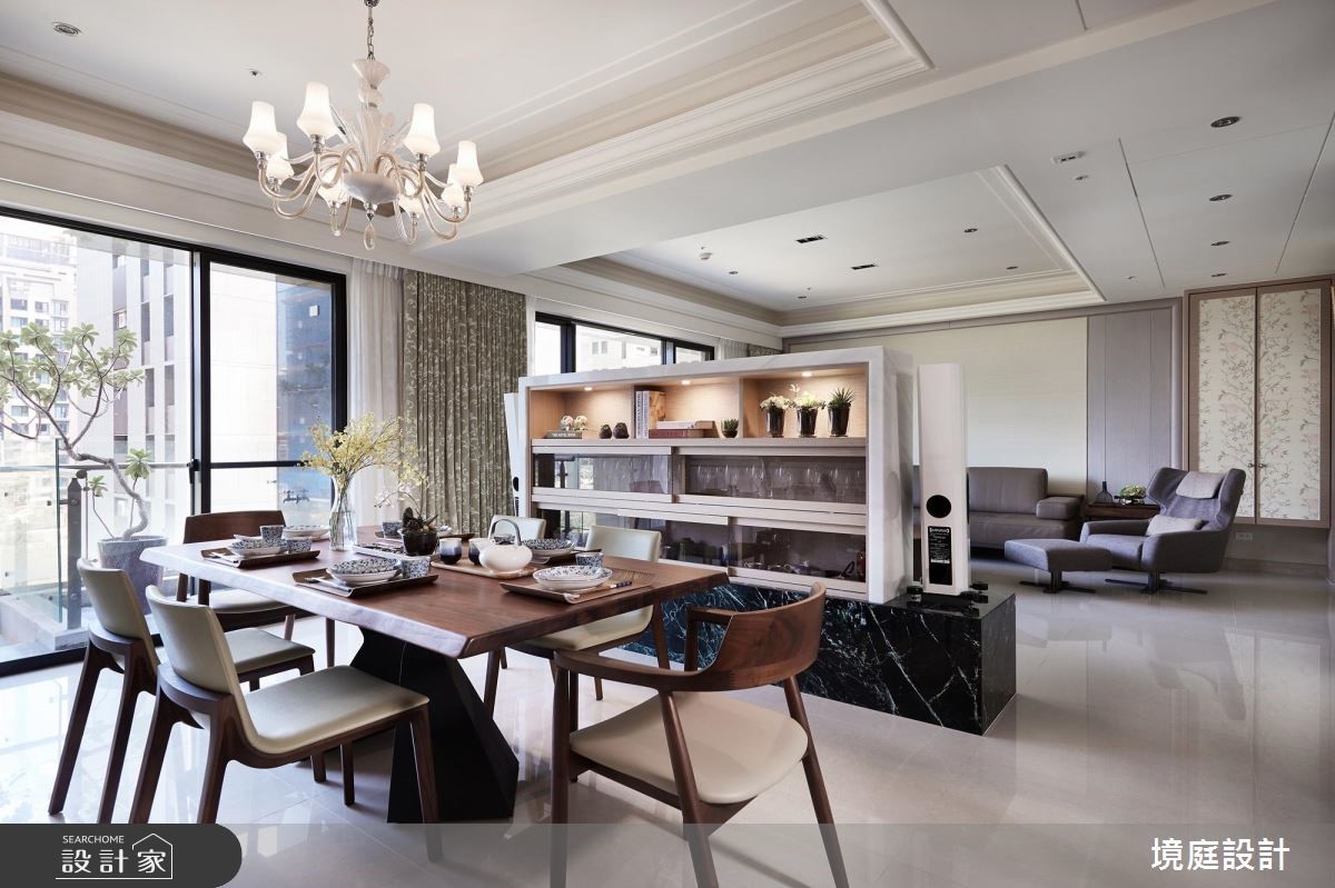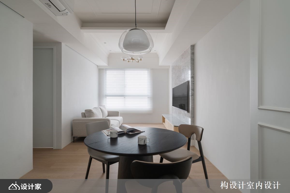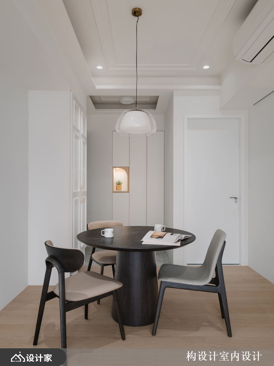 2.餐厅: 新成屋的三房两厅格局没有做太多变动,为了最佳利用长型公领域,在靠近封闭式厨房的区域规划用餐空间,挑选深色木质圆桌搭配风格餐椅,以优雅的曲线全是简约欧式古典风格。天花板玻璃吊灯也是圆弧语汇界定出用餐区域;活动式家具可随需求移动位置,符合居住人口单纯、公领域空间受限的住宅格局。餐桌摆放的位置也与邻近客厅,当有亲友来访时,客厅餐厅串连成为一个舒适的交谊空间。