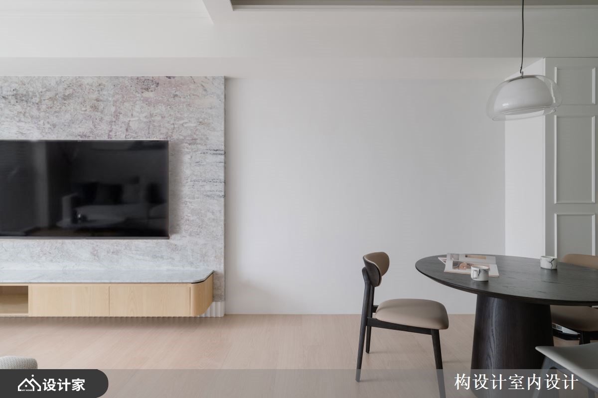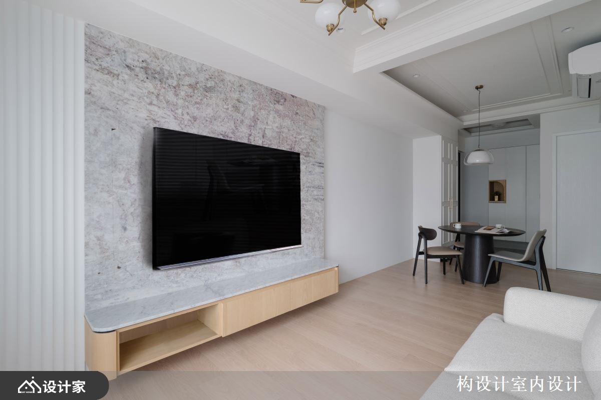 3.客厅: 客厅延续全室简约欧式古典设计,以纯净的白色涂料铺叙空间,天花板装饰线板呈现搭带金色元素的吊灯,诠释现代优雅的空间氛围,简约设计和淡雅色系也有助于放大空间。电视主墙使用大理石材并透过细腻工法连接电视柜台面,创造由立面延伸道平面的整体感,刻画出欧式古典风格的精致质感。