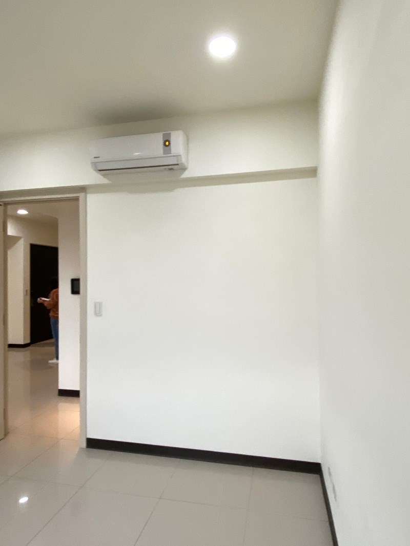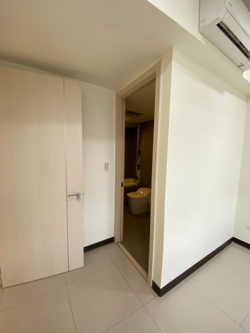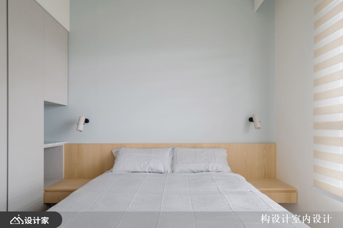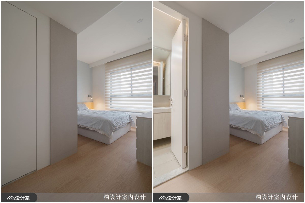 4.主卧: 为廊道底端的主卧空间拥有最宽敞的坪数,由于房门推开后直接面对主卫浴门扇,设计师透过隐藏门设计化解风水疑虑,也修饰了门片对空间造成的隔断感。主卧延续厅区白色与燕麦色的柔和调性,透过色块划分区域空间;紧邻卫浴隔间旁的墙面打造系统衣柜,同样沿着梁下规划让居家空间收纳平面化,保留舒适的床边走道。以整体规划的方式将床头柜与衣柜结合,透过材质创造变化性;悬浮设计也能降低空间压迫感,保有舒适睡眠区的便利收纳机能。