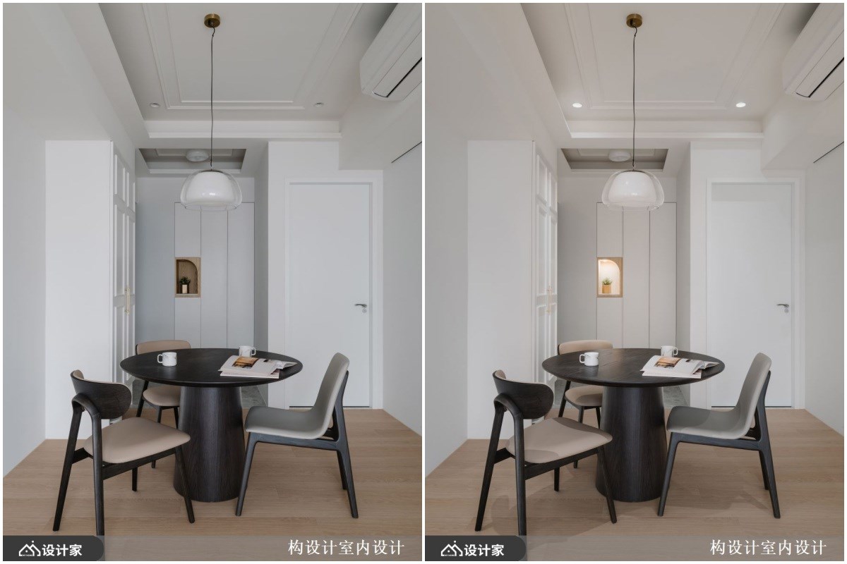 1. 玄关: 新成屋预留的落尘区空间并不大,设计师为了保留进门回到家的空间感,选择开放式玄关设计,透过天花板装饰线板设计,界定出明确的玄关空间。鞋柜沿着梁下规划创造平面式收纳,柜体镶嵌木质开放展示格柜并镶嵌照明灯,化解凸出柜体带来的压迫感亦创造温馨的玄端景。