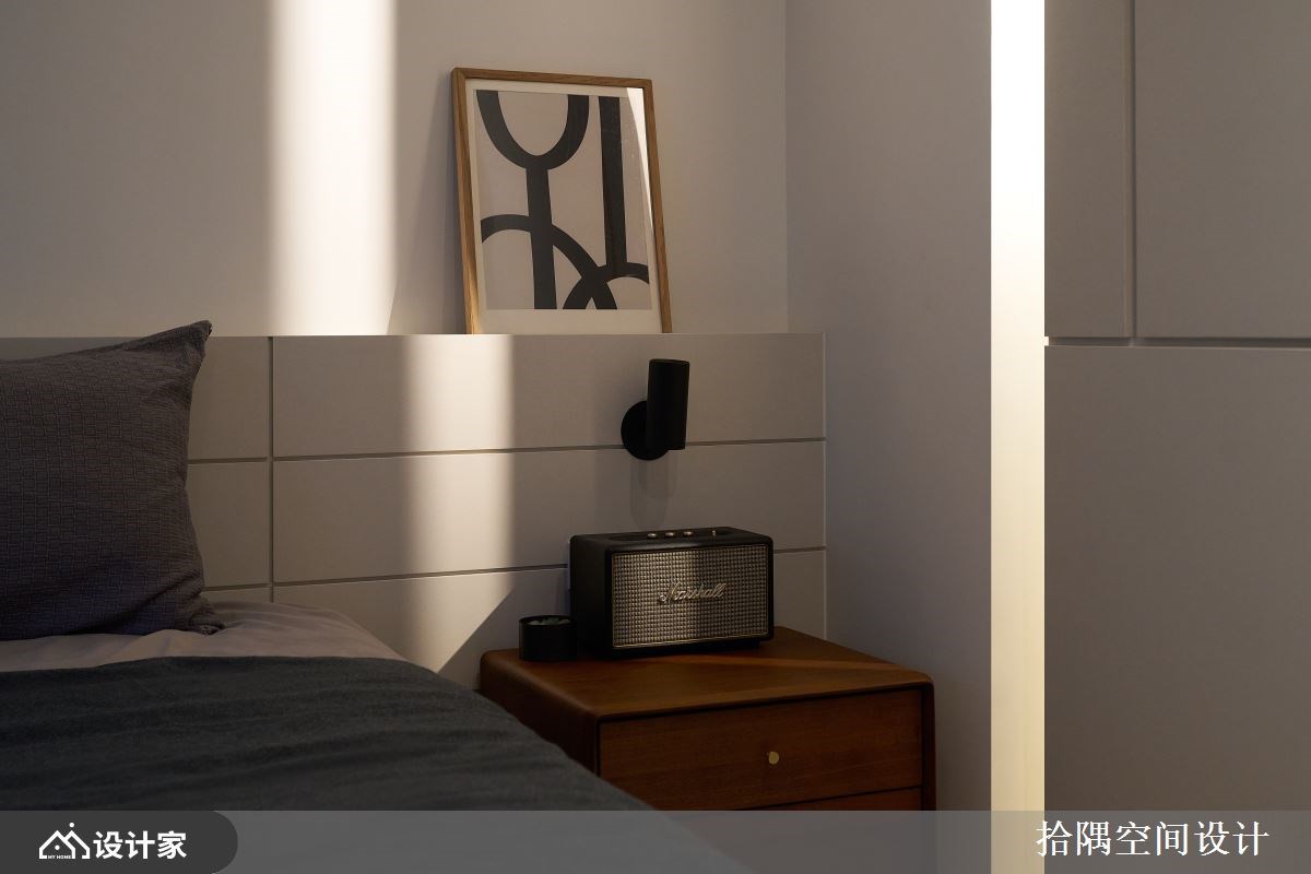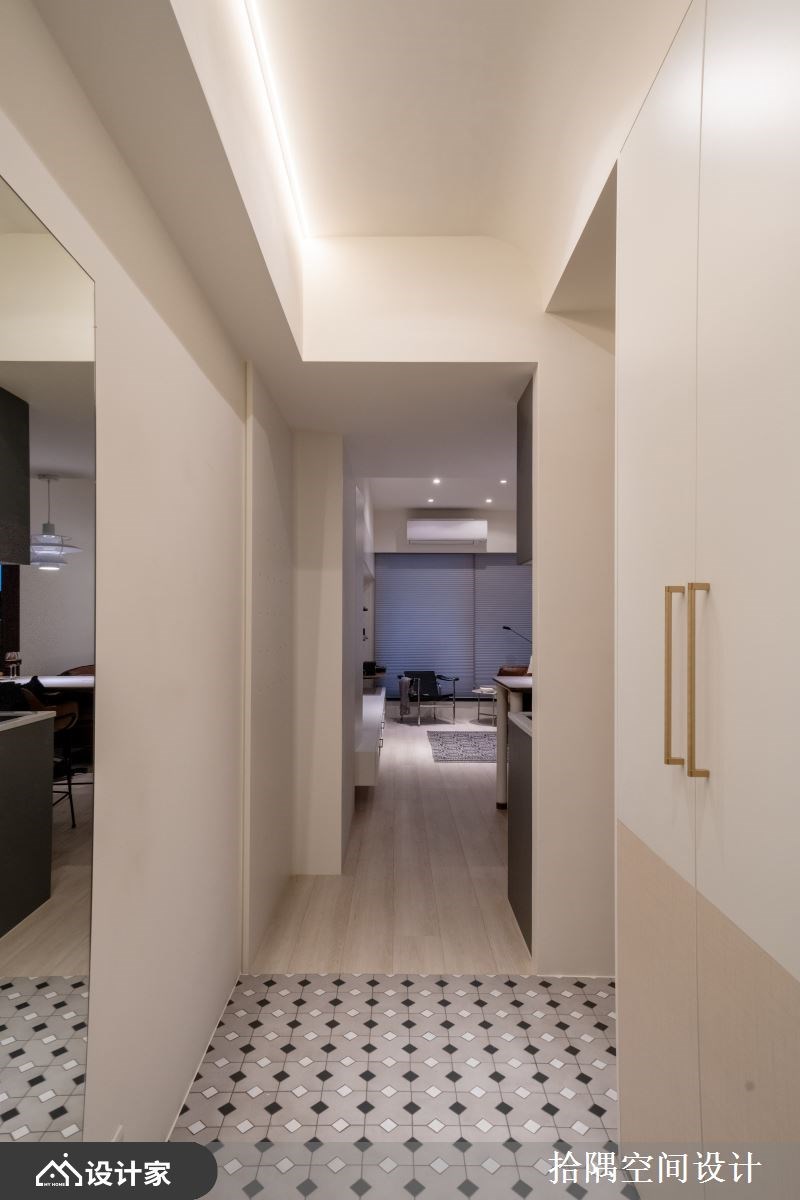 装潢风格就像做料理,在食谱内稍作变化就能创造属于自己家的专属风味!49.5 平米新成屋以现代风格为基调,玄关长廊铺设带有复古感的花砖拼贴,与室内木地板创造场域分界;立面轻柔奶茶色调铺叙,玄关柜特别以涂料做出腰墙层次,搭配对侧大面穿衣镜让窄长廊道更显轻盈。 入内后白色收纳柜采取复合式柜型设计,满足储藏、展示等收纳需求;整体系统规划连接电视柜,沿梁下规划上层收纳,下层电视柜在门板上加入藤编工艺,让单调的现代感带出轻柔复古风格。电视墙以浅色特殊漆铺叙,在自然光照射下质朴纹理增添手作亲切温暖感;靠窗处墙面规划层板放置书籍杂志,可上下调节高度的风琴帘,搭配窗边主人椅打造舒适的阅读空间。开放式一字型厨房选择深色们片延展空间深度,特别订制一座特色中岛创造出回字动线,中岛白纹大理石台面、下方弧形线板设计诠释出优雅气质,高脚椅设计能用餐、也能作为咖啡与餐酒吧台,挑选一盏经典的PH5设计餐灯点亮空间;运用廊道畸零区以温润木质打造备餐柜,让小坪数也能享受满满的用餐仪式感。 小编的最爱 49.5 平米一居室的规划争取到更宽敞的居室空间,床头以几何造型打造床头板,透过板材深度打造置物空间,夜灯则以壁灯方式镶嵌于床头板上,让两侧床头柜可以用来放置音响、睡前读物和手机等用品。利用多余的坪数规划独立更衣间,推开拉门后是以吊挂为主、抽屉柜为辅的收纳空间,内部设计有穿衣镜方便挑选搭配、也能放大窄长空间;拉门侧边选择压花玻璃优化视觉与光线的通透性,呈现麻雀虽小五脏具全的舒适生活。
