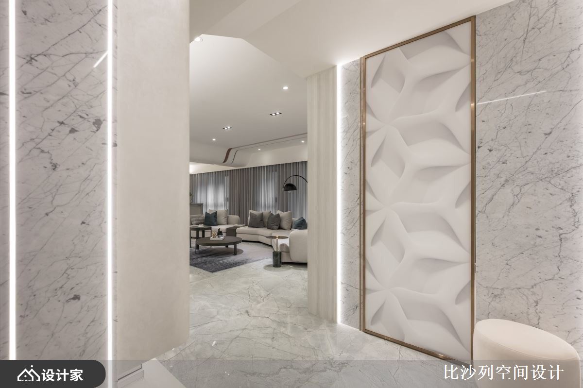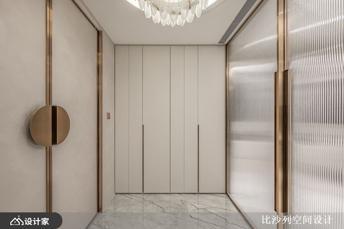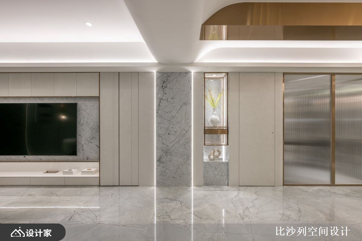 小编带你看好宅 198平米的毛胚屋在设计上,融合了现代风的流行元素,以白色为基底,搭配大理石、镀钛、小冰柱玻璃,打造出低调奢华且时尚的生活空间,设计师精心规划空间布局,将各种功能区域有机结合,使整体空间高度自由,既能满足居住需求,又能突显屋主的独特品味。 客厅空间不被电视墙框架限制,突破传统设计概念,同时保留完整的开窗面,使室内享有最好的采光效果,电视墙选用大理石和镀钛金属等异材质搭配,增强了立面的层次感。与此同时,吧台区域的设计呼应了整体空间的细节,以弧形吧台增加动线的流畅度,镀钛材料的运用则为空间增添了奢华感,这些材质和设计细节的完美结合,使空间既具功能性又充满美感。 卧室空间以安静简洁的方式进行规划,巧妙延续了公领域的大理石和镀钛元素,并结合绷皮质材,提升了空间的精致度。设计中利用小冰柱玻璃围塑出弧形更衣室,为居住者提供了方便的更衣空间,并且增添了卧室的摩登时髦感。这样的空间规划和功能设计,既实用又美观。 小编的最爱 书房利用小冰柱玻璃与深色玻璃,营造出空间穿透感,同时对两面相邻空间的迁换做出区隔,创造出另一个生活亮点,而弹性的拉门设计,能根据屋主不同的需求,添加更多的灵活性,使得生活有更多的样貌。