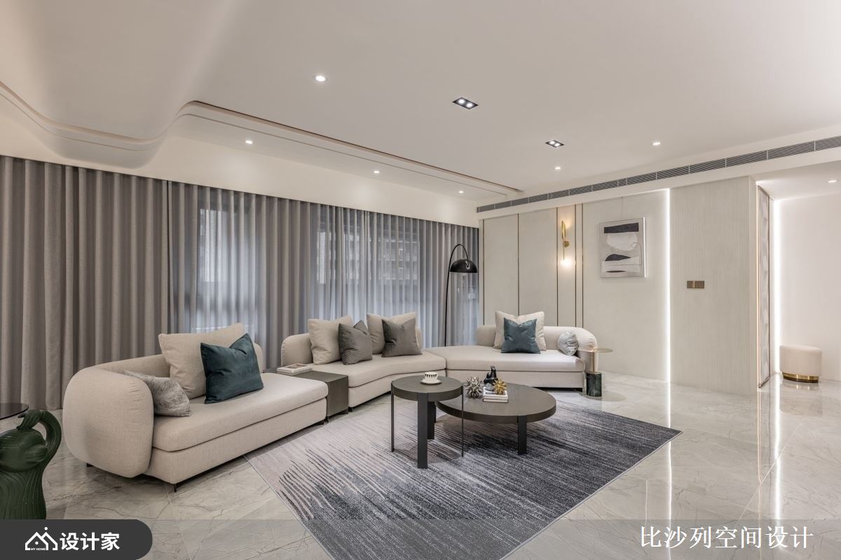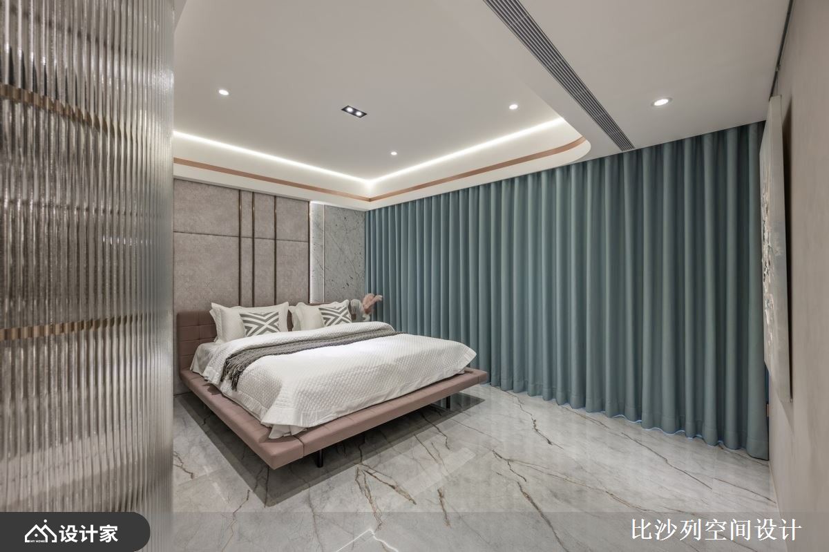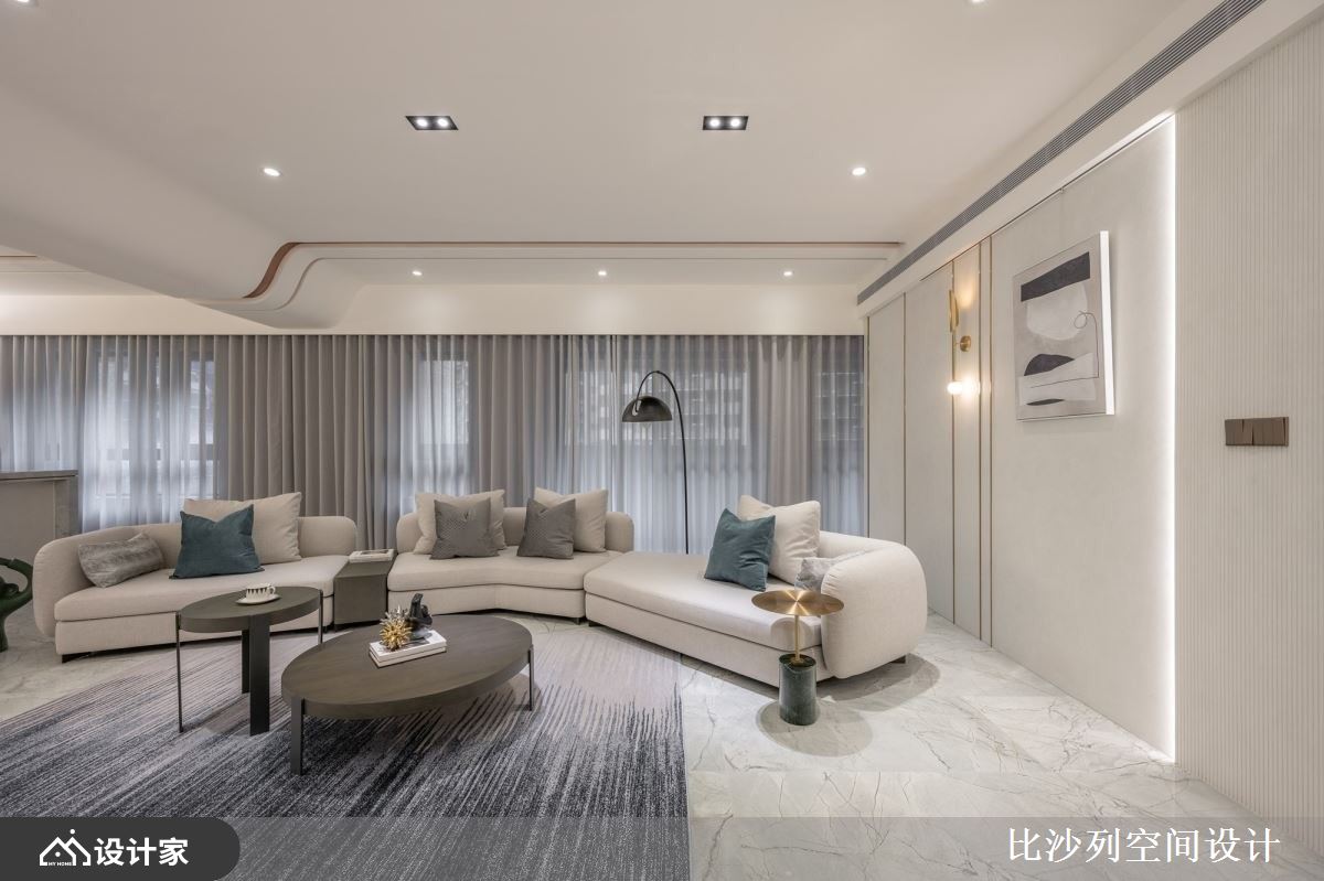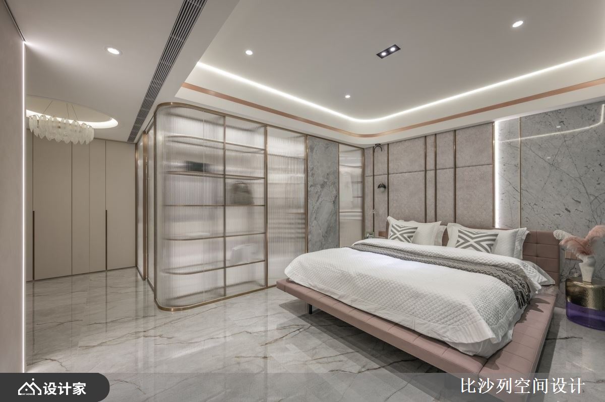 小编带你看好宅 198平米的毛胚屋在设计上,融合了现代风的流行元素,以白色为基底,搭配大理石、镀钛、小冰柱玻璃,打造出低调奢华且时尚的生活空间,设计师精心规划空间布局,将各种功能区域有机结合,使整体空间高度自由,既能满足居住需求,又能突显屋主的独特品味。 客厅空间不被电视墙框架限制,突破传统设计概念,同时保留完整的开窗面,使室内享有最好的采光效果,电视墙选用大理石和镀钛金属等异材质搭配,增强了立面的层次感。与此同时,吧台区域的设计呼应了整体空间的细节,以弧形吧台增加动线的流畅度,镀钛材料的运用则为空间增添了奢华感,这些材质和设计细节的完美结合,使空间既具功能性又充满美感。 卧室空间以安静简洁的方式进行规划,巧妙延续了公领域的大理石和镀钛元素,并结合绷皮质材,提升了空间的精致度。设计中利用小冰柱玻璃围塑出弧形更衣室,为居住者提供了方便的更衣空间,并且增添了卧室的摩登时髦感。这样的空间规划和功能设计,既实用又美观。 小编的最爱 书房利用小冰柱玻璃与深色玻璃,营造出空间穿透感,同时对两面相邻空间的迁换做出区隔,创造出另一个生活亮点,而弹性的拉门设计,能根据屋主不同的需求,添加更多的灵活性,使得生活有更多的样貌。