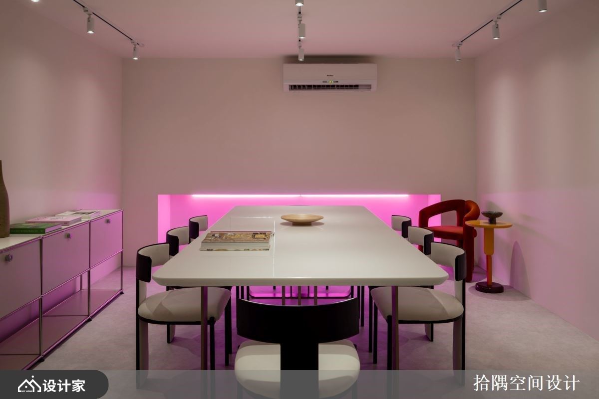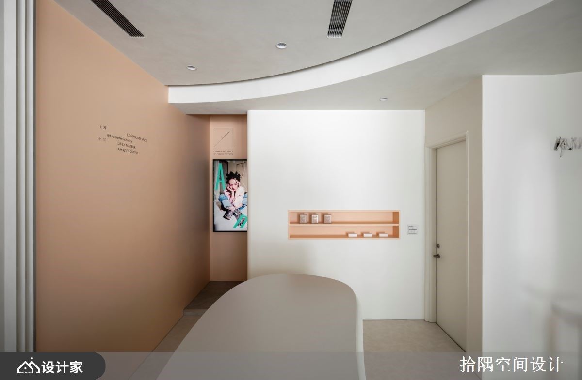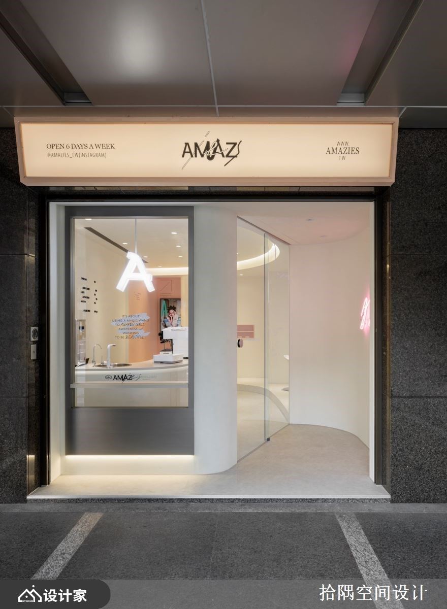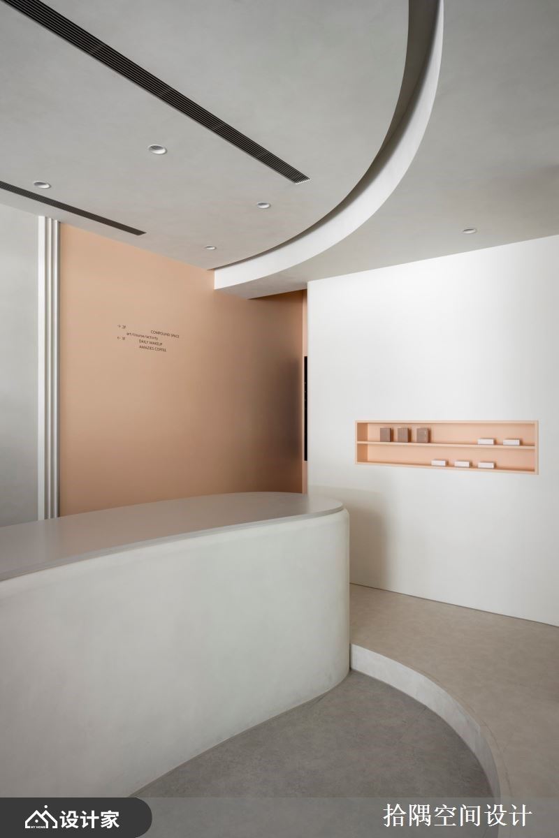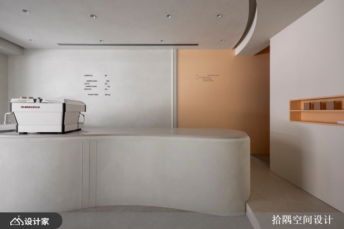 79.2平米的複层中古屋,翻新为複合式商空Amazies Café ( AM咖啡妆室),结合咖啡厅与美妆商品的崭新型态,成为女性消费者享受浓醇咖啡与精緻彩妆的好去处,拾隅空间设计以女性喜爱的简约现代风为基调,透过适度的留白,为商业空间挹注一丝惬意、舒适氛围,快跟着小编一起看下去吧! 店面外观以大面清玻璃围塑,途经时便将唯美的互动画面裱框于心,入店门口以斜切角度创造一处留白场域,以便人流交会时能有顺畅的行走动线;一楼场域以大尺度的曲面中岛作为视觉亮点,天花造型更与之呼应,形塑柔美流畅的商空第一印象,同时架高化妆区域的地坪,悄悄地明确场域用途分野,更暗喻着顾客前往二楼空间的轨迹,而暖橘色调铺叙于立面及壁龛展示处,增添了一丝清新活泼感;拾梯而上,二楼空间装设萤光粉色灯带,呼应品牌视觉色,更创造截然不同的氛围。