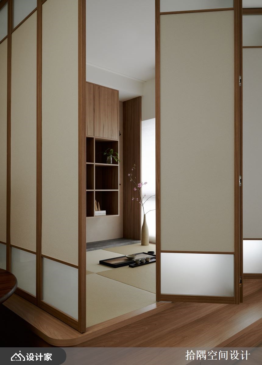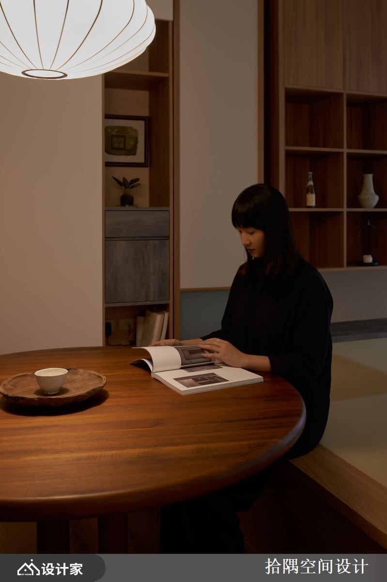 公领域串联客厅、和室、餐厅,以轻浅色调、温润木质为主轴,创造日式风格贴近自然、朴实雅致的宁静氛围。架高地坪的和室空间,以折门作为弹性隔间,敞开时空间放大,视野开阔,方便照看孙女,朋友来访时,折门全部阖上也能一秒化身客房,符合屋主好客的个性,和室地板刻意延伸加长,设计为座椅高度,孩童在桌上涂鸦或亲友围坐桌边,无论沏茶聊天用餐,都能满足多元情境使用。和室墙面结合展示收纳柜体,屋主可摆放收藏品,柜体设计与部分跳色,丰富墙面表情。