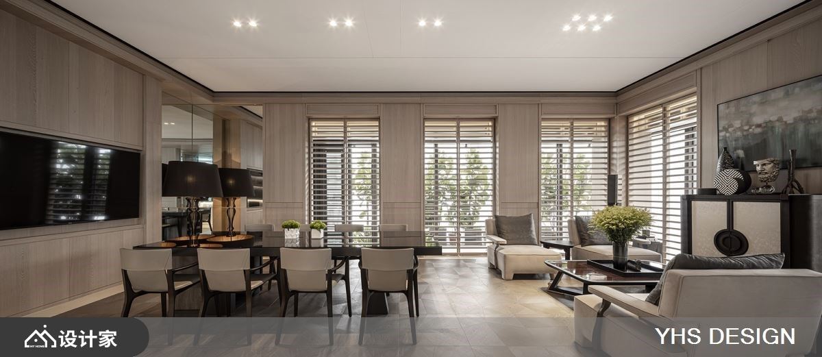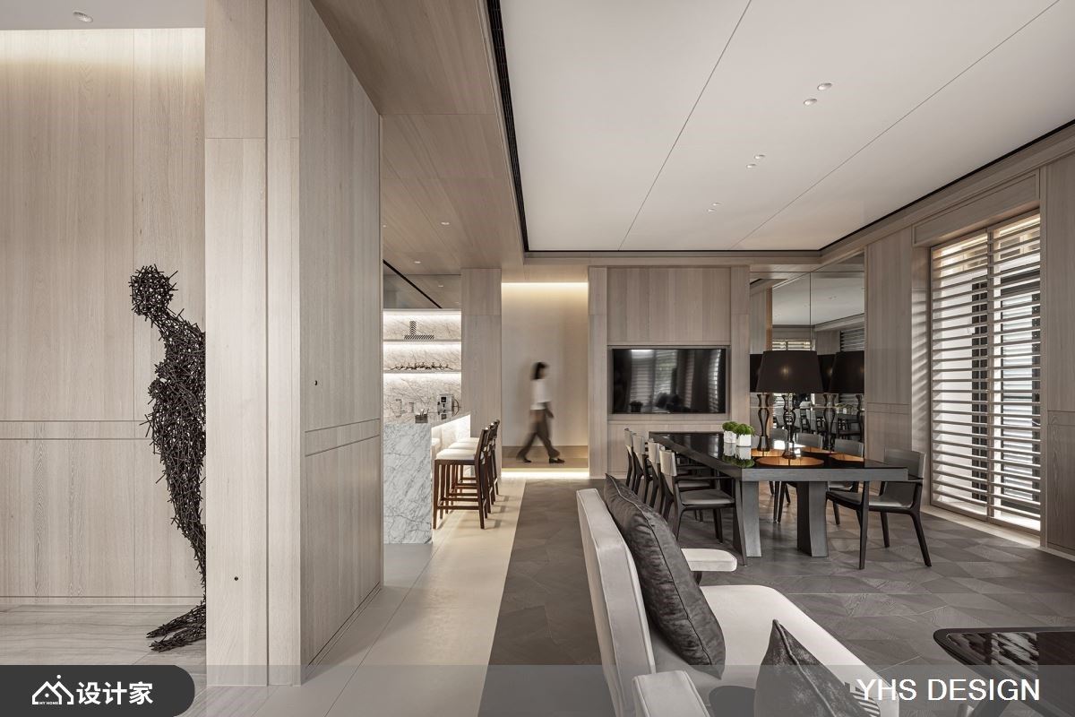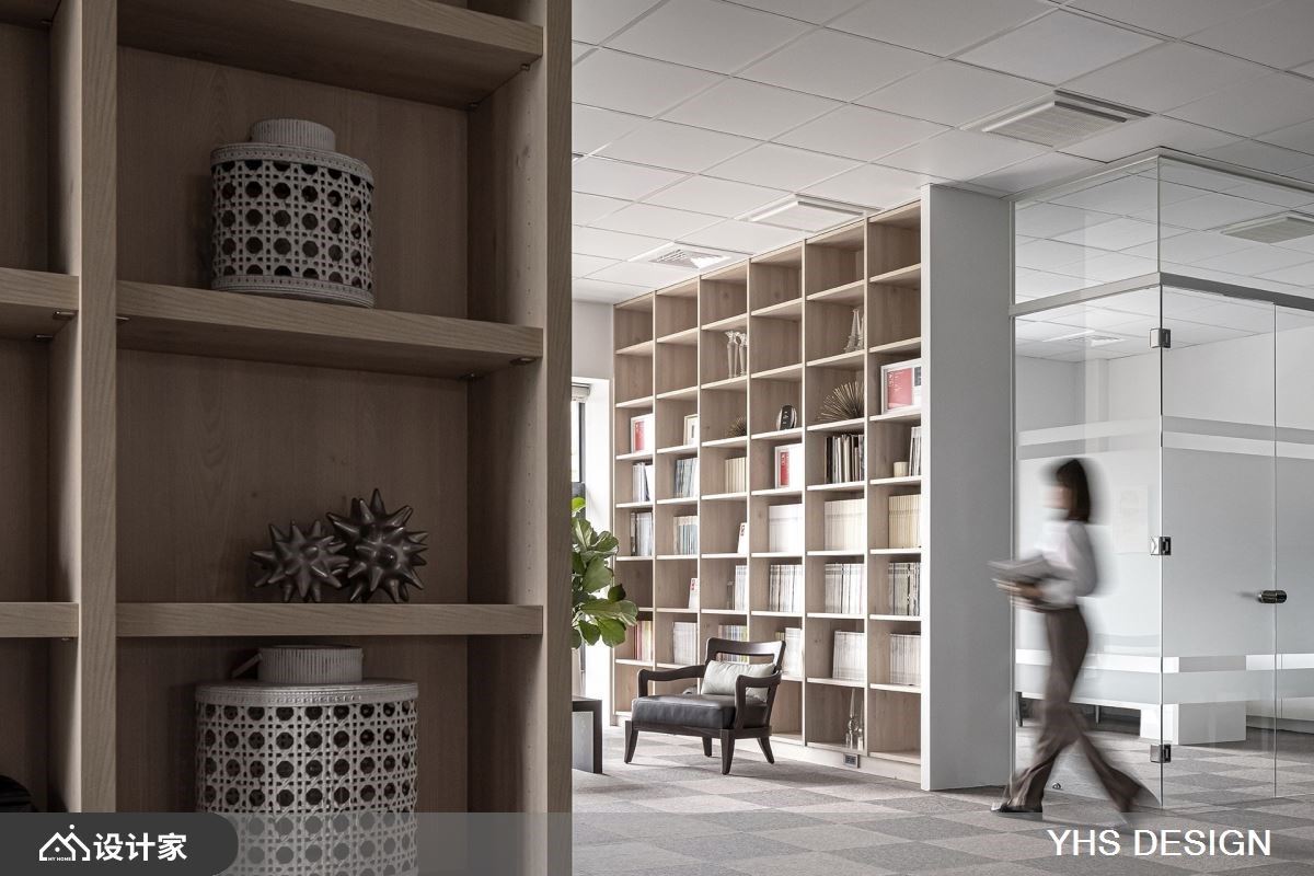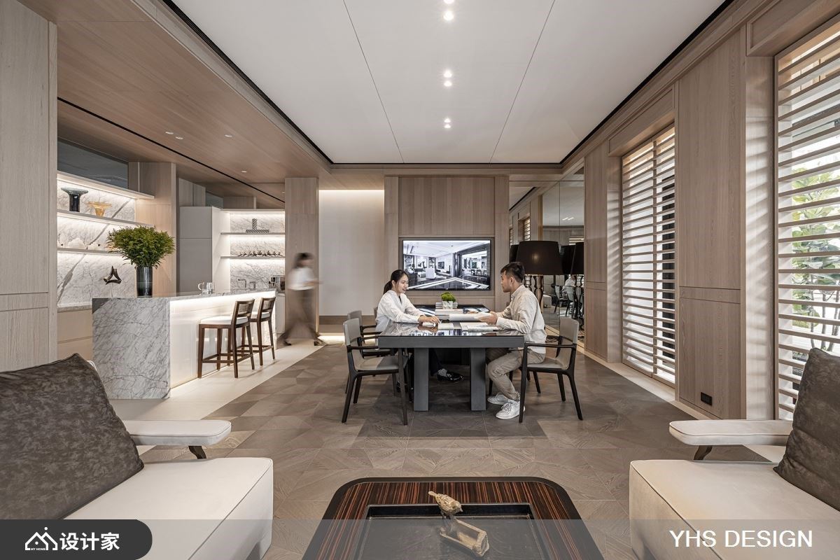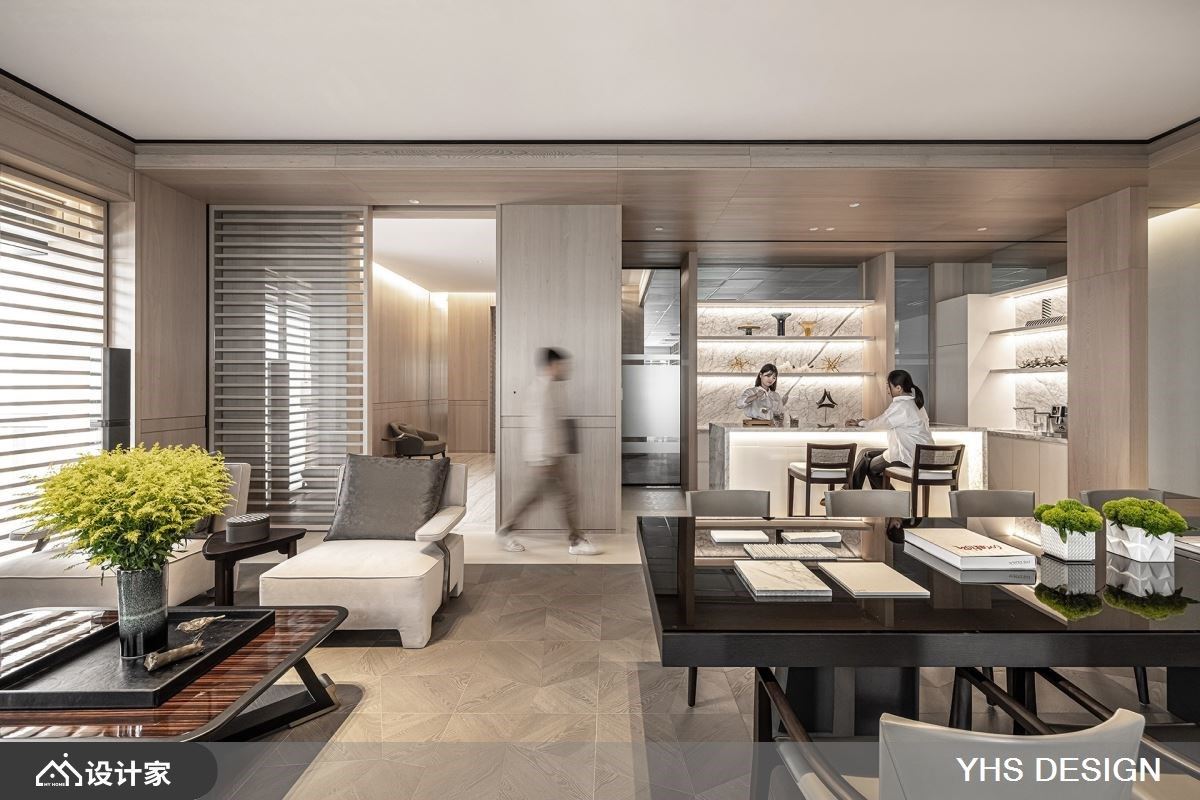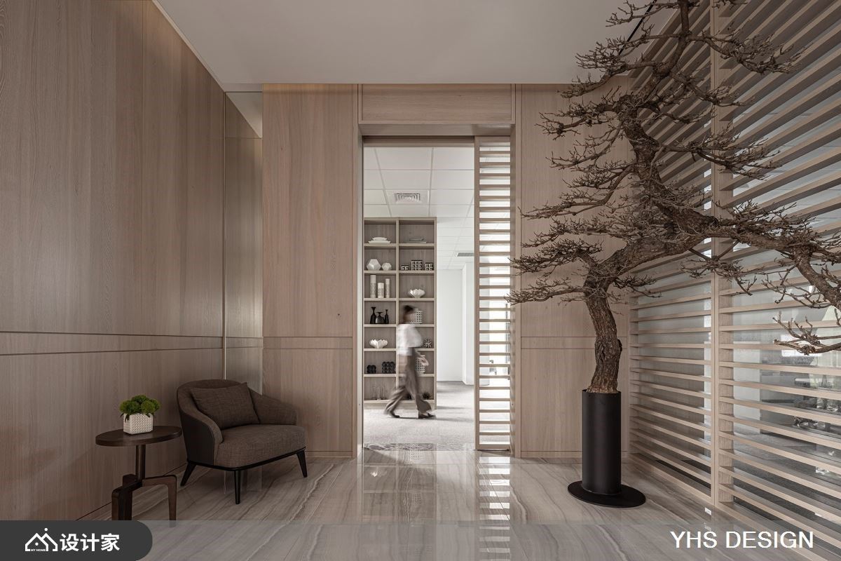 扭转商业办公空间过于都市与冰冷的体感,利用此案坐落于四面环绿的特性,特别着重在室内空间与户外的链结性。29 平米复层空间使用了大理石、木皮、木地板等多样材料,但透过色调的统一创造和谐性,在温润淡雅木质色调中,呈现不同材质与纹理的特色。窗景规划上分布于行走动线上,让每一个视觉落点都能看见窗外美景、听见风声与鸟鸣,消弭了建筑内与室外的隔阂,在忙碌的工作环境中透过空间布局调整节奏。 将住宅放松的气氛运用在商业空间里,整体设计非常着重于视觉的穿透性,以清玻璃和格栅的替代了实体隔间墙,粗格栅设计由玄关区看向办公区时保有视线的开阔度、亦保有一定程度的隐私性,并让充沛的日光自然洒入,强化了室内的采光效果,进而提升了整体的空间感。室内以开放式设计为主,透过地板材质的转换界定场域机能,待客区以温润且纹理别致的木地板呼应墙面木质元素,让屋主与设计师能在放松的状态下进行讨论协商;一旁的开放式厨房吧台,则选用简约现代的白色磁砖,创造明亮整洁的茶水空间。从美学观点出发,强调舒适、质感与低调奢华。透过以简驭繁的设计手法,将不同时代风格和文化思维的探索融入到生活设计中,巧妙地结合各种材质与色调元素,营造出与自然和谐共生的空间。这样的设计不仅让繁忙的生活中重拾一丝宁静,还为空间注入了内敛而独特的美感。 小编的最爱 随着光影的变化,室内景致随时间流转而展现出不同的面貌,营造出一种静谧而又充满内涵的氛围,为空间注入静谧内敛的氛围且富饶意趣,勾勒和谐无扰的内涵心境在工作环境中带来清新透亮的视觉感受,也让人更能享受其中的平和与舒适。