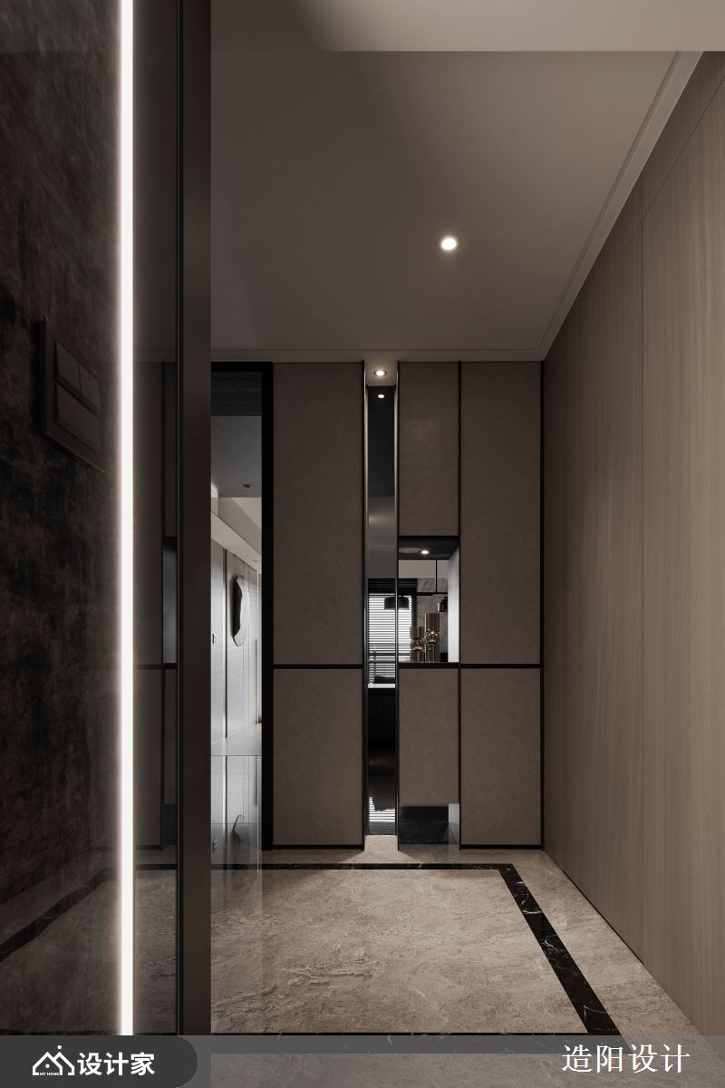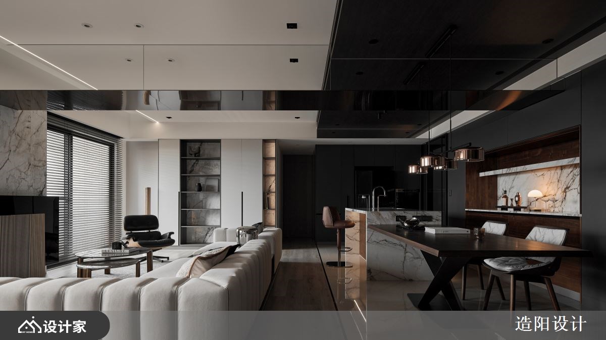不同阶段想要的生活都会有所转变,这间 264 平米双拼住宅就是最好的例子!本案最初在预售阶段时,屋主喜爱沉稳深色调的空间氛围,但随着时间推移屋主希望住宅能有更多明亮的气氛,因此历经了二次设计调整,替屋主打造出最符合现阶段生活情境的空间。 玄关入口巧妙运用了半透光的柜体屏风,将收纳功能与空间设计完美融合。玻璃材质的运用不仅增加了轻盈感,还营造出更开阔的视觉延展效果,让空间在进出时感觉更加通透。地坪部分采用浅色大理石,精心区隔出落尘区,与客厅的磁砖材质形成有趣的对比,不仅强化了功能性,更在迎接来访者时带来洁净明亮的第一印象,使整个玄关呈现出既时尚又实用的迎宾效果。客厅区域拥有优越的落地玻璃采光,因此设计师特别将沙发采用横向配置,款式上跳脱一般三二一的制式沙发组,而是选用两组L型中间带有茶几的款式,提升休憩区的放松感、让每一个座位角度都能面对落地电视与玻璃帷幕,有宾客来访时沙发型态也利于彼此聊天。住宅内横越的大梁运用镜面降低压迫感,茶几的位置也刚好避免掉坐在梁下的问题。大面落地窗选用木百叶与室内空间材质呼应,也能自由调节光线,随心情变换空间氛围。 沙发后方的厨房设计灵感来自于屋主一直心怡的国外中岛厨房,浅色耐丽石作为中岛台面及备餐台的材质,整体呈现出宽敞明亮的用餐与烹饪空间,亦串连木质餐桌形成另一个家中重要的交谊场域。天花板选用雾黑色材质,与客厅区的白色调做出分野,更呼应了深色开放式厨具,在丰富的料理机能下,打造出现代轻奢风格的样貌。
