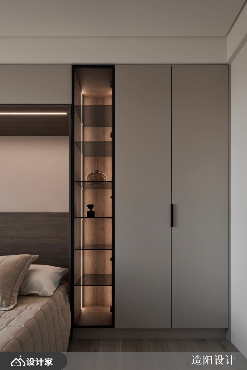 规划居室时设计师融入风水师的建议,将三房的床头都有做过调整,主卧床头选择普鲁士蓝皮革镶嵌镀钛金属饰条。床尾规划了一个宽敞的步入式更衣间,收纳柜偷过镶嵌设计打造方正凸起的舒适空间;整面吊挂式设计搭配灰玻璃柜门片,侧边精品包柜带有灯带照明,同样有柜门防止灰尘附着。化妆台与包柜结合,背后采光窗正好替化妆台带来良好的照明,搭配角落舒适的主人椅,打造星级主卧。另外两间居室以浅色木质调铺序,同样采用镶嵌手法降低柜体的压迫感,并透复合式的柜型设计,让每一个房间都能拥有五星饭店的享受。