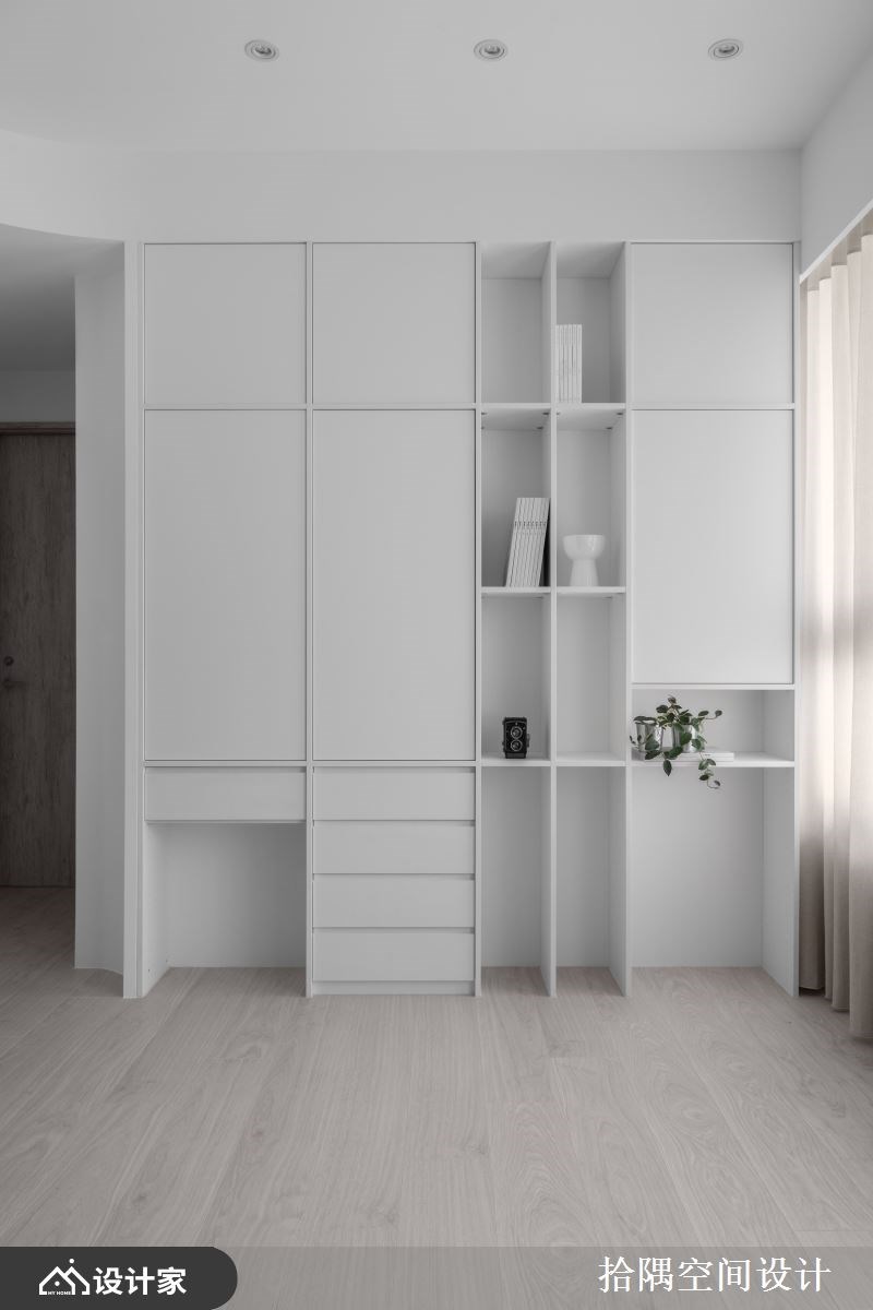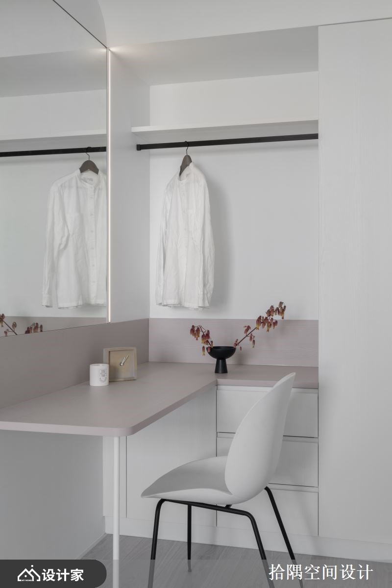 私领域延续公领域的轻柔调性,利用梁柱下方规划L型化妆台,铁件吊杆可吊挂明日穿搭服装,上方也可收整较大的物件,台面下方为抽屉,衣物配件可分门别类,提升生活质量。