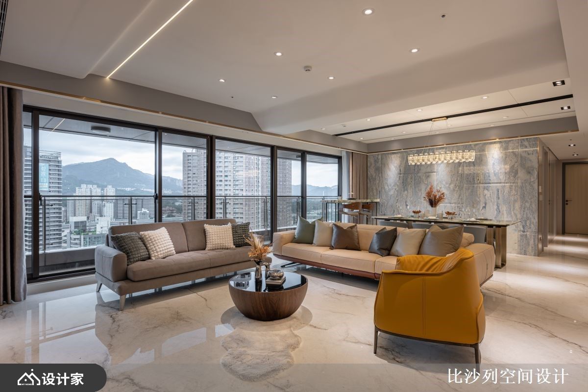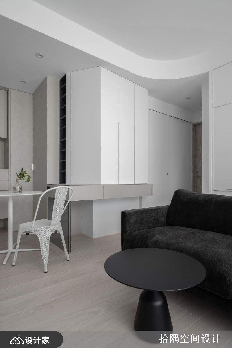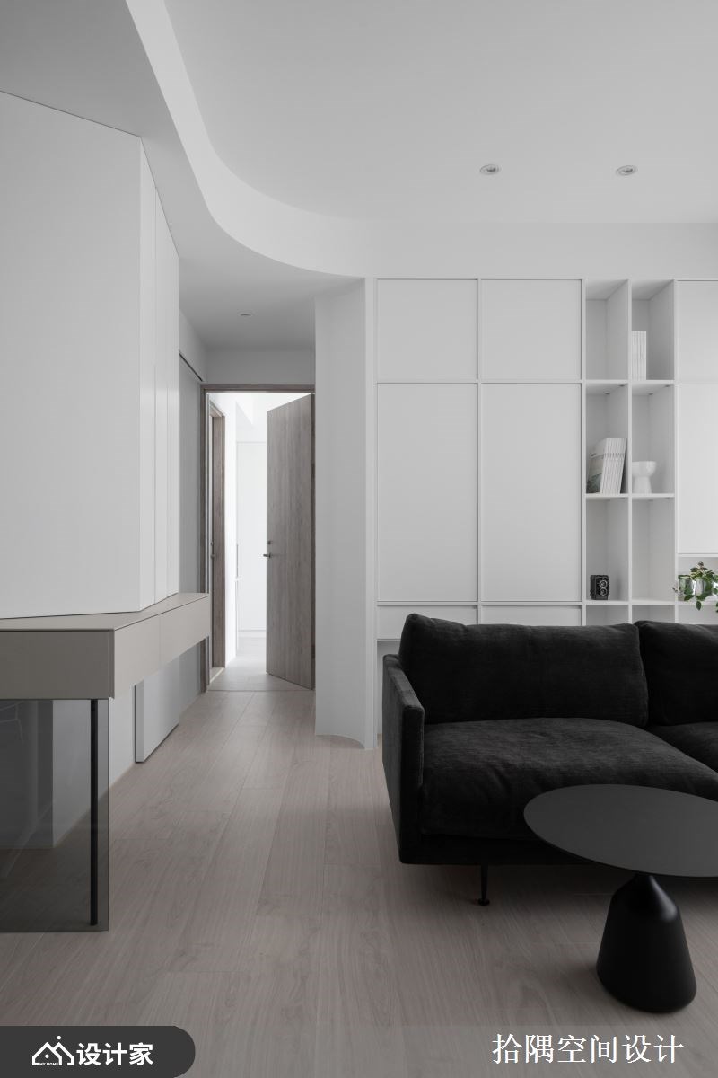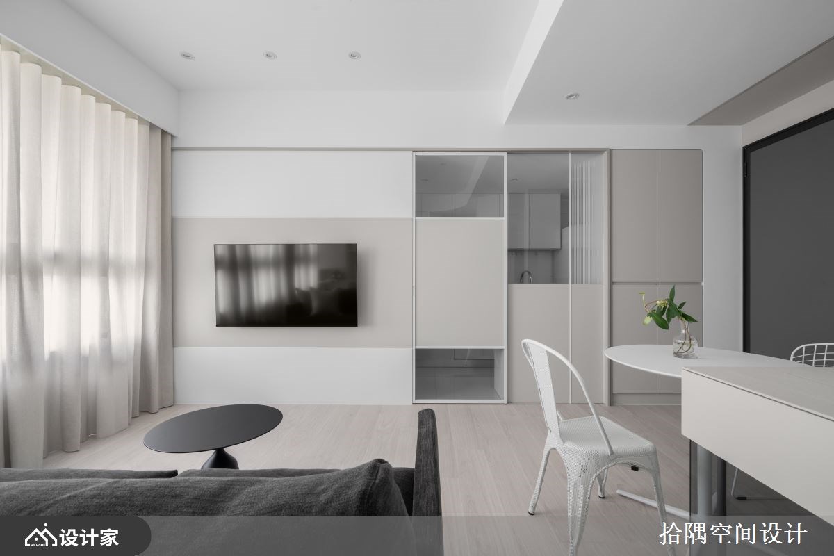 玄关旁墙面增设收纳柜体,平台也可放钥匙或小物等,天花灯带设计也富有照明的效果,柜体沿着墙面往两侧延展,视觉平整延伸,公领域以轻浅的色调围塑,穿插温润木地板与奶茶灰色调,散发柔和迷人的魅力,浅色也让空间有放大的效果。大面连续窗景将高楼户外的美景尽收眼底,温暖的阳光洒满室内,让人感到身心舒畅,客厅电视墙中段跳色奶茶色,制造视觉活泼,巧妙把厨房入口升级为拉门,拆除部分墙面改用玻璃,增加穿透性,即使在厨房做料理,也可照看小孩,将电视墙与拉门色调整合,横向视觉也跟着放大,黑色沙发可弹性移动,赋予更弹性的使用情境。精选圆形餐桌不影响动线行走,周围柜体结合收纳、黑色开放展示、木质台面等多元机能。天花弧形线条勾勒圆润视觉,沙发后方整座柜体,部分开放部分封闭,可随屋主心情摆设,柜体圆弧收边,也具有导引动线的效果。
