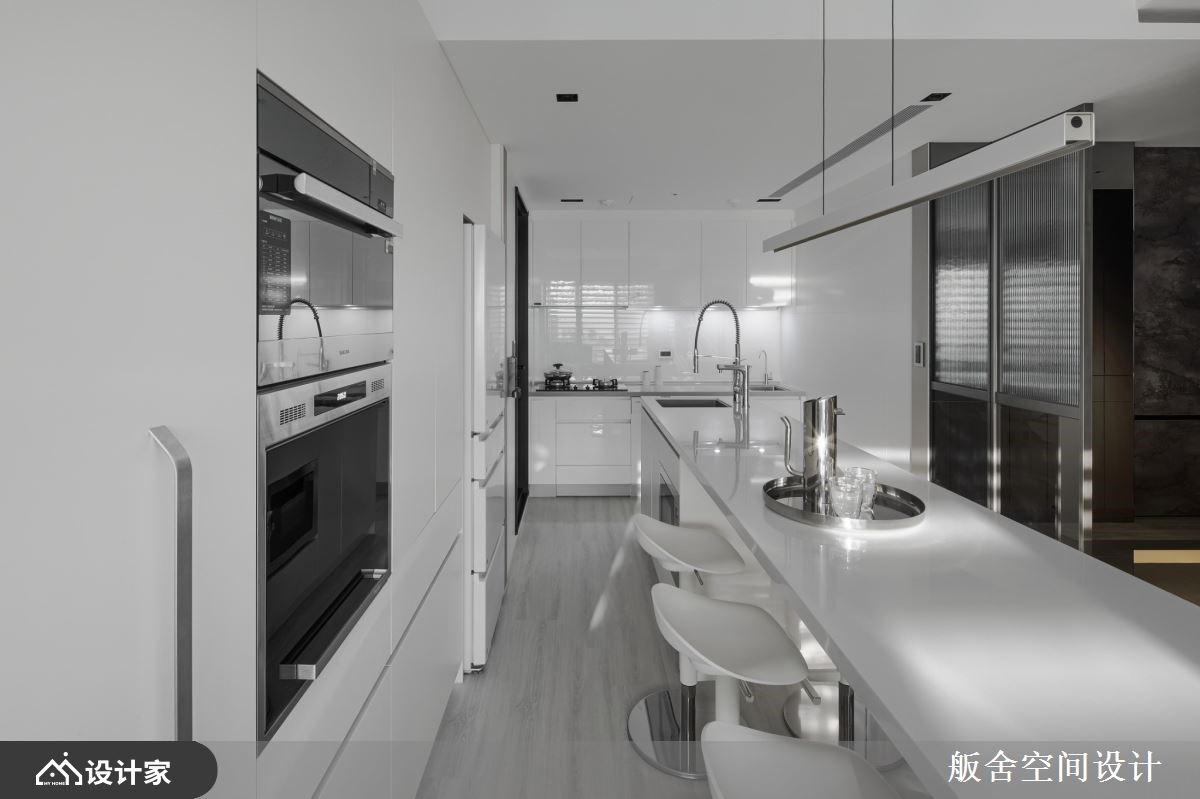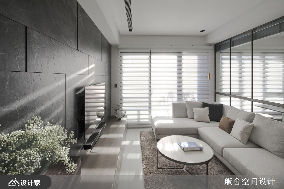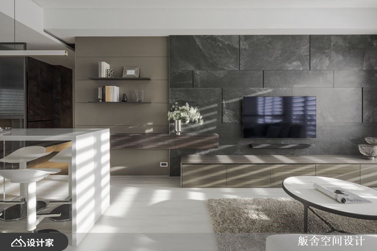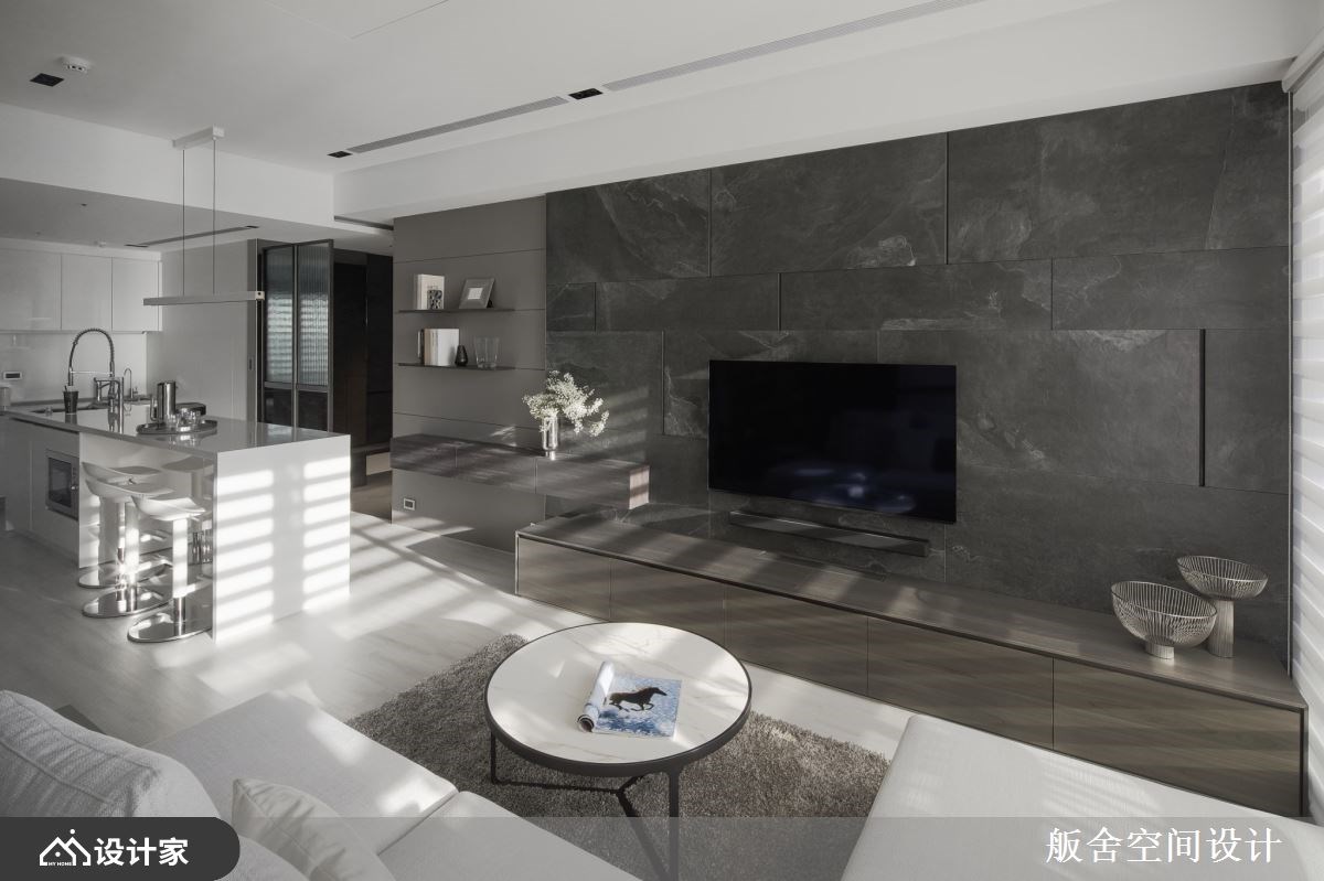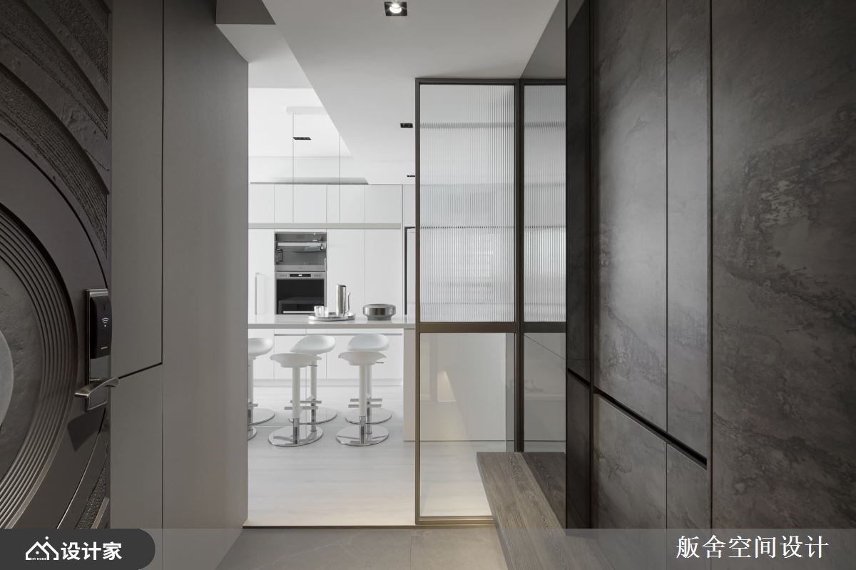 玄关规划穿鞋椅及收纳柜,强化玄关机能与舒适性,以长虹玻璃屏风界定场域,通透性佳若隐若现,开放式的公领域串联客厅、餐厅与开放式中岛厨房,并运用玻璃取代制式墙面与多功能和室区隔,视觉穿透放大,日光可由大面落地窗洒落居家各角落,空间以白色、灰色及温润木柜体为基调,烘托无压清新的居家表情,电视墙以板岩大砖挹注自然沈稳的调性,电视柜可收纳机器设备,一旁的墙面则以大地色规划展示陈列架,随心摆放收藏或书籍,型塑艺术气息的居家端景墙。纯白的开放式厨房增设长型中岛,扩增料理台面,也兼具餐桌的功能,电器柜沿墙面规划,立面整齐清爽利落,使用动线顺畅,美观与机能俱全。