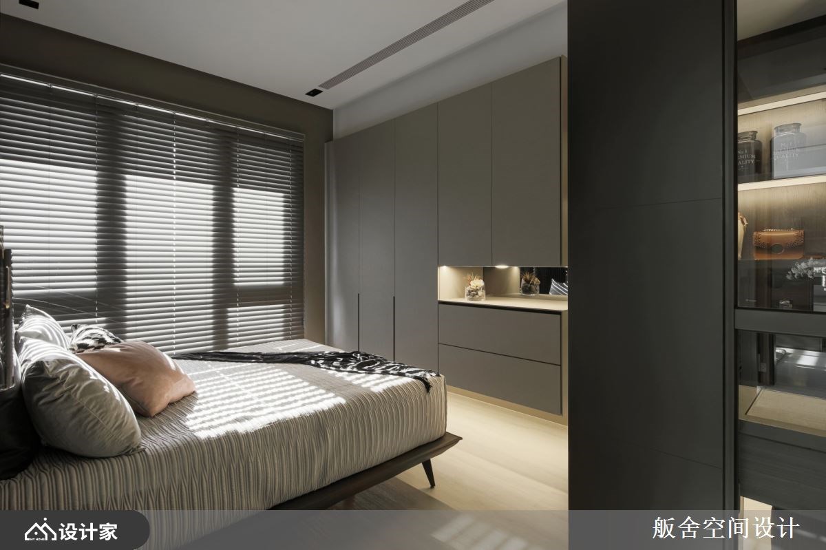 主卧以温润木地板及大地色悬浮柜体,围塑舒适的休憩场域,媲美饭店行政套房规格,包含睡眠区、包包精品展示与分离式主浴,赋予放松的专属空间。