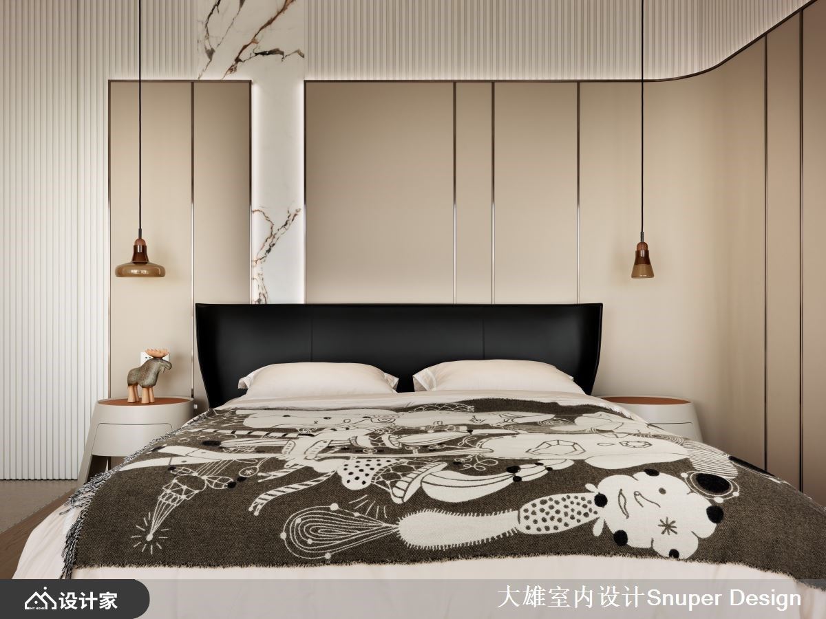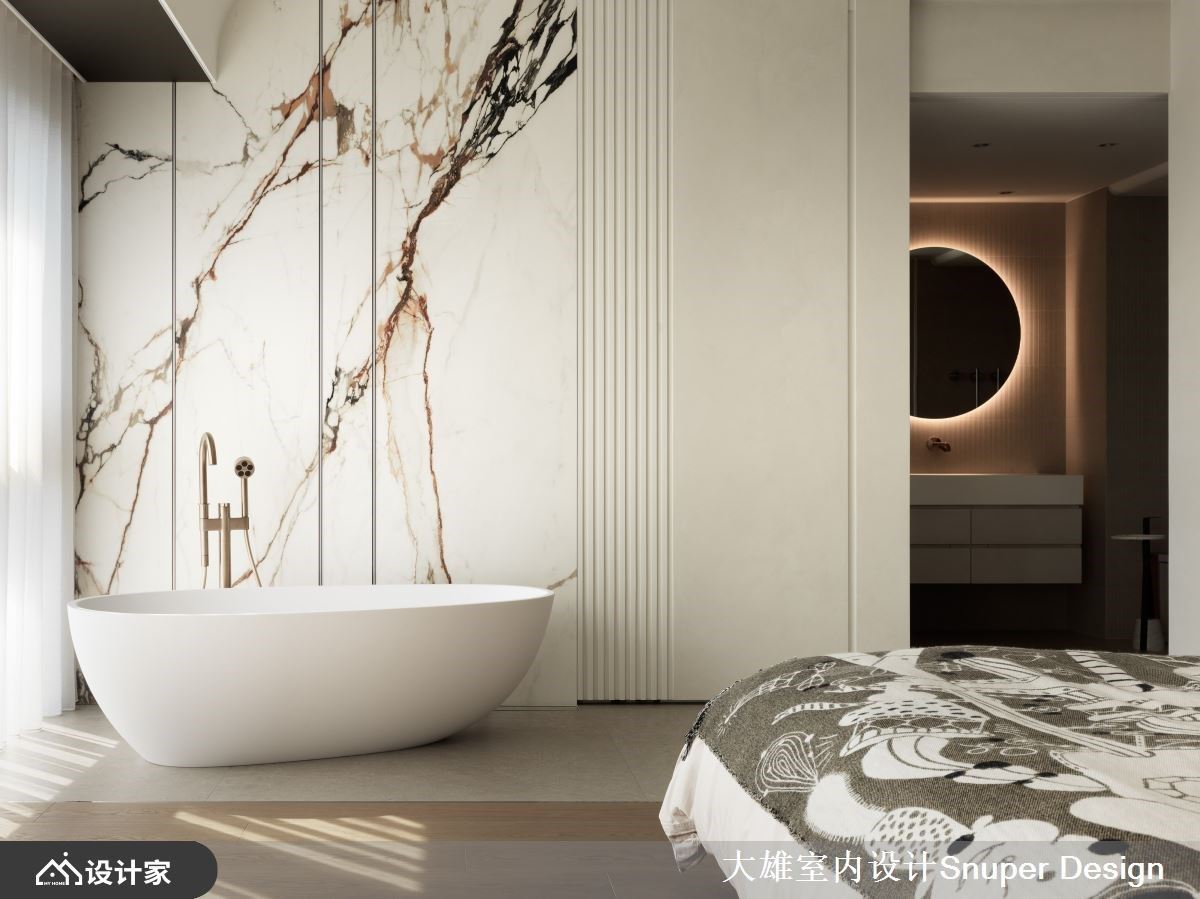 主卧延续公领域的温柔奶茶色,将床铺转向争取更好的视觉体验,同时打破盥洗空间的既定印象,将浴缸以物件式摆放融入卧房空间,细腻且鲜明的石材纹理也将女屋主的时髦品味表露无遗。