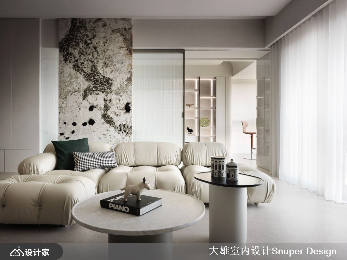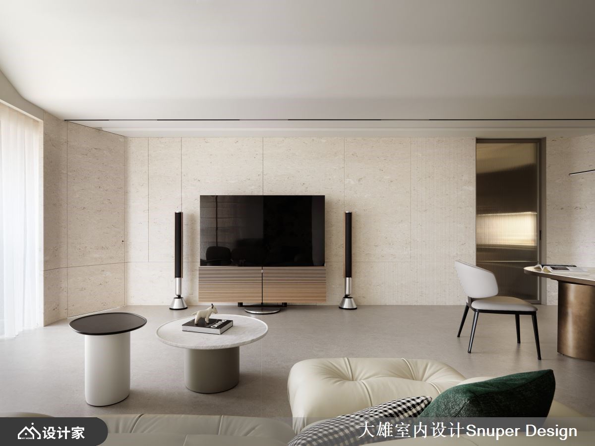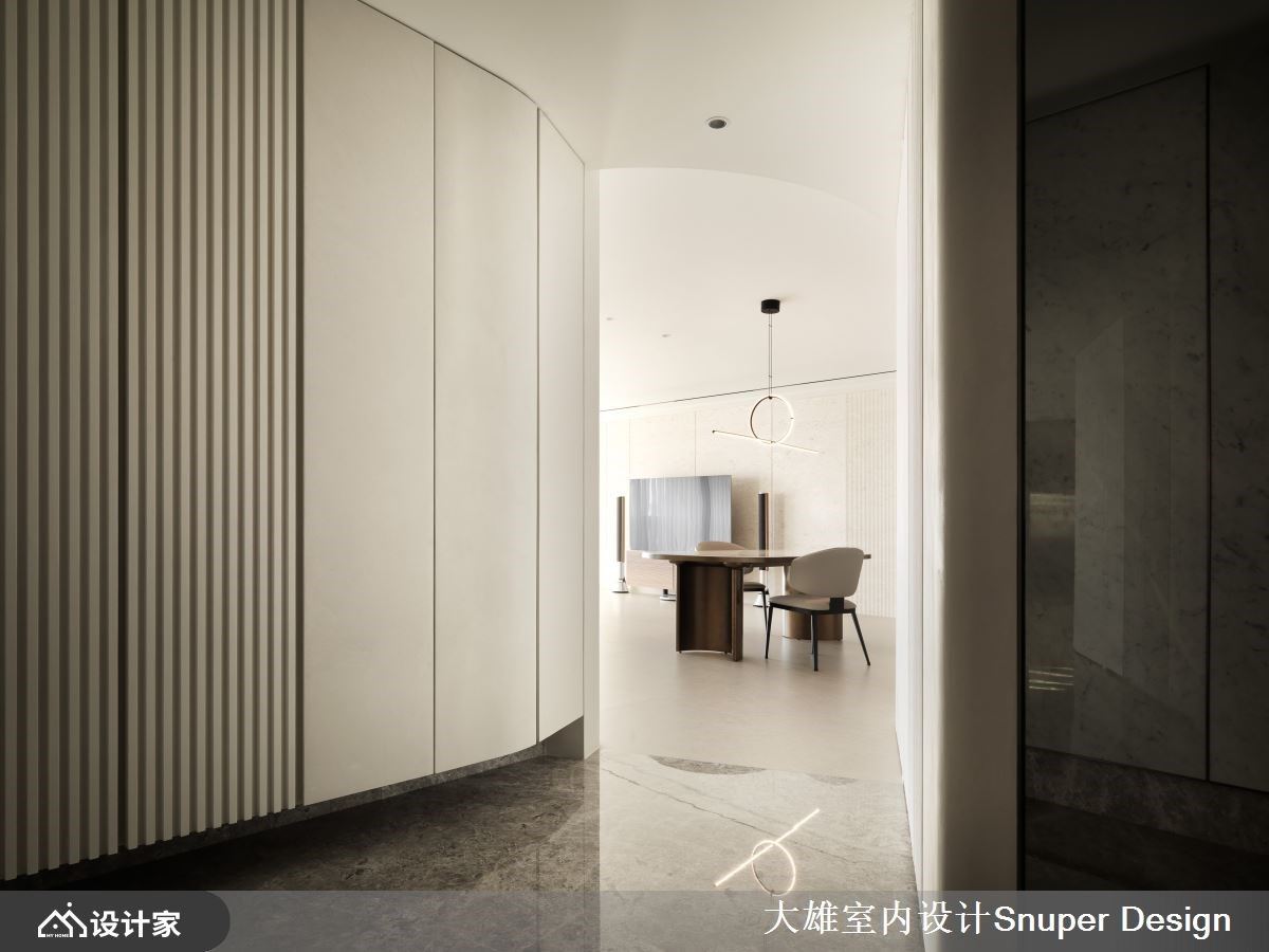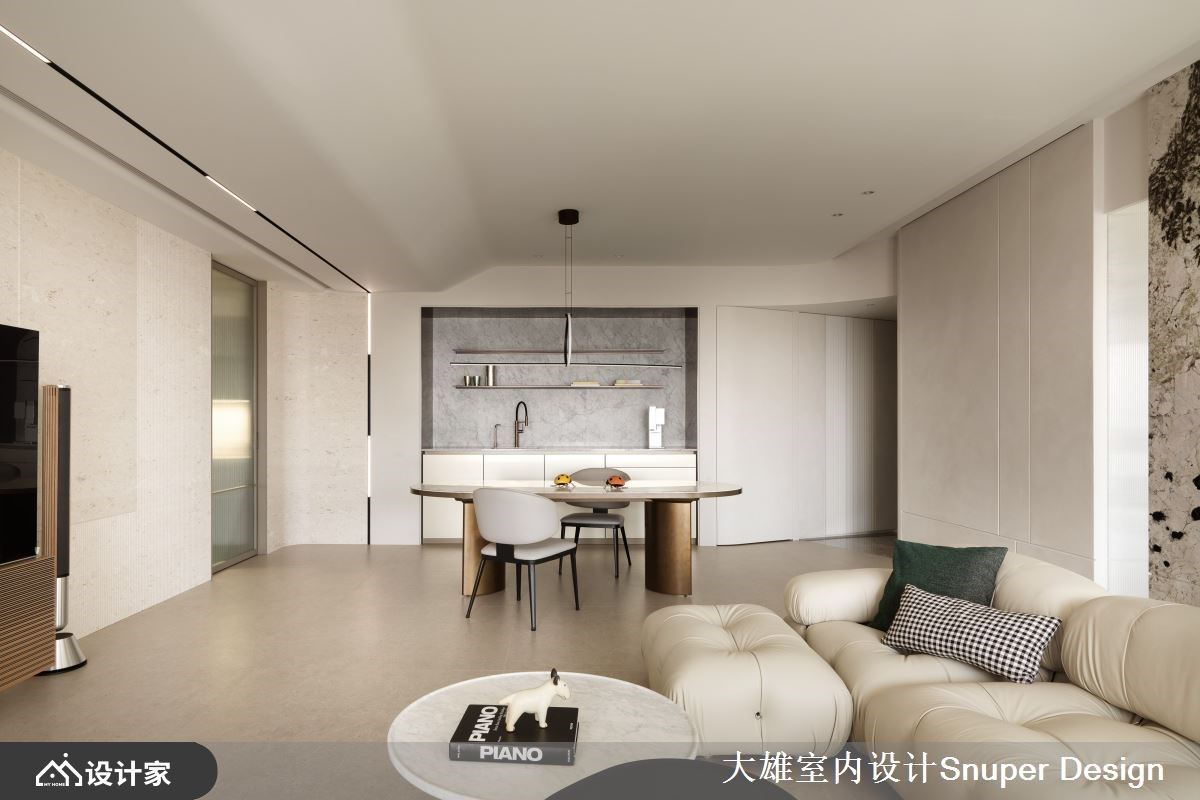 长年旅居国外的女屋主,希望能实现家不仅仅是栖身之所,更是展现自身品味的空间理念。大雄室内设计先是以2房2厅2卫格局配置,结合开放佈局与弹性隔间设计,打造都会女性独有的魅力居所,接著,揉捻细腻石材及温柔米色调,以俐落的设计语彙,于149平米空间内描摹时髦优雅的现代宅,生活的松弛感由此而始。 沿着玄关廊道步入室中,特意斜切45度的格局变化与沉稳的石材地坪,构筑归家的仪式感,接着,开放式厅区将大面窗景纳为视觉景深,大尺寸的米色系水磨石砖,使地坪呈现无接缝的延伸感,活动式软装定义场域分野,珊瑚洞石电视牆以俐落的切割线条,立面堆叠细腻的层次感,犹如女主人的优雅气质般;其次,多功能房与客厅以女屋主挑选的天然石材奢石,化作端景与分界,纳入多元的弹性拉门设计,虚化场域间的界线,更实现生活情境与心境的转换,而面临窗处规划小吧台区,檯面包复时尚皮革,搭配爱马仕橘色造型座椅,成为女屋主眺望窗外、放松心情的小角落;最后,餐厅立面设置精緻Mini Bar,特殊漆与铁件描摹视觉框线,149平米空间内每隅皆贯彻着生活美学。