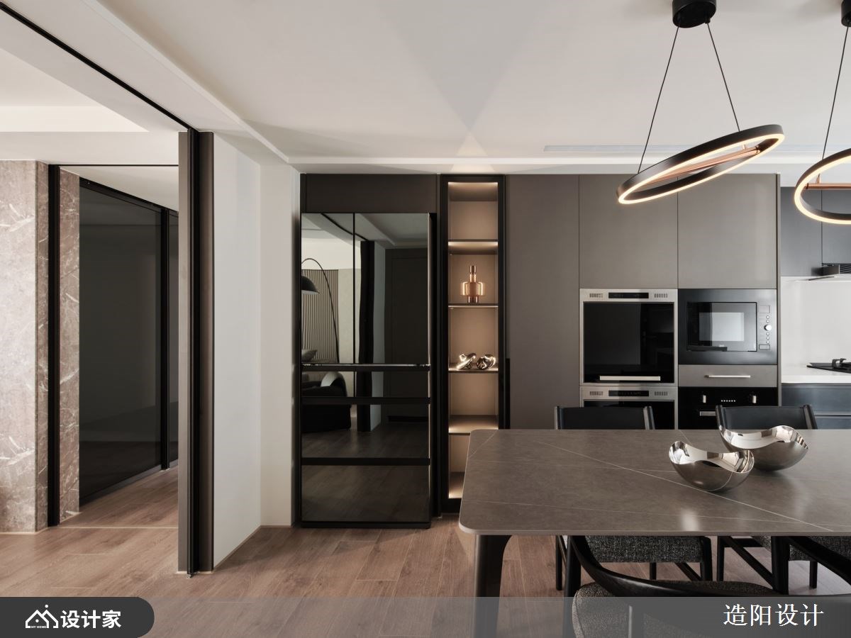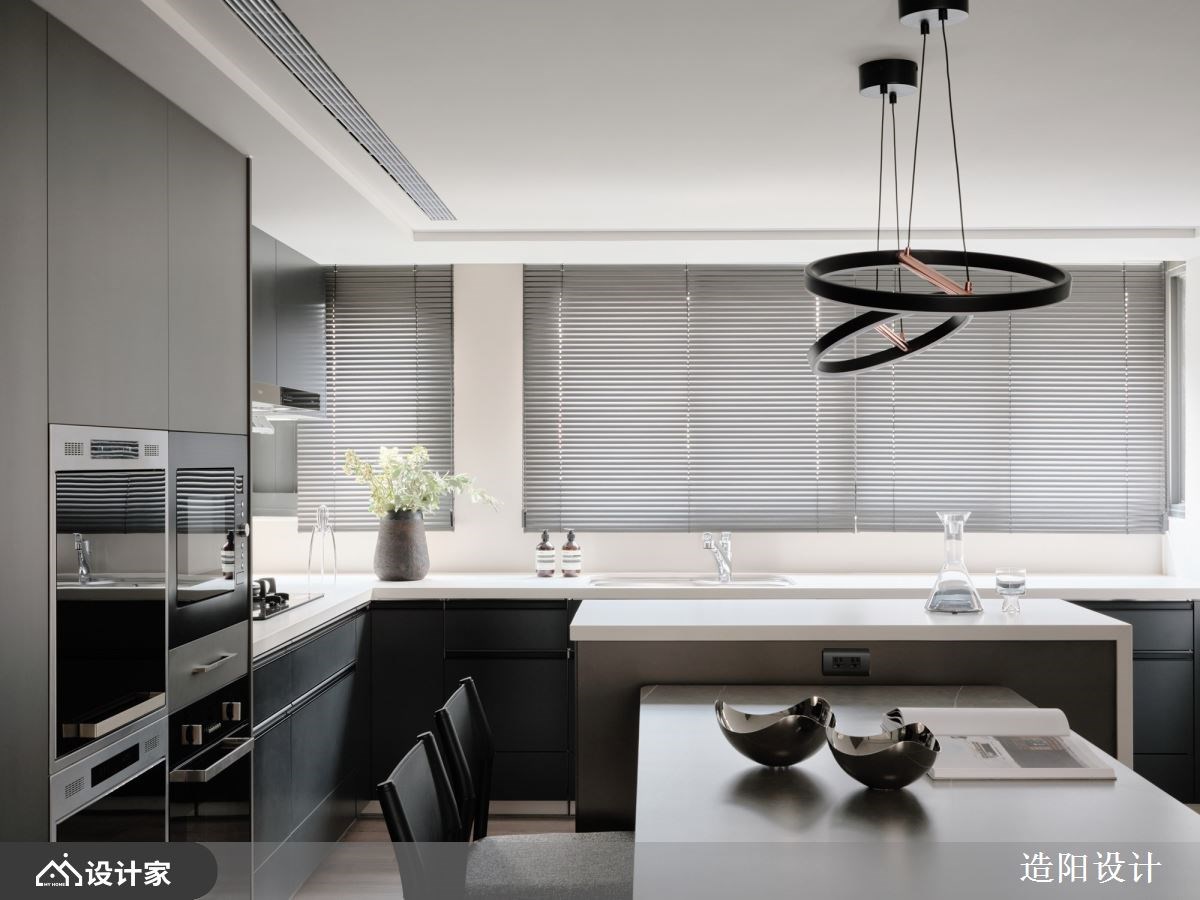 玄关保留整面采光,柜体设计最大化,可增强收纳机能,衣帽柜结合镜面,赋予开阔的空间尺度,明亮通透的玄关,犹如饭店迎宾玄关的大器气势。客厅尽可能拉高天花高度,利用高低层次搭配间接照明,使整体空间得以延伸。公领域以轻浅的色调,打造自然放松的场域,简洁利落的设计语汇修饰大梁,沙发墙后方配置大量隐藏式收纳柜,满足收纳需求,释放空间给宽敞的走道,引光入室提高明亮度,适时的留白设计,让空间拥有大宅应有的生活尺度。客厅与餐厨间用灰阶长虹玻璃区隔,巧妙化解入门见灶的风水疑虑,也让采光引入餐厨区,特别量身订制符合屋主使用习惯与尺寸的餐厨系统,L型厨房加上中岛及餐桌,塑造回字型动线,不论于此料理、聚餐、休闲或办公,都相当适合。