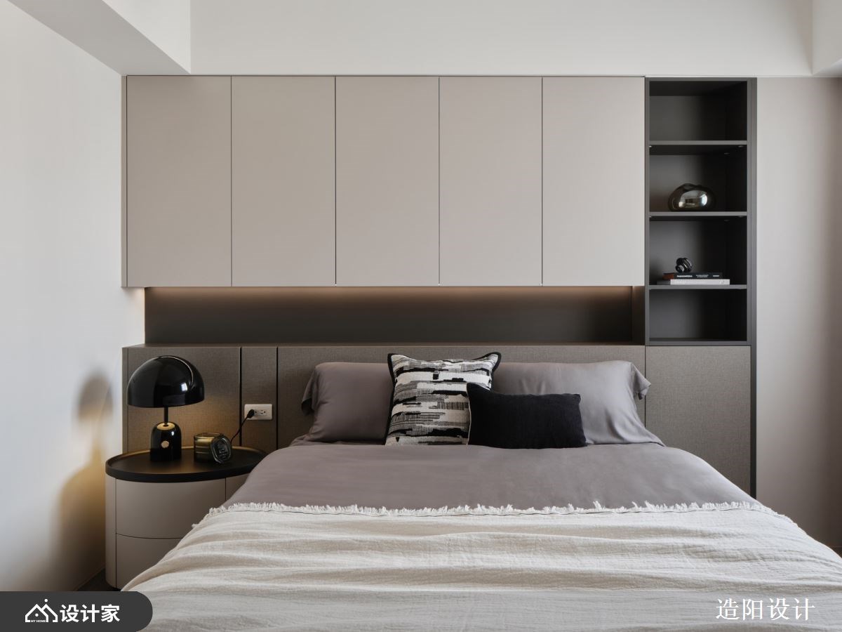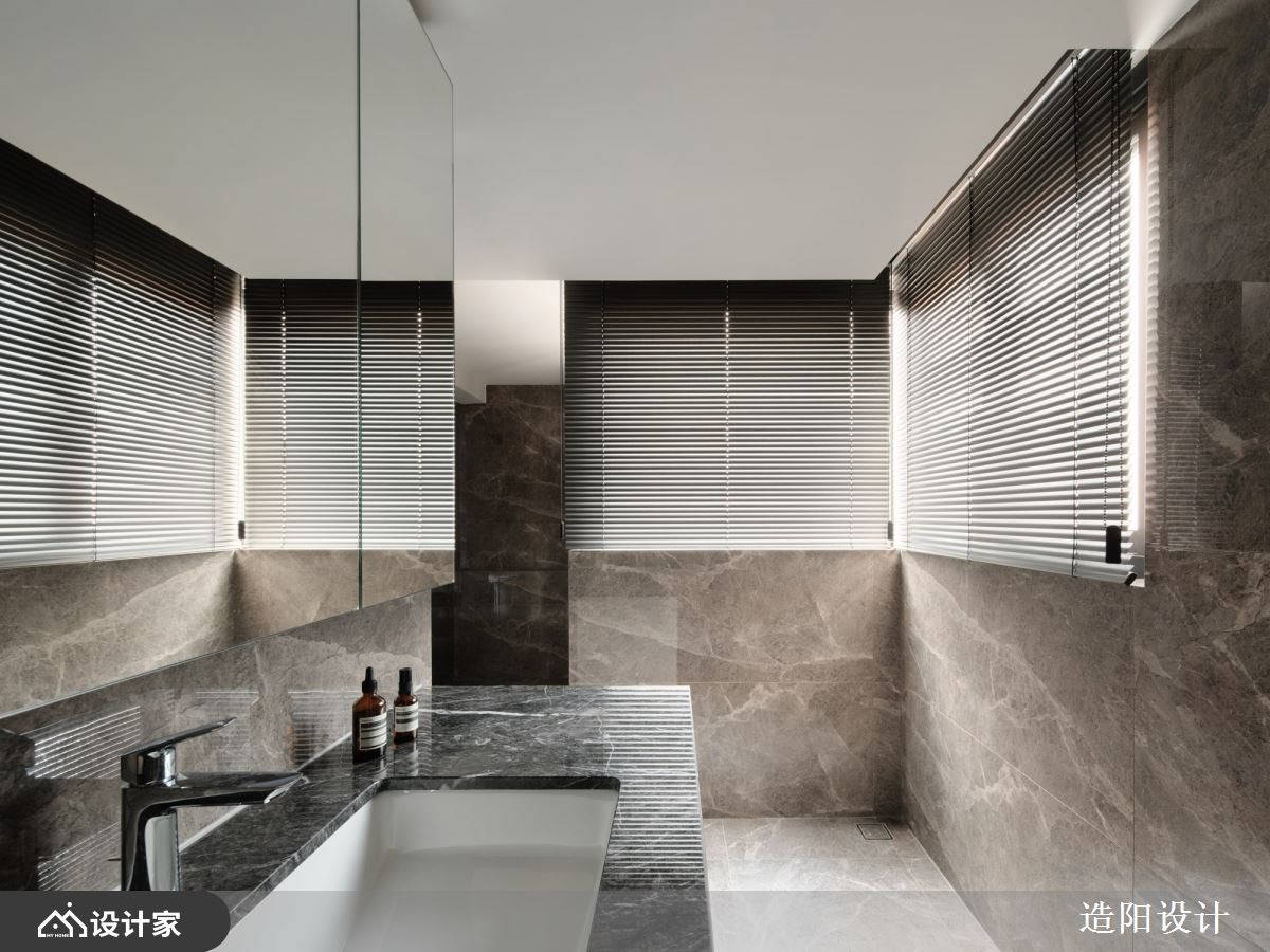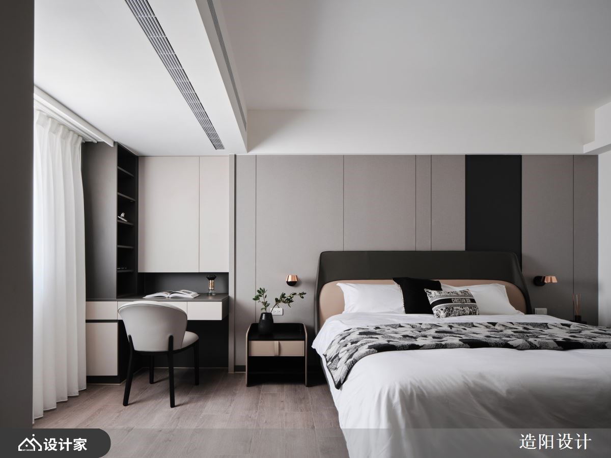 主卧延续公领域现代灰调的风格,微调格局扩大主卧的宽敞度,配置睡眠区、化妆桌、更衣室与卫浴空间,床头墙以简约线条勾勒丰富的表情,整合收纳机能的化妆桌,搭配隐藏式镜柜,美观与机能齐备。更衣室和卫浴空间出入口隐藏其中,增添视觉延伸感,主浴铺设大理石砖,传递低奢质感。原和室空间改为书房,也为未来育儿需求保留弹性。
