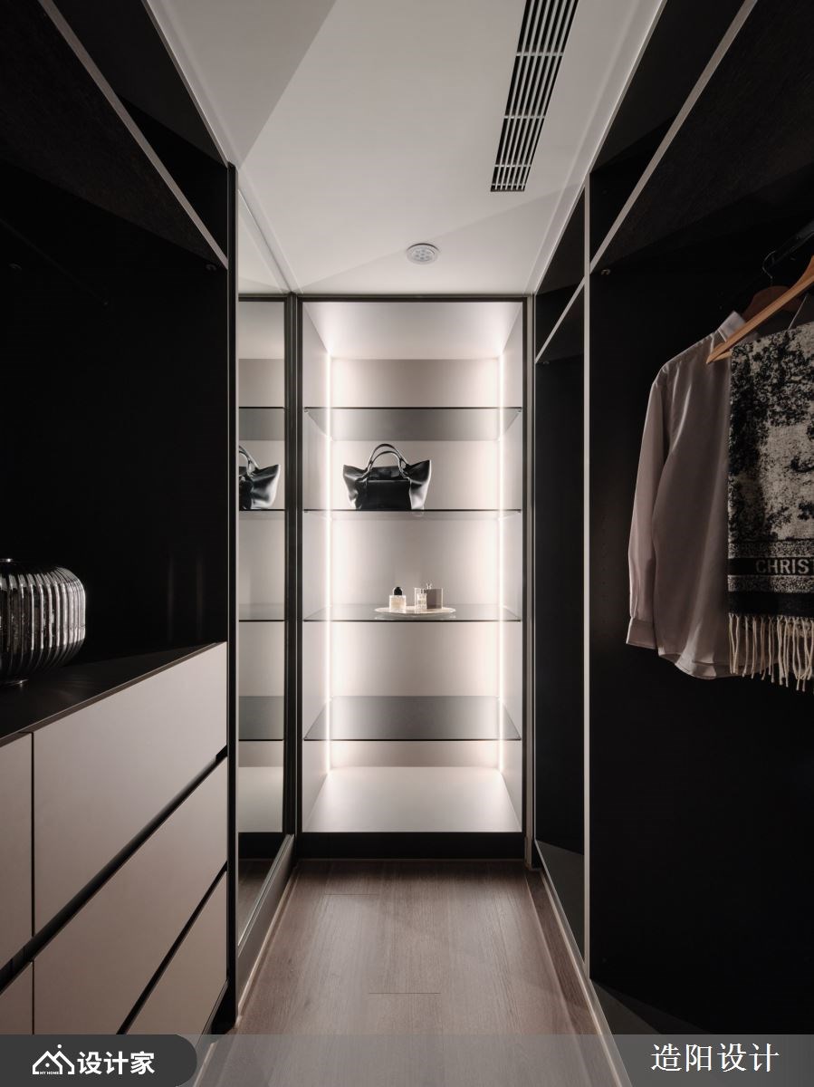 步入式更衣室结合吊挂、镜面、灯光与展示设计,媲美精品店的高级氛围。