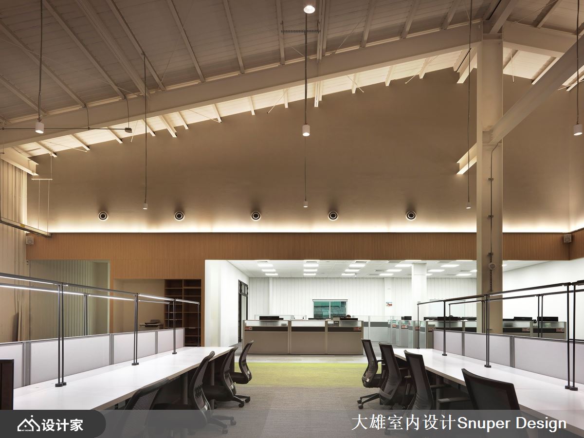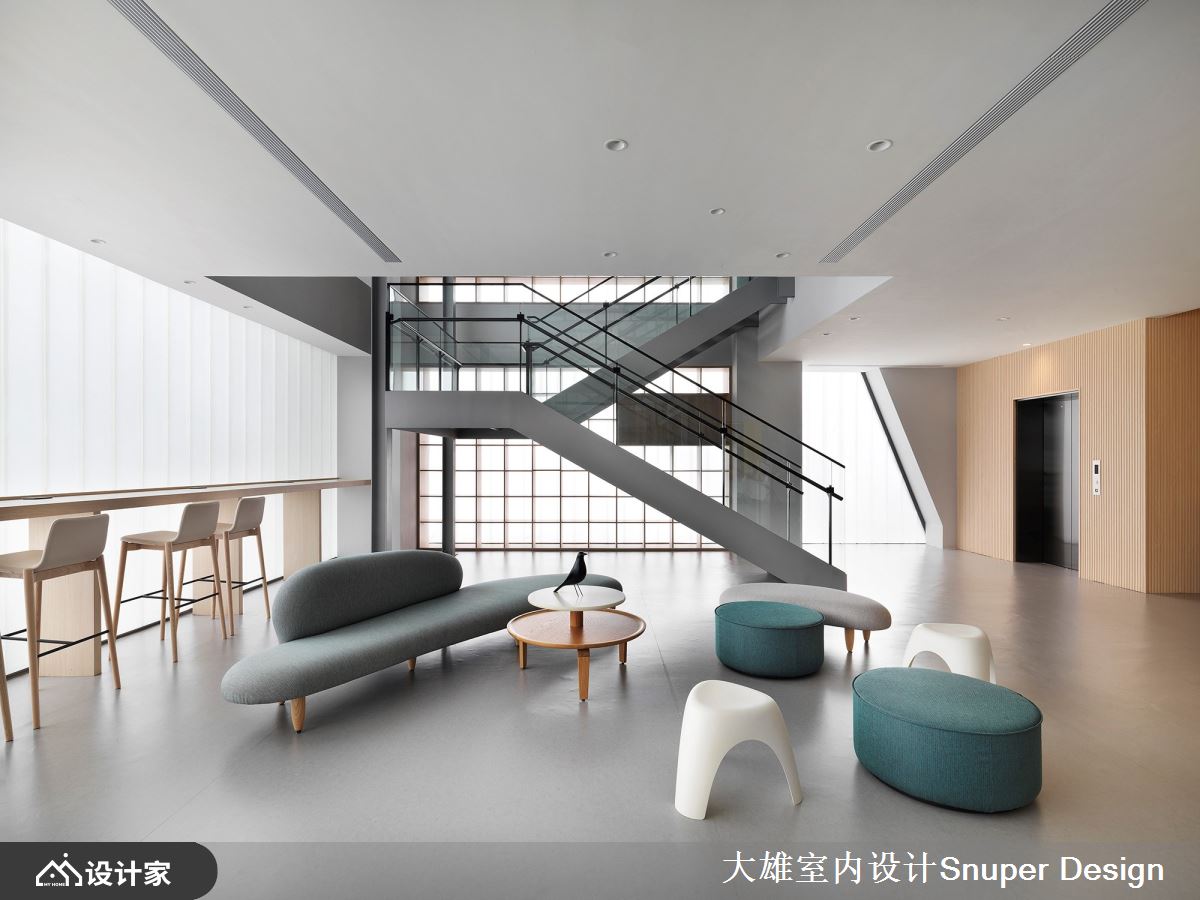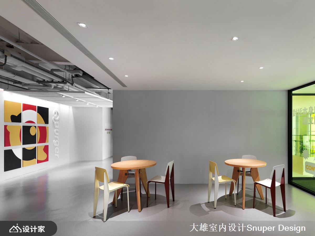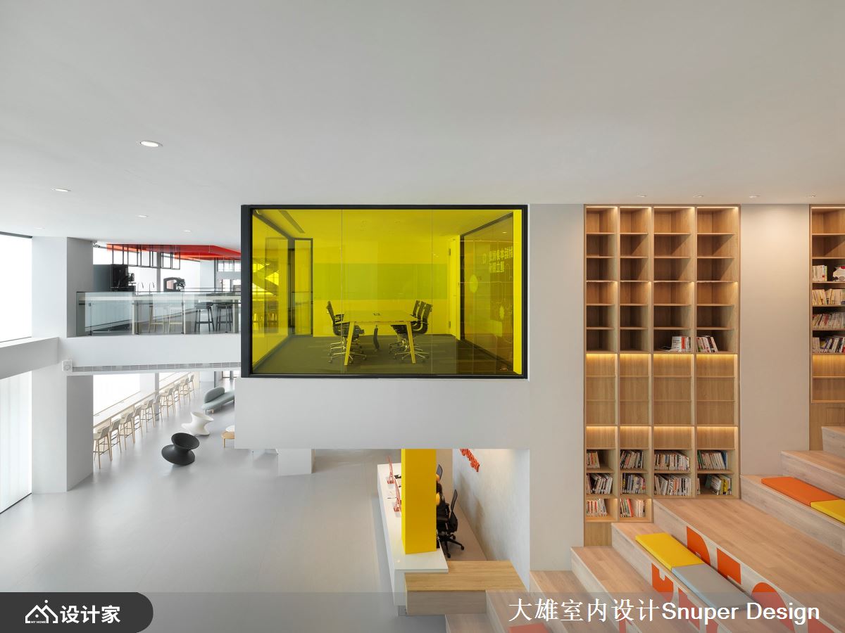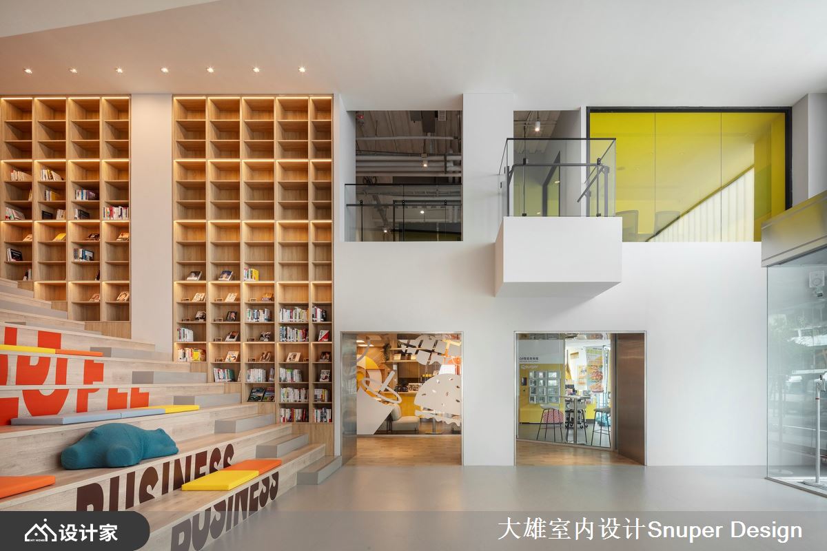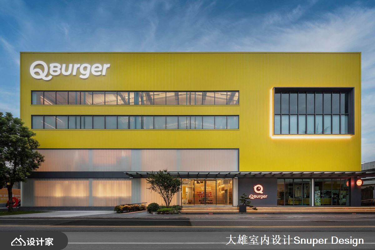 以「年輕人照顧年輕人」的理念出發,著名的連鎖餐飲品牌「Q Burger」全新營運總部,為廠辦融合的複合空間,透過舊建築的改造設計,重生為一座充滿標誌性、色彩繽紛鮮明的立體建築空間,賦予年輕朝氣的品牌印象! 在繁雜的三重街邊,佇立著一座充滿活力的鮮黃色建築體,令人眼前不禁為之一亮。進入大門後,巨大的階梯書牆成為迎賓的主視覺,使視野更加開闊大器,更串聯企業文化的「閱讀」主題。在挑高的大廳櫃台上方,置入了透明的黃色玻璃盒子,賦予開放自由的意象,亦弱化了沉重的結構量體。 二樓處營造了多元的座位形式,滿足接待交誼、輕食或工作的彈性需求,對外的牆面採用U型玻璃,迎入清新飽滿的自然光線,亦能阻隔街邊雜亂的視野。沿著鐵件樓梯向上,辦公區外規劃了迎賓沙發空間,透過混搭跳色和工業風格的天花設計,營造自由的工作環境。