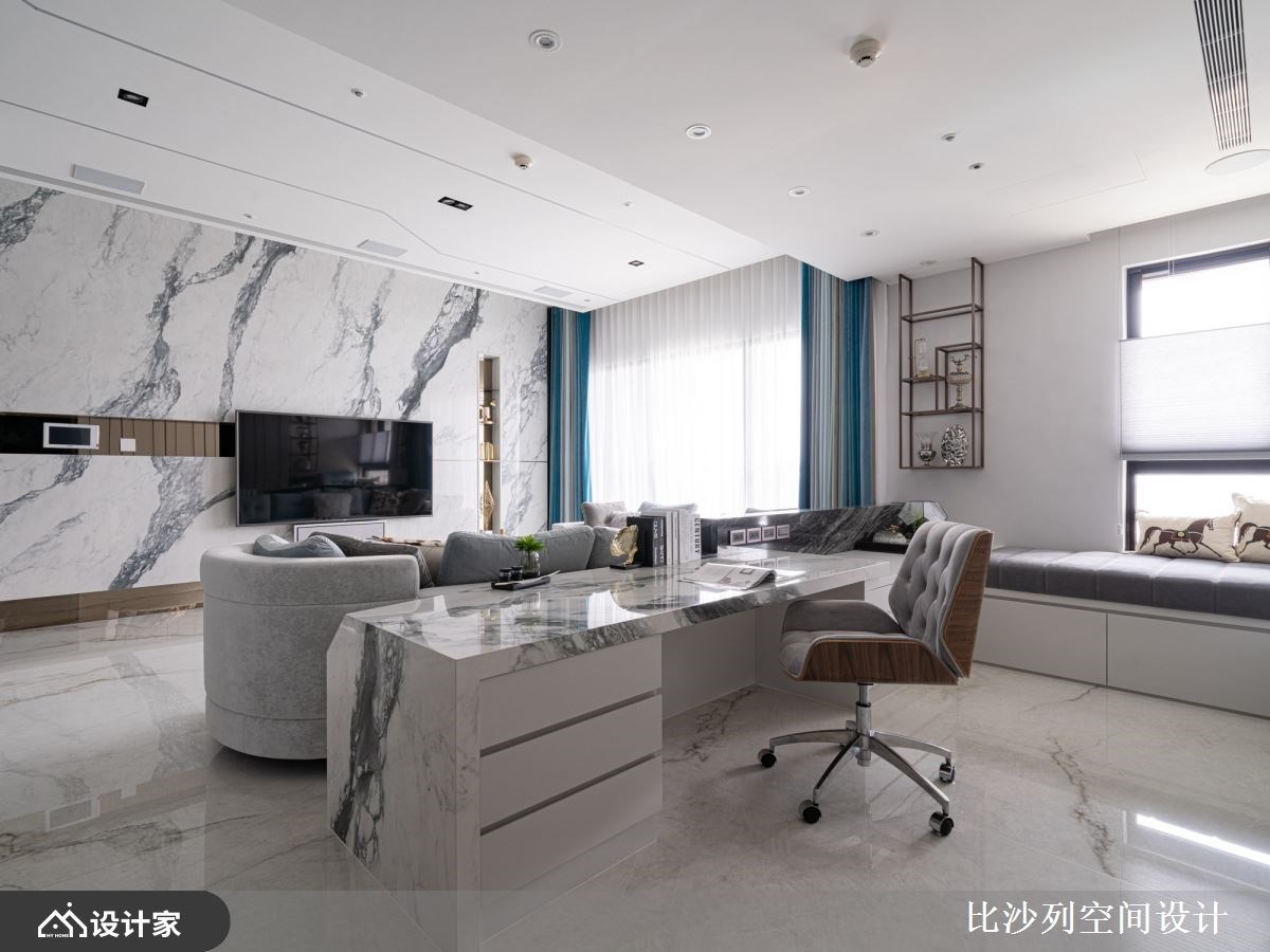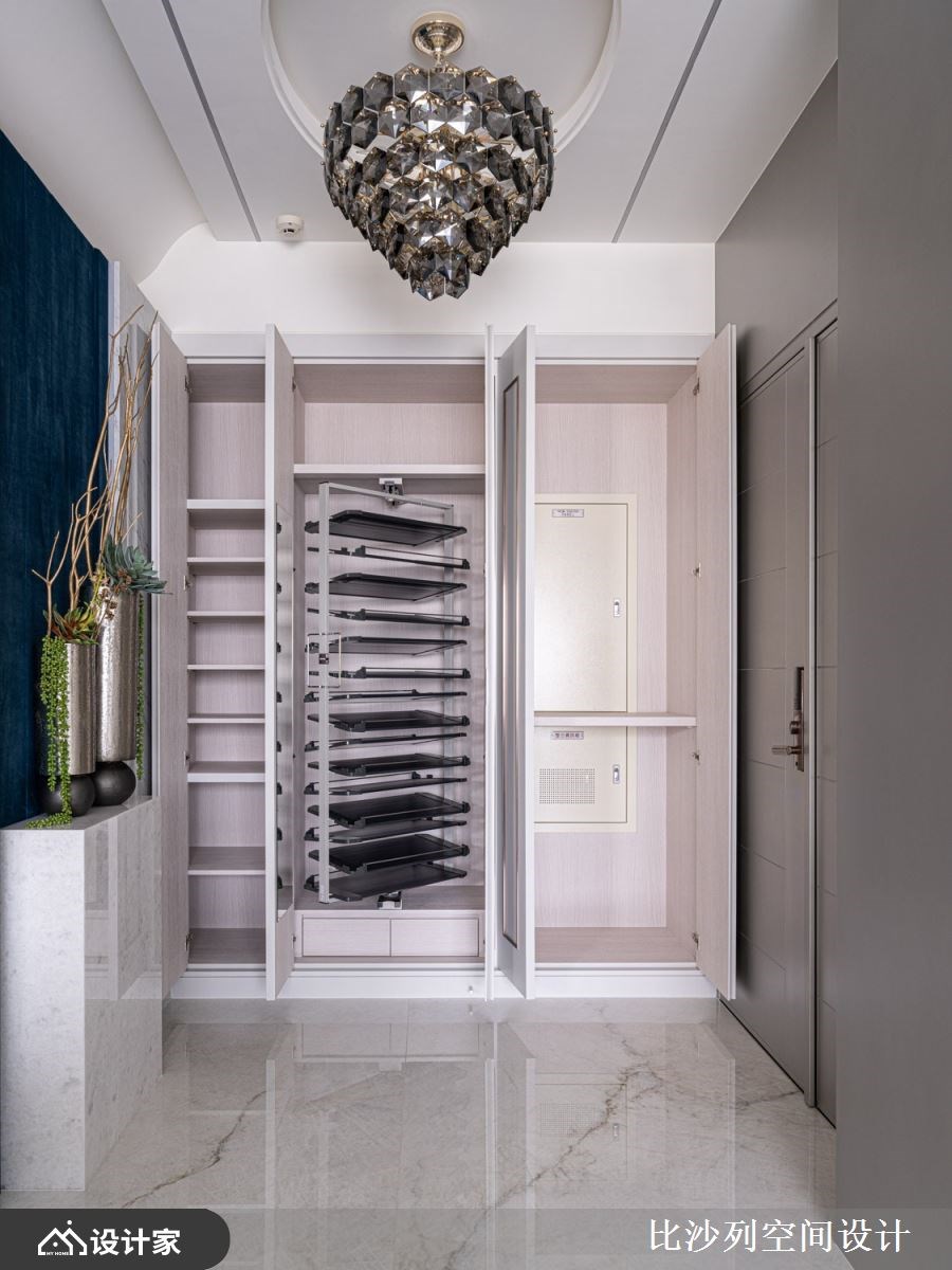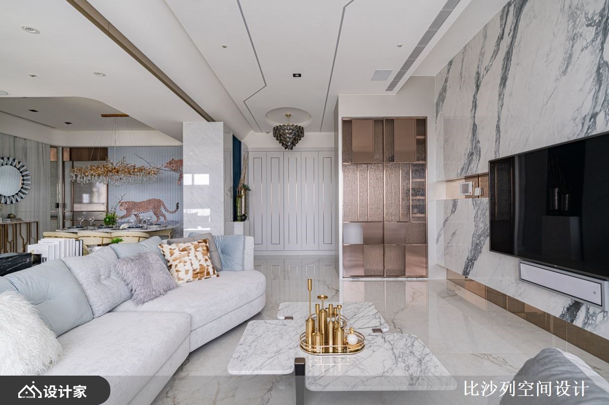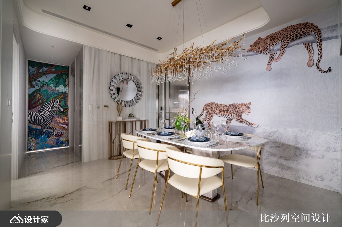 为提升屋主的生活品质,比沙列空间设计张静峰总监巧妙地将原有的 198 平米四房格局重新擘划,精心增设了步入式衣帽间与独立书房。将热带森林里丰富的色彩元素作为设计亮点,运用多元色阶叠搭石材、镀钛与温润木皮,勾勒出丰富的视觉层次。俐落的线板细腻点缀新古典语汇,并利用手绘壁画与植栽布置,共同交织出一场华丽的视觉盛宴,成就这座两房两厅的森林系奢华宅邸。 198 平米大的新成屋在风格上回应女主人对新古典的偏爱,以纯净的白色为基底,铺陈出弥漫森林气息的氛围,透过门片、吊灯等细节处挹注新古典元素,共同谱写出令屋主难以忘怀的生活场景。玄关处,绷布轻柔地作为端景背景,中央一方透光玉石静置其上并搭配雅致花艺,在 LED 灯的烘托下流露着细腻的风采。鞋柜以镀钛线板框构出时尚姿态,内部则巧妙结合五金配件,极大化鞋履的收纳机能。电视墙以大板砖拼贴而成,镀钛条的细致嵌合与砖面完美的对花纹理,共同彰显著非凡的气度。电视墙左侧则隐藏着储藏室,巧妙纳入机柜功能,透过镀钛与茶色玻璃推拉门的界定,为空间注入了温润而奢华的新意。开放式书房延续电视墙的大板砖材质作为书桌,其对称的纹理在表面肌理上流淌,尽显艺术之美。书房窗边规划了舒适的飘窗并善用架高地板的下方增添收纳,让屋主在工作疲惫之际,得以休憩并欣赏窗外景致。 餐厅空间则巧妙融入丛林与森林的灵感,墙面铺陈着手绘美洲豹图腾,搭配圆梯形餐桌与金色树枝造型的水晶吊灯,营造出独特的用餐氛围。餐柜底部以茶镜衬底,端景墙选用绿条纹的翡翠石材,与竹林的视觉意象相互辉映。镀钛材质的陈列架与威尼斯镜作为背景,加之走廊端景处的斑马丛林图腾,让人仿佛置身大自然中。