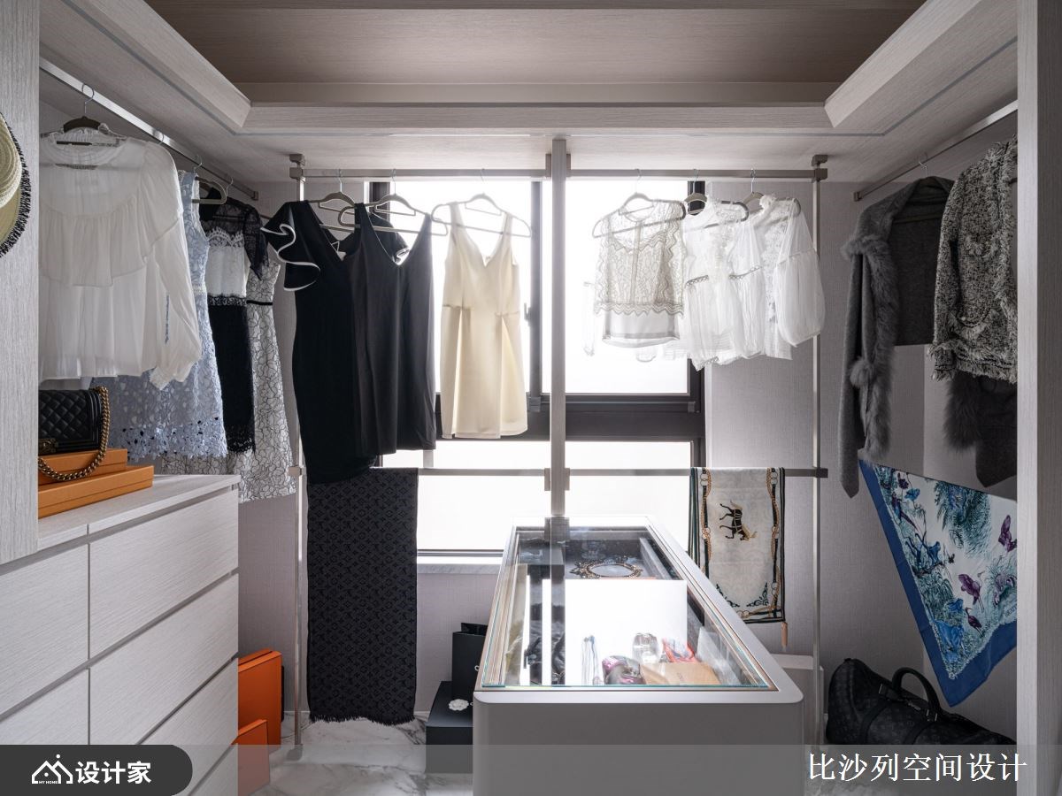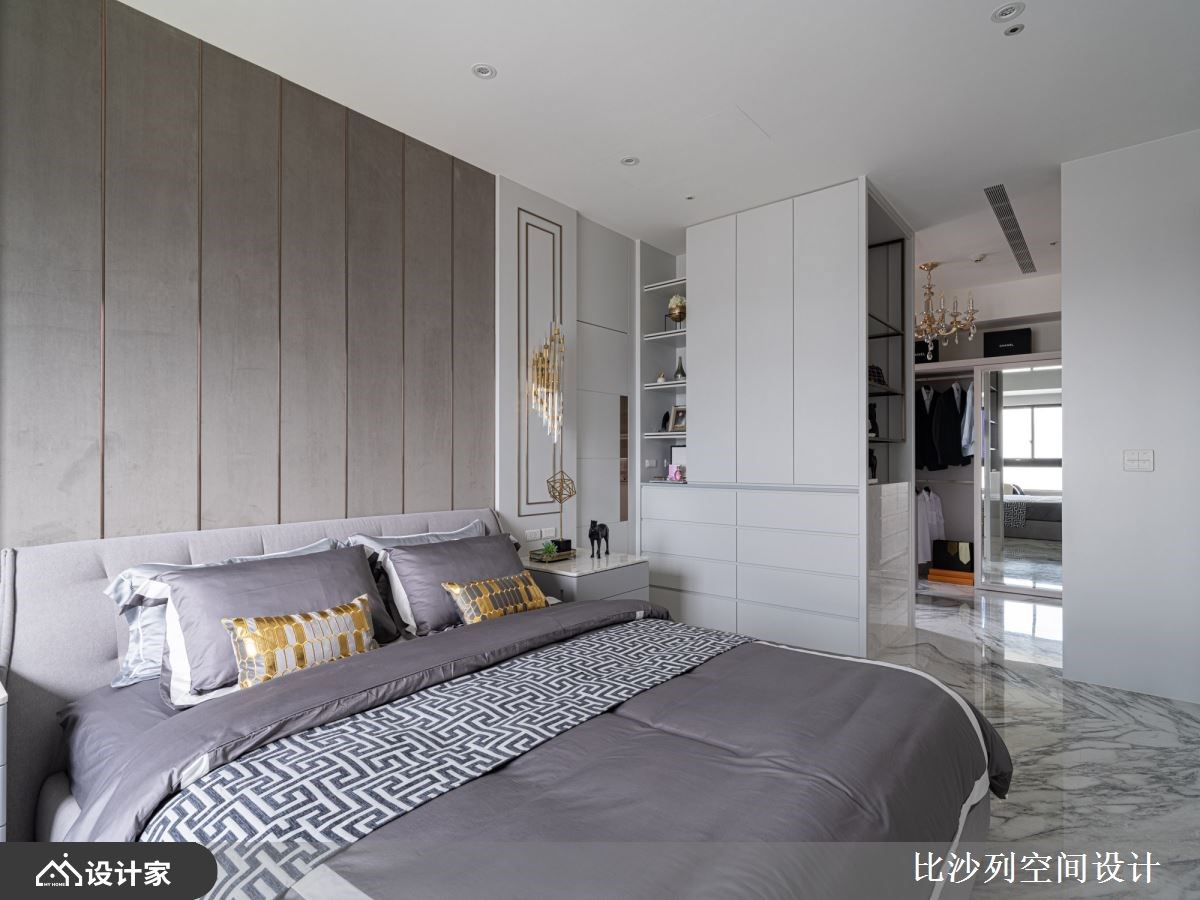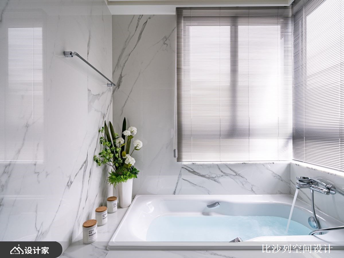 主卧室弥漫着奢华气息,床头以对称的新古典壁板为基底,两侧饰以雅致的对称壁灯。独立更衣室内除了完善的衣物收纳,更透过镀钛层架陈列包包等精品配件,珠宝柜则精心收藏与展示首饰,伴随柔和灯光照明,流露出时尚的精品风采。主浴则以造型水晶吊灯提升精致度,墙面铺陈仿雕刻白的大面砖,内嵌式浴缸位于转角L型双面采光窗,营造出能沐浴日光泡澡、舒适的浴室氛围。