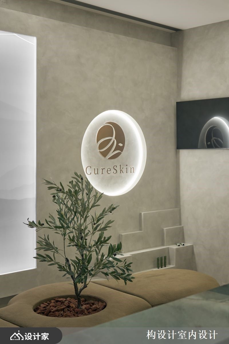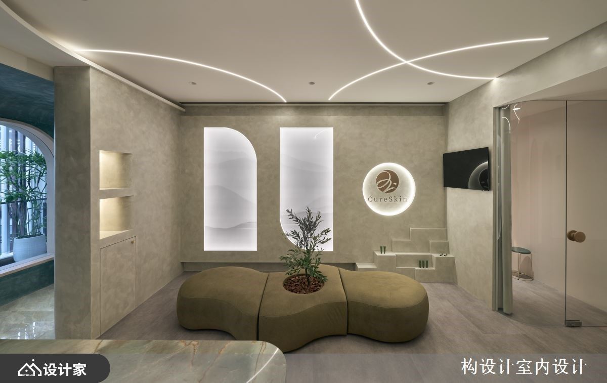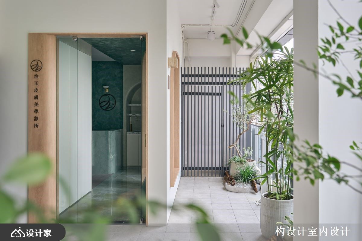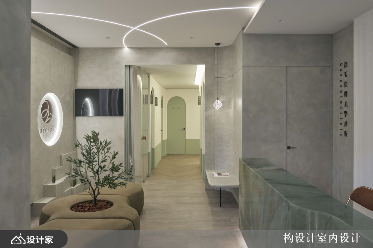 位于台北市文山区的治玉皮肤美学诊所,为一处仅有单面採光的毛胚屋空间,业主期待跳脱传统医美诊所的冰冷感,打造出具有品牌识别、温润舒适的疗癒场域。构设计 杨子莹总监以「流畅动线×顾客体验×强化品牌」为三大主轴,不仅依照商空需求完善各区配置,更以顾客的情绪感受为题,打造出一处让人愿意放松、停留的美学诊所。 首先,从改善採光与动线着手,设计师将入口处原有的落地窗改为固定玻璃,并延伸窗框作为穿鞋平台,立面的橄榄绿色艺术涂料,与灰绿色彷玉石磁砖地坪相搭衬,低彩度色系不仅呼应了品牌Logo的主色调,亦烘托出诊所温润放松的氛围,而廊道底端的理石茶水柜,不仅化身入室后的第一个端景,更满足了柜檯人员的接待需求。其次,诊所柜檯以奢石凋琢而成的流线造型,搭配间接光源提升视觉层次,形塑诊所内吸睛的目光聚焦处。等待区则摆放弧形订製沙发,考量人性化动线,避免与柜檯正对,也让顾客可随心挑选座位,中央搭配绿植营造如庭院般的惬意氛围。 最后,廊道以拱门造型搭配跳色牆面,化解L型格局的狭长压迫感,同时于转角处配置两间谘询室,以玻璃弧形隔间界定,并加装布帘供弹性使用,不仅满足诊所的视觉窗景,更增加了顾客谘询时的隐私感,于小节处体现对消费体验的重视,展现诊所专业之馀也保有温暖人心的贴心设计。