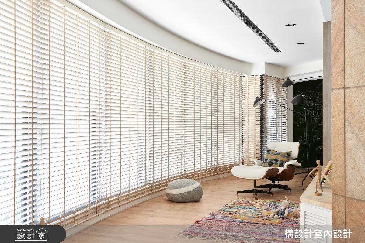 游戏间的设计语汇延续整体调性,选用浅色木质材质呼应公领域氛围,搭配大面积木百叶窗帘,不仅有效化解栋距过近的尴尬视角,也能随时调整光线强度。设计师特别利用黑板漆,规划一面涂鸦墙,让孩子们可以肆意挥洒创意。同时这里既是孩子尽情玩乐的天地,也成为女主人阅读、放空的小角落,互不干扰却彼此相伴,诠释出现代家庭的多重共处样貌。