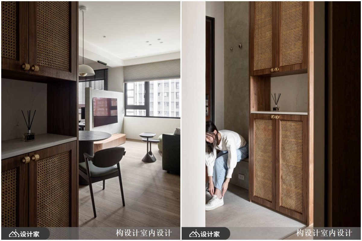 1. 玄关: 原本客变后的格局并没有玄关空间,进门直接就是客厅、一旁为一字型厨房。利用木作与实木贴皮打造出隔间墙,玄关空间收纳机能,沿着与餐厨区域共用墙规划,以特殊漆铺叙立面,创造带点侘寂氛围的穿鞋空间;连接的玄关柜采取顶天落地设计,最大化收纳机能。实木皮铺贴柜体,柜门则选用藤编材质搭配,呈现简约自然的肌理层次外,也能增添鞋履收纳柜的透气性。另一侧维持立面简约保持廊道宽度,铺贴穿衣镜修饰了电箱亦玄关放大空间,建构出精巧舒适的落尘区。