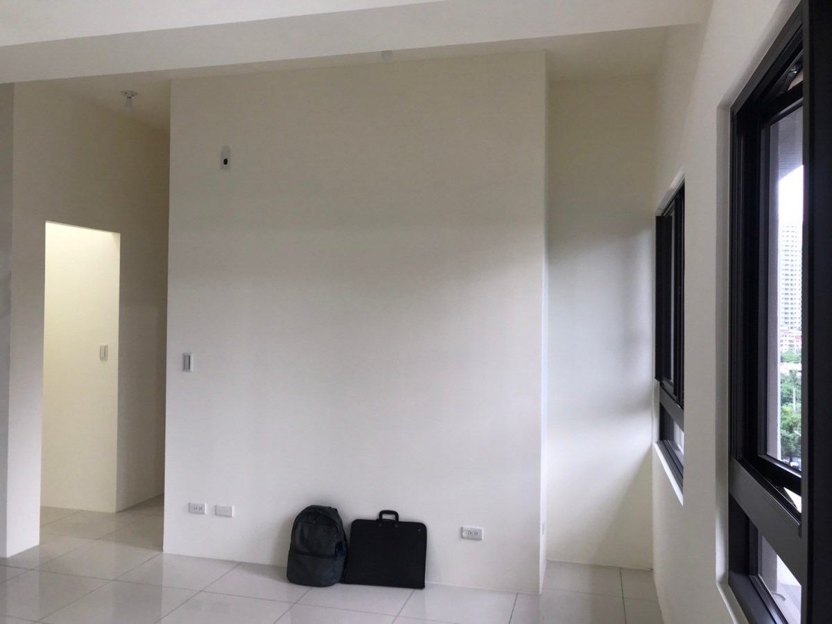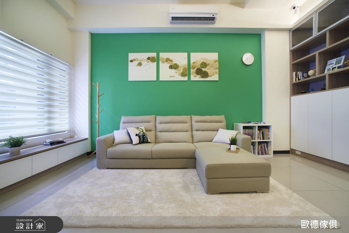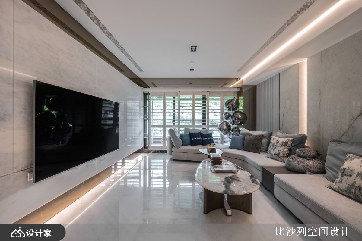 2.客厅空间: 原始的长型客厅空间并没有适合的电视主墙,且天花板横越的大梁对公领域带来压迫,设计师在客厅采光窗之间,打造一座带弧形的电视半墙,自定义电视墙创造最佳观影尺度,也不会阻碍到任何采光窗,最大化自然光利用。电视墙延续特殊漆的运用,搭配实木皮电视柜;天花板经过修饰后弱化大梁的存在,重新梳理天地壁后呈现舒适宽敞的空间氛围。