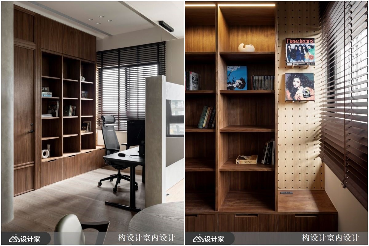 3.书房空间: 电视半墙后方的空间规划成半开放式书房,半高电视墙正好替书房带来隐私,能让办公时更为专注的,隔绝纷扰却又不过于封闭。后方以木作订制整面收纳墙面,结合格柜、抽屉柜与洞洞板的多元收纳机能,让日常收纳成为家中端景。实木皮的运用也整合了居室入口,透过材质的延续与变化,创造出机能连续面与断点,呈现出有序的空间设计。