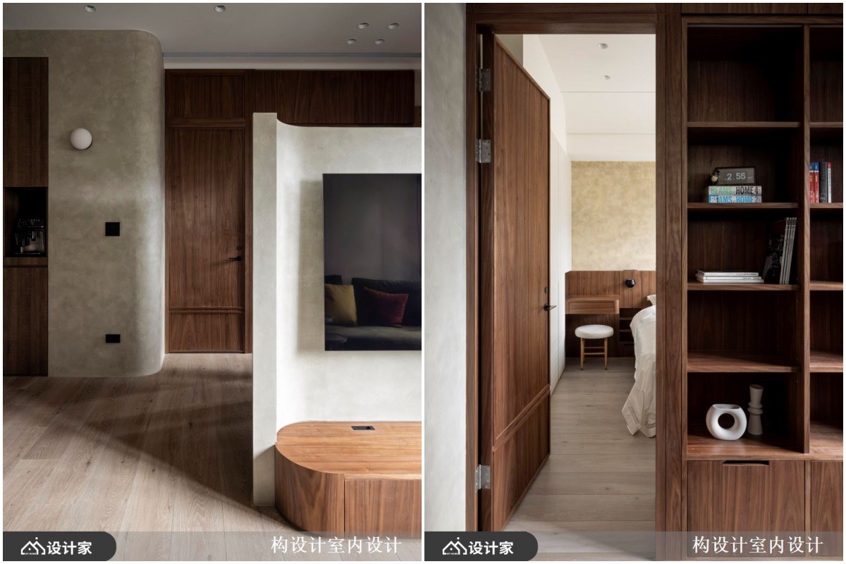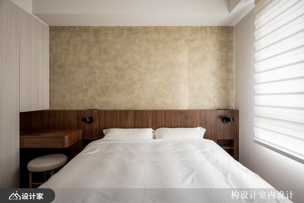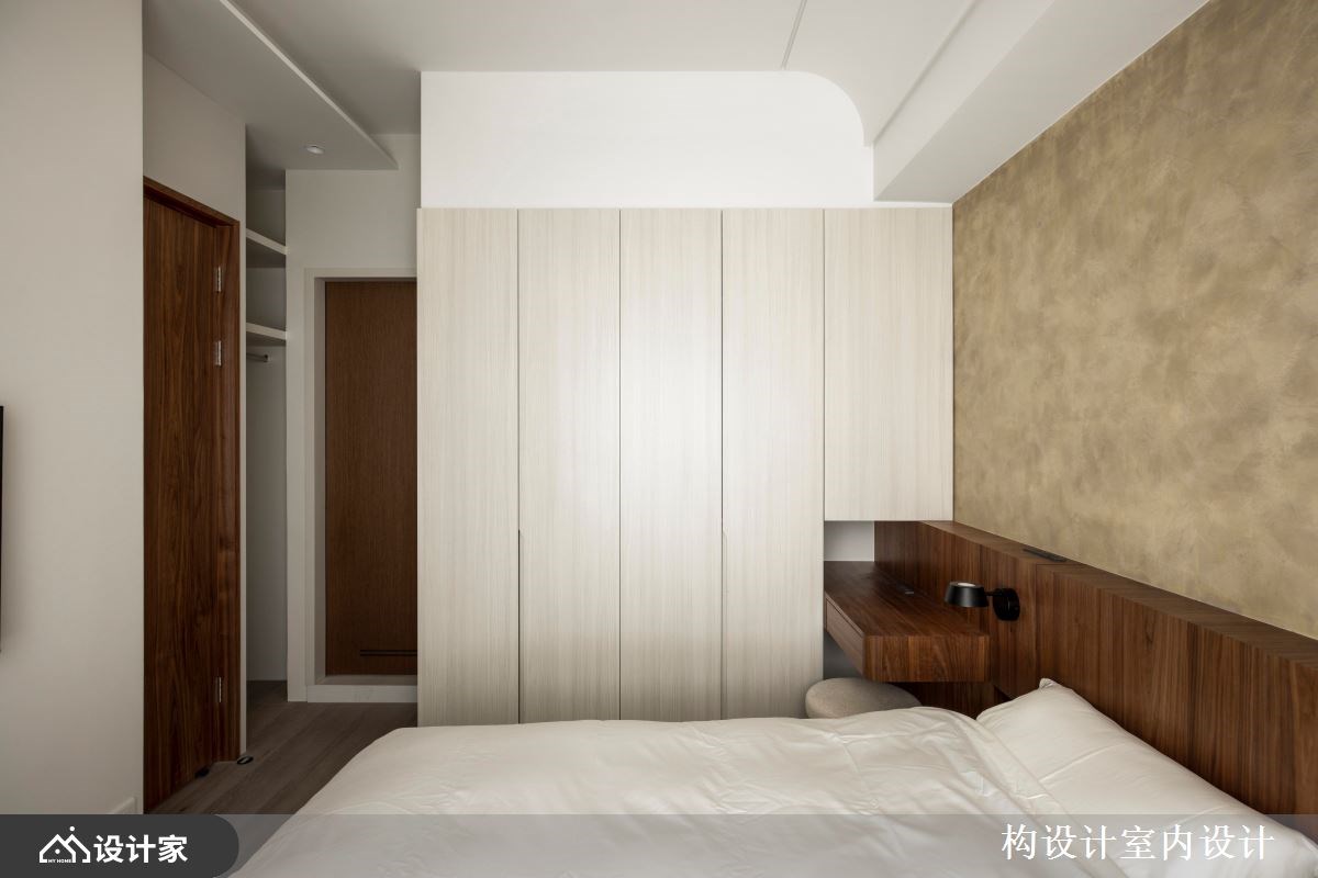 5.居室空间: 原始格局中主卧与客房比例悬殊,透过对调并调整隔间尺度后,两间客房呈现均衡的空间比例。主卧延续公领域的材质与色彩搭配,床头特殊漆呈现自然质朴的纹理,床头板沉稳的实木皮与化妆桌相连,延展床头尺度更呈现出整体性。以壁龛收纳取代传统床头柜,不仅舒缓单侧走道,也更显简约俐落感。变更主卧开门方向与隔间墙微调后,创造更舒适的格局规划收纳柜,化妆台以订制系统柜打造海量衣物收纳区,天花板做了弧形设计化解梁压床的风水疑虑;另一侧的畸零空间则打造成开放式污衣柜,将衣物收纳分门别类增添生活仪式感。
