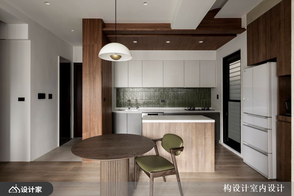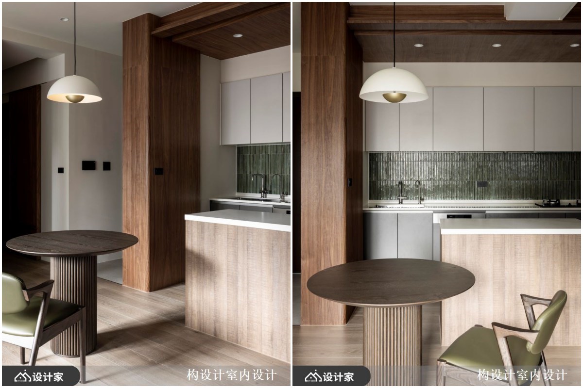 4.餐厨空间: 厨房格局为全开放式设计,客变后重新规划格局、以柜体结合墙体的概念界定出落尘区与厨房空间,实木皮由柜体延伸到天花板的包覆式设计,透过材质在开放式空间划分出餐厨区域。保留建商配置的一字型厨具,但在防溅板铺贴复古细长形马赛克砖,墨绿色磁砖和实木呈现出些许现代复古氛围。新增一座小中岛扩充料理台面外,更创造顺畅的回字动线,串连料理与用餐空间。餐桌选择沉稳的木纹圆桌,搭配橄榄绿皮革餐椅与厨房磁砖相互呼应。